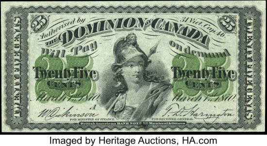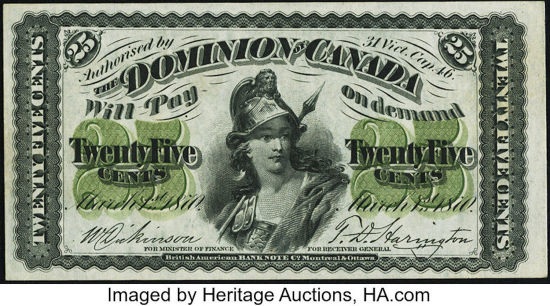dispatched from Ontario and Quebec to the other provinces. In 1870, the first Dominion of Canada notes were issued in denominations of 25 cent, $1, $2, $500 and $1000.