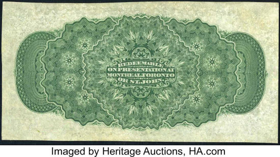 While the front of each note is identical, the back of each note states which city the note could be redeemed in (Montreal, Toronto, St. John, Halifax or Victoria)