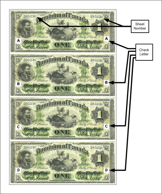 New collectors might assume that the printed numbers found on Dominion of Canada banknotes are "serial numbers". This is not the case. Most notes were printed in sheets of ten notes each (25 cent)