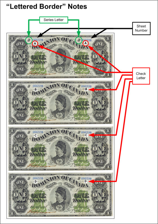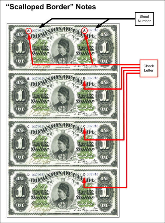 These notes were printed in sheets of four, with the same sheet number printed on each note. The Check letter is located at each end of the "DOMINION OF CANADA" curved text in the upper centre of the face.