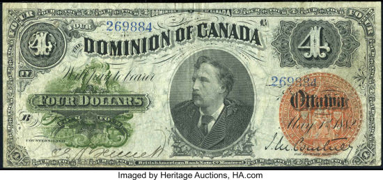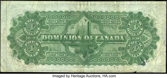 The $4 note was the first time Canadian banknotes were printed on watermarked paper: The words DOMINION OF CANADA on two intersecting bands,