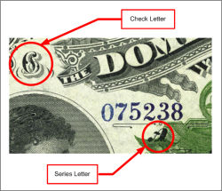 With the "Scalloped Border" 1 dollar notes as well as all 2 dollar notes, the Check letter is located to the left of the sheet numbers.