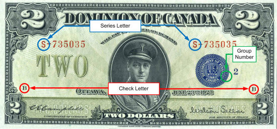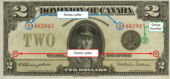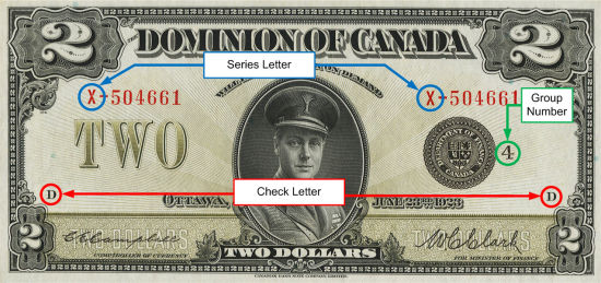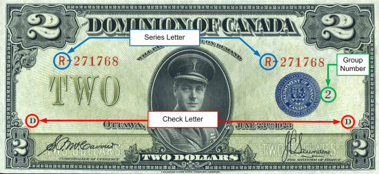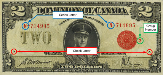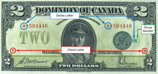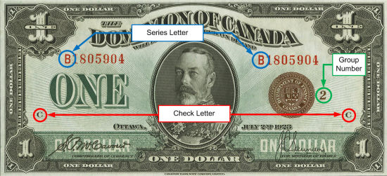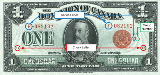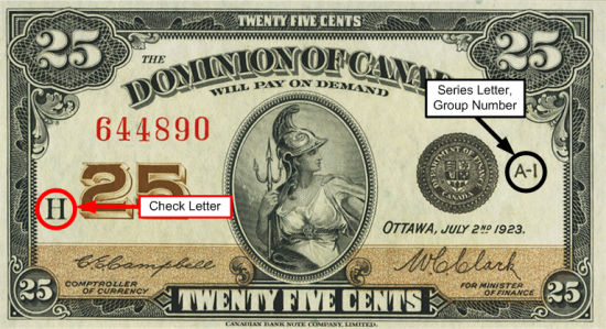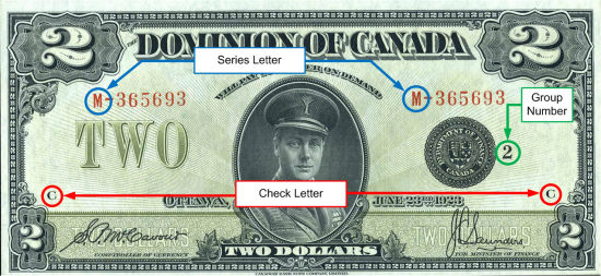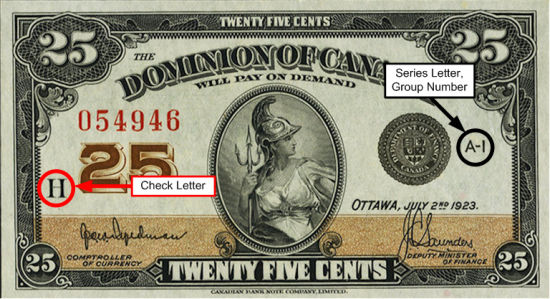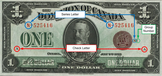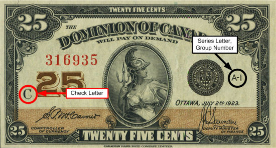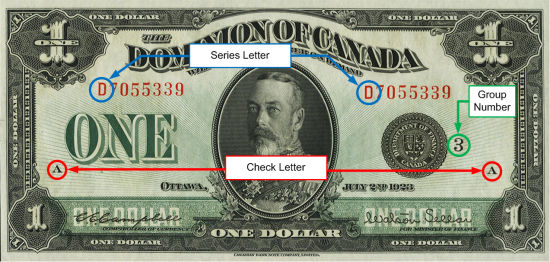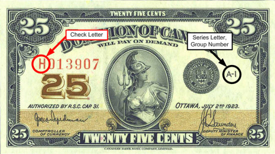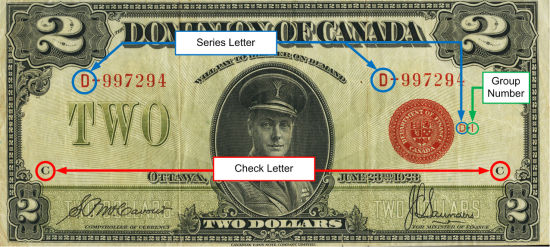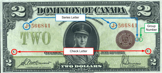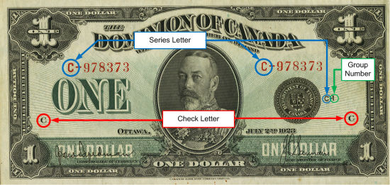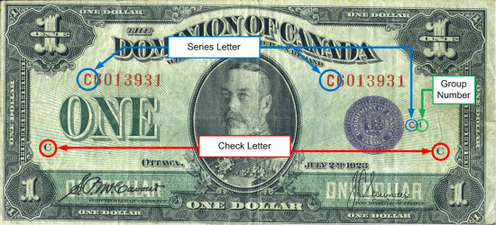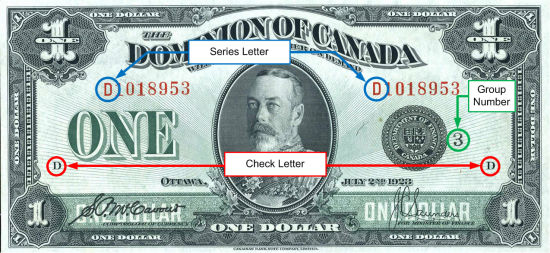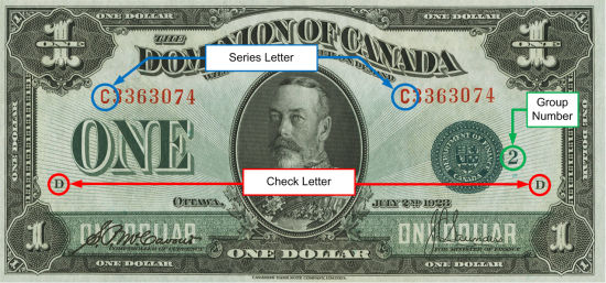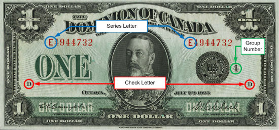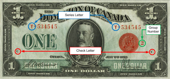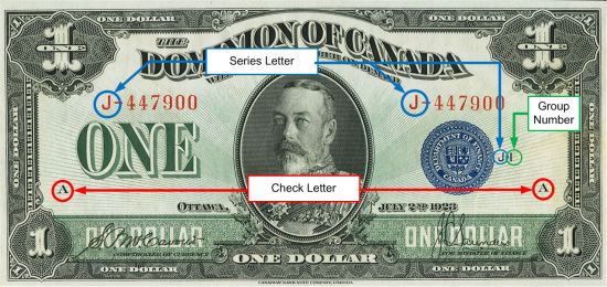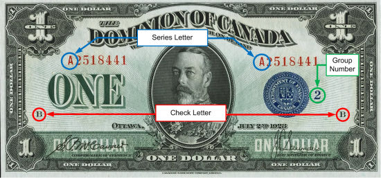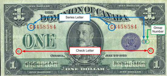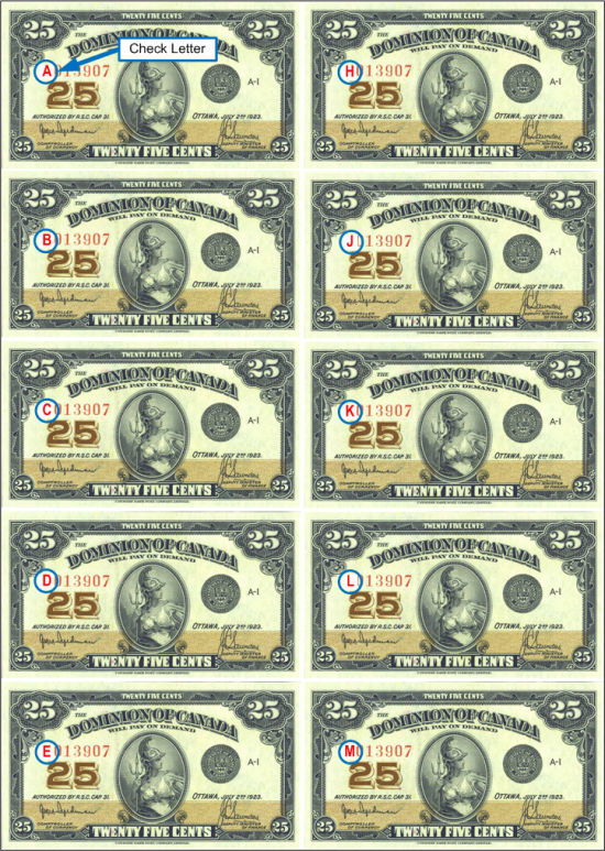 New collectors might assume that the printed numbers found on Dominion of Canada banknotes are "serial numbers". This is not the case. Notes were printed in sheets of 10 each (25 cent notes)