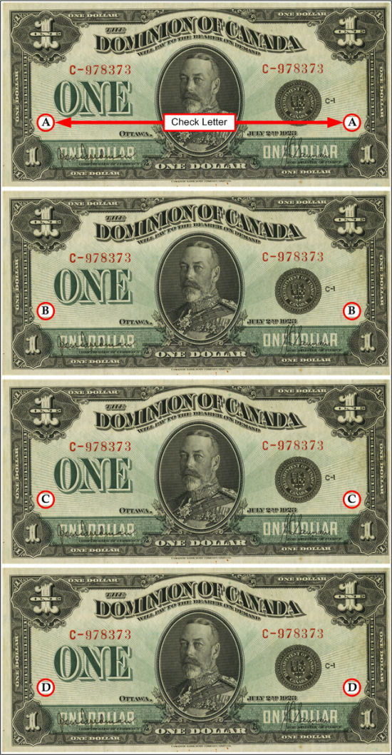 All other denominations were printed 4 to a sheet, with Check Letters A, B, C or D as shown below: