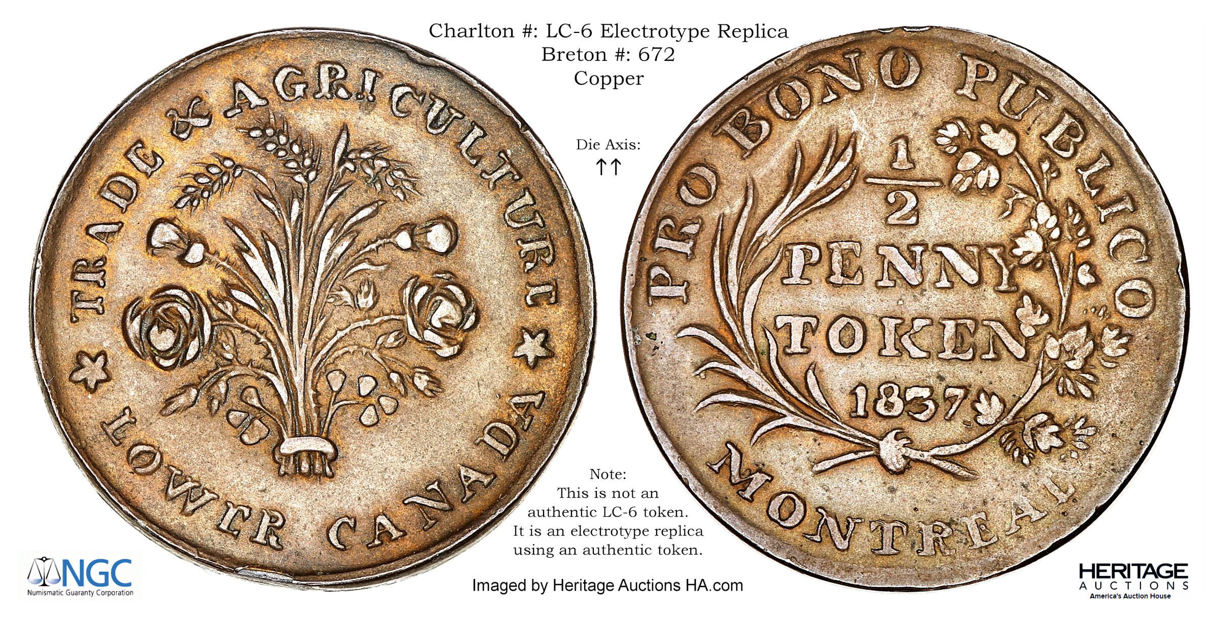 Rev: PRO BONO PUBLICO / (Wreath with palm leaves on the left and cherry leaves on the right) / 1/2 PENNY TOKEN 1837 / MONTREAL