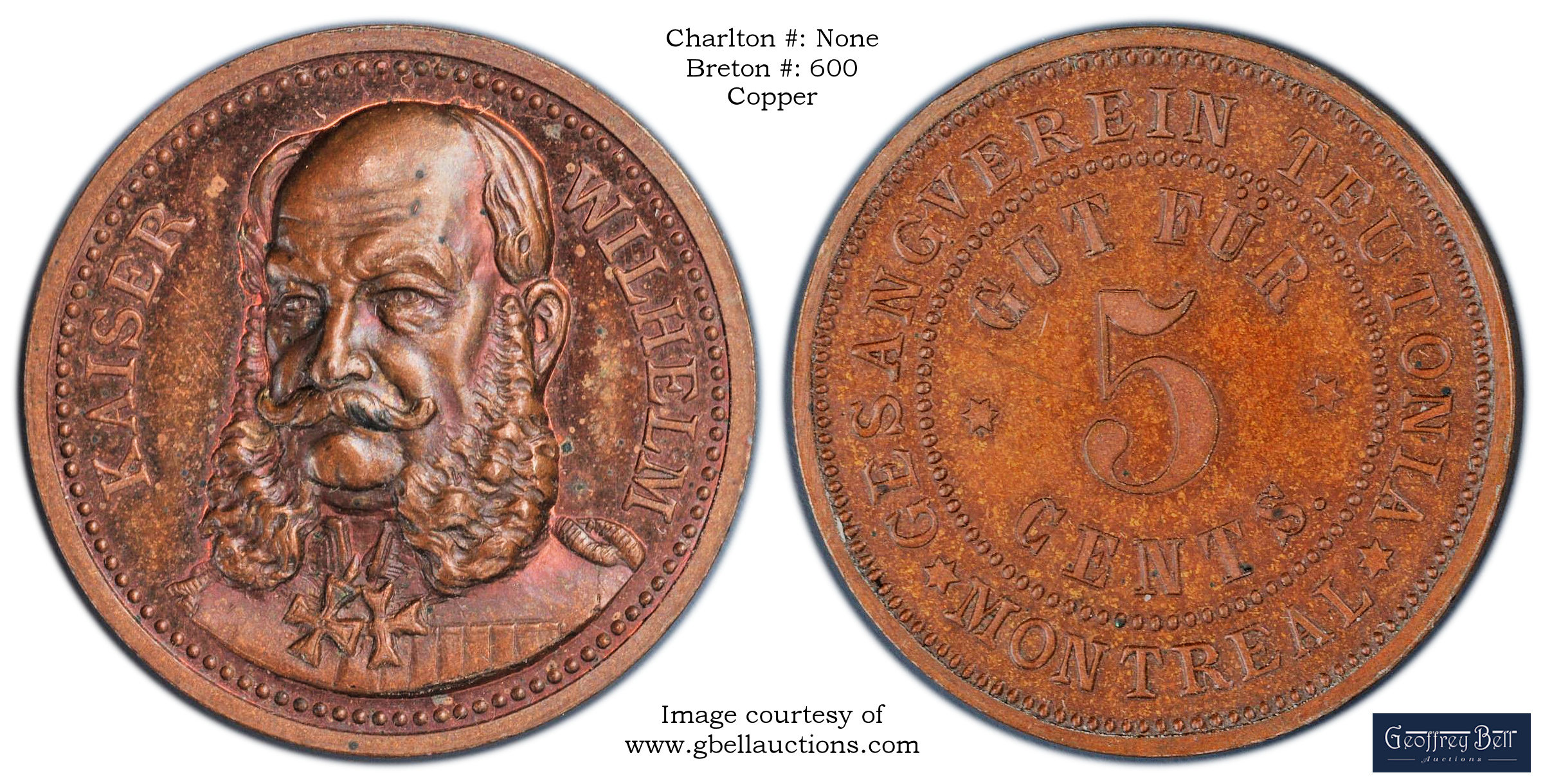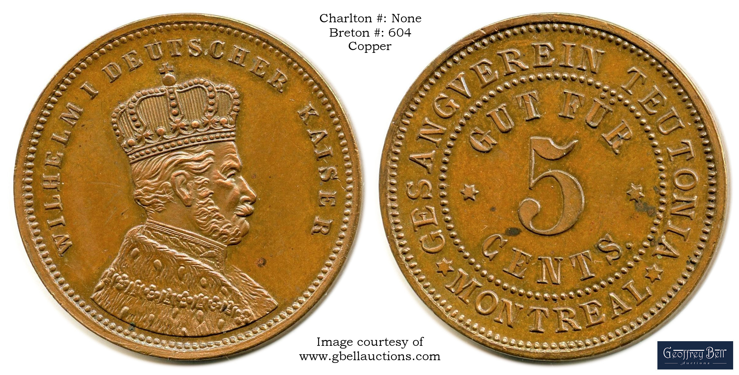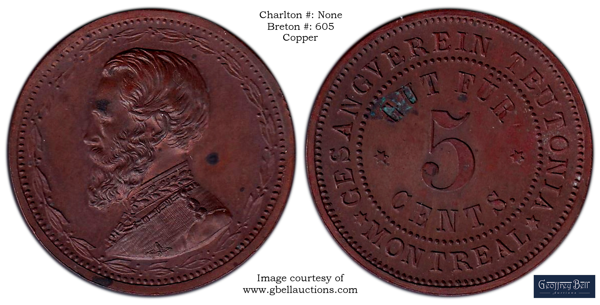 Reverse Content: Legend: GESANGVEREIN TEUTONIA MONTREAL Center: GUT FUR 5 CENTS |