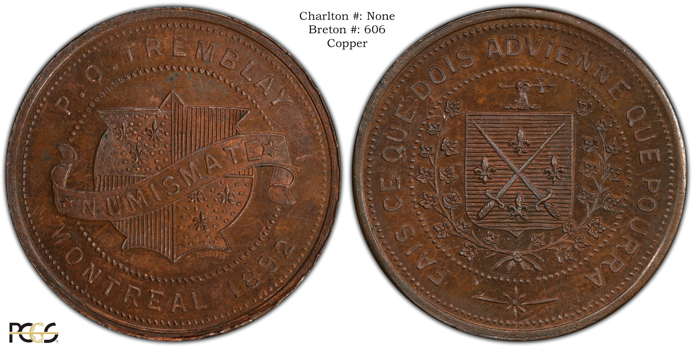 Obverse Content: Legend: P.O. TREMBLAY MONTREAL 1892 Center: ("NUMISMATE" inside a shield with vertical lines and two groups of three Fleur-de-Lis) |