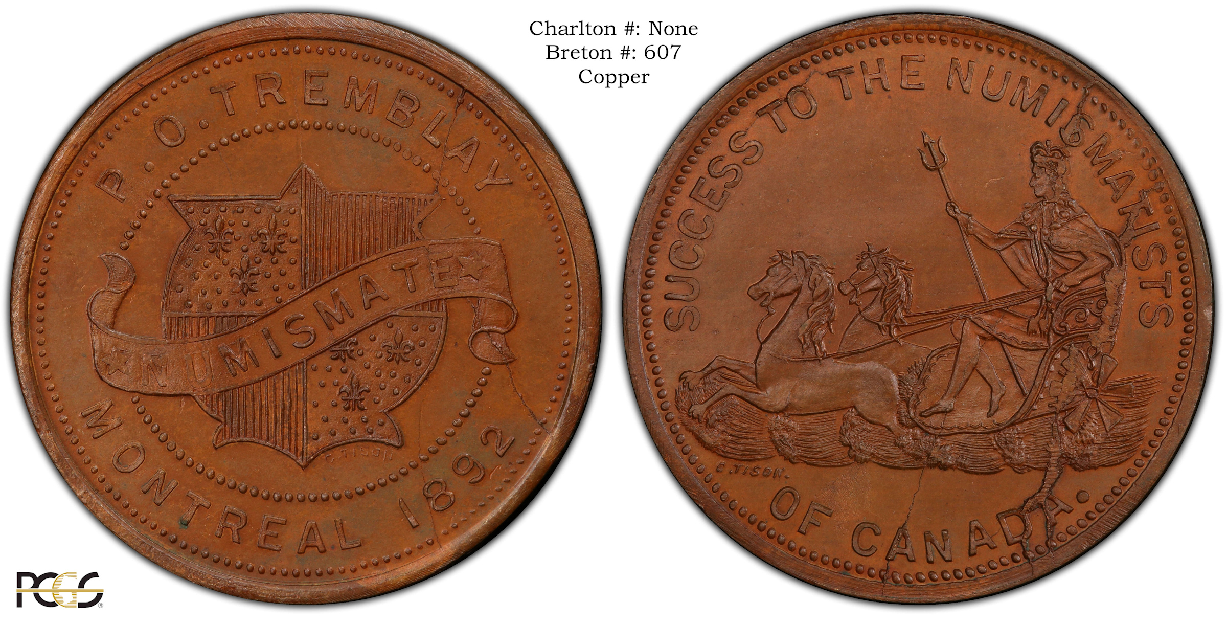 Reverse Content: Legend: SUCCESS TO THE NUMISMATISTS OF CANADA Center: (image of a crowned woman carrying a trident, driving a chariot drawn by two horses) C. TISON. |