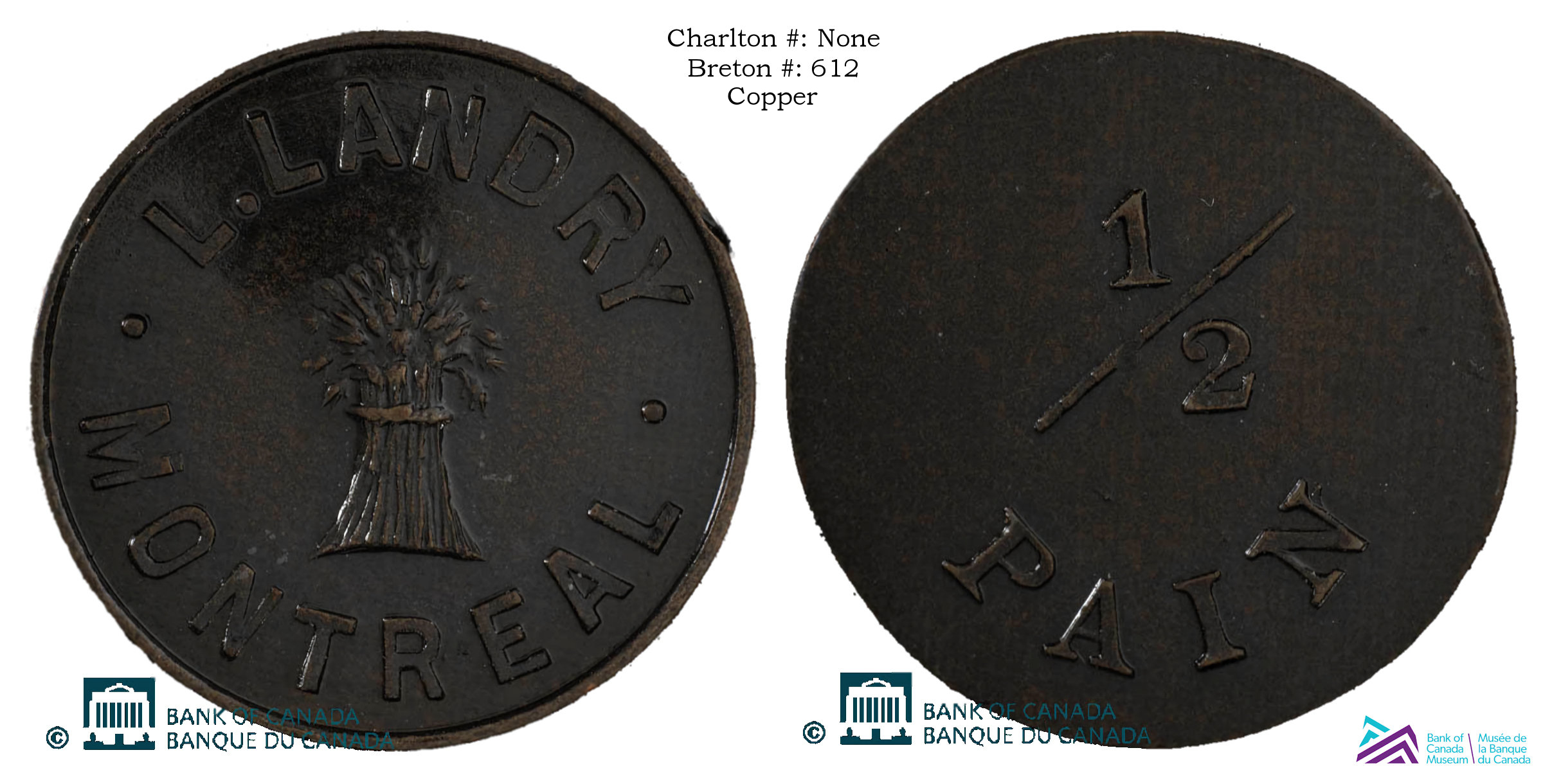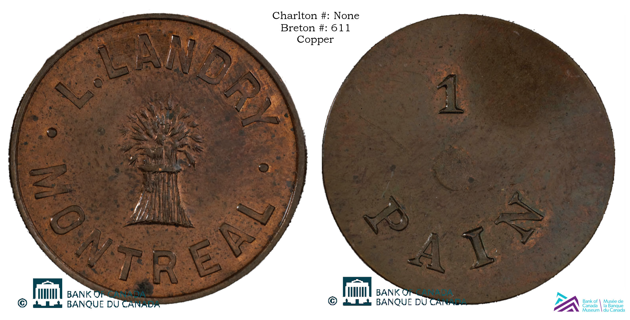 Obverse Content: Legend: L. LANDRY MONTREAL Center: (Image of a sheaf of wheat) |