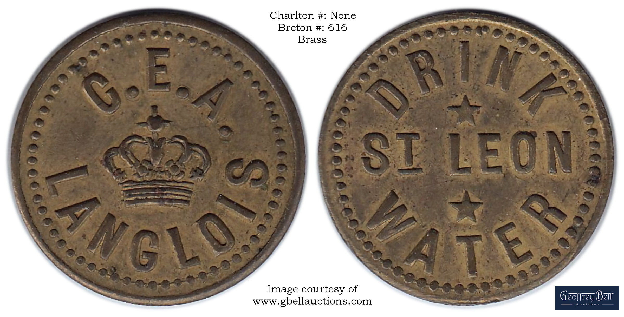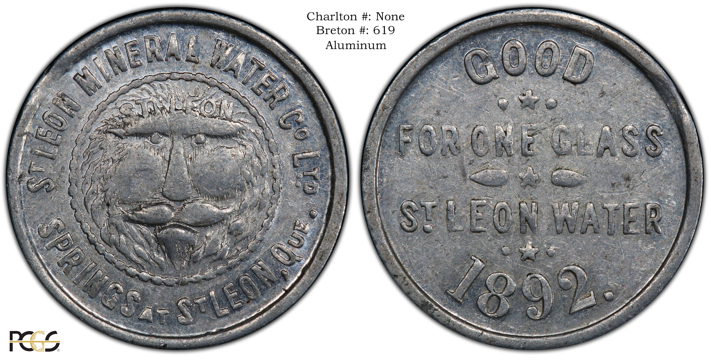 Obverse Content: Legend: St LEON MINERAL WATER Co Ltd / SPRINGS at St LEON Que. Center: St LEON (Image of a lion's head facing forward) |