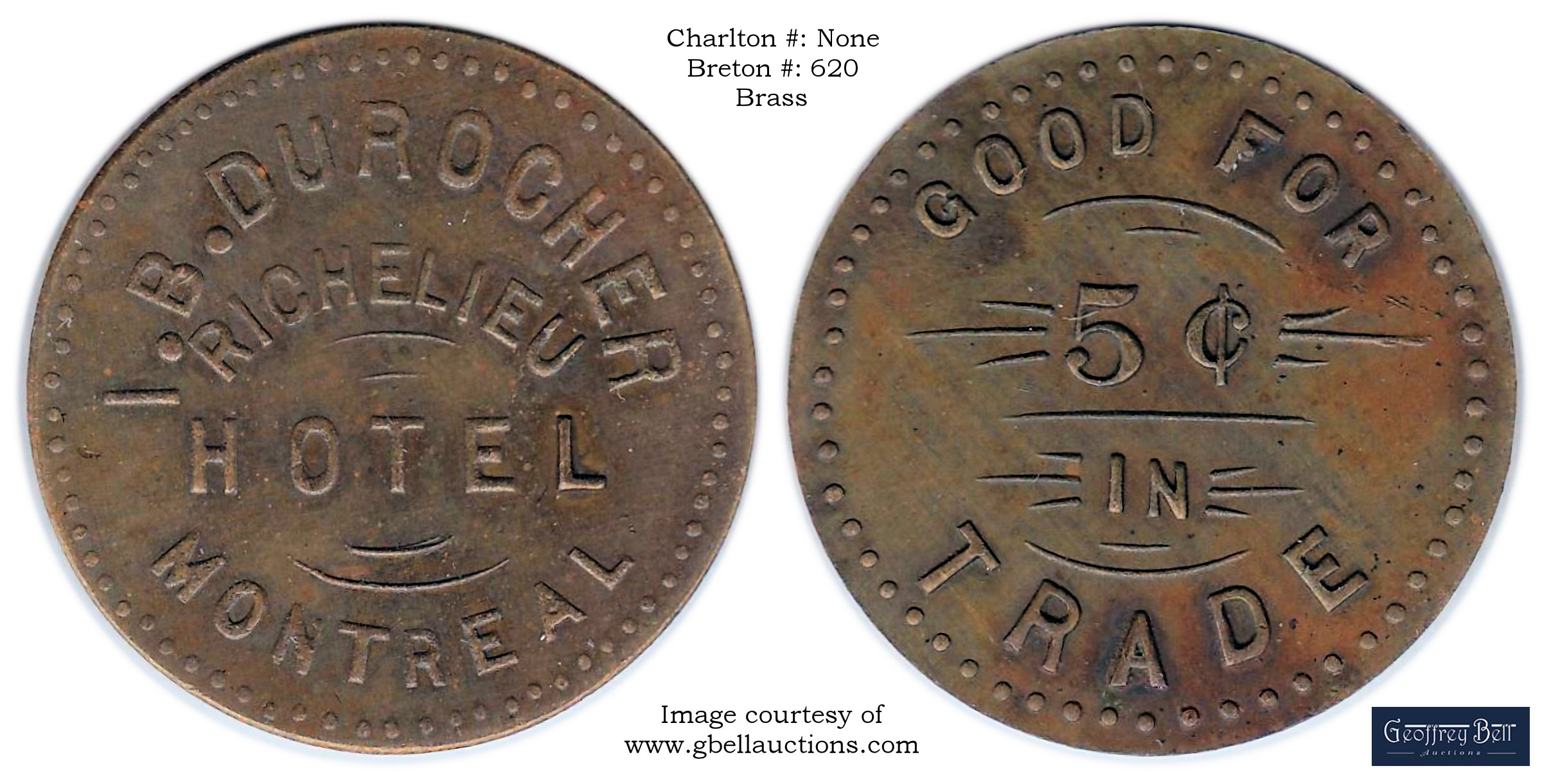 Obverse Content: Legend: B. DUROCHER / MONTREAL Center: RICHELIEU HOTEL |