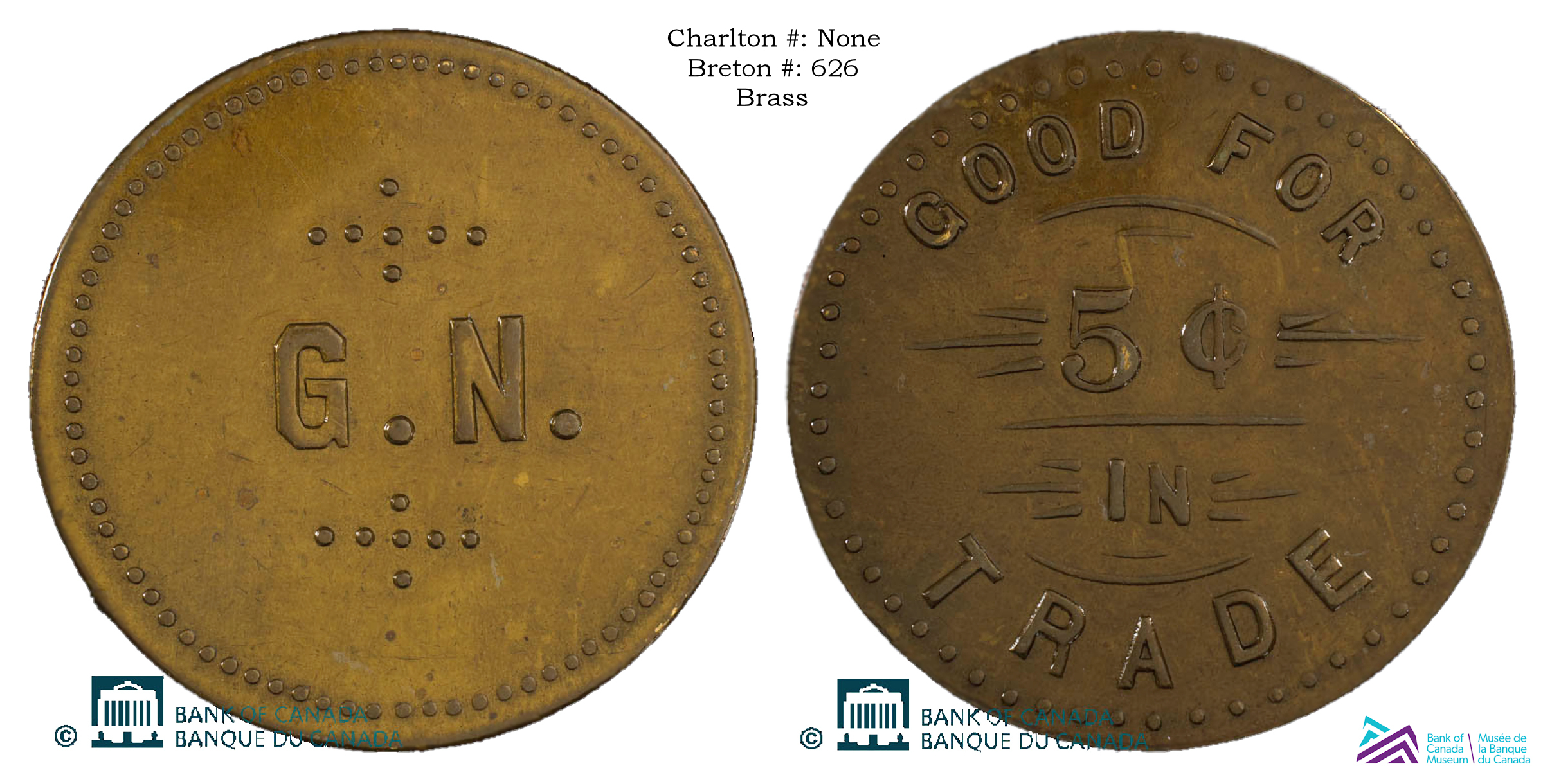 Breton 600 Series Part 1: Token numbers Br-600 to Br-633 While a large number of the tokens listed in P.N. Breton's catalogues from 1894 and 1912 are listed and re-catalogued in the 10th Edition of the Charlton Catalogue of Canadian Colonial Tokens, not all tokens were re-catalogued. This section details most of the "600 Series" Breton tokens not found in the Charlton catlogue. NOTE: Click on any photo to load a much larger version of the same photo |