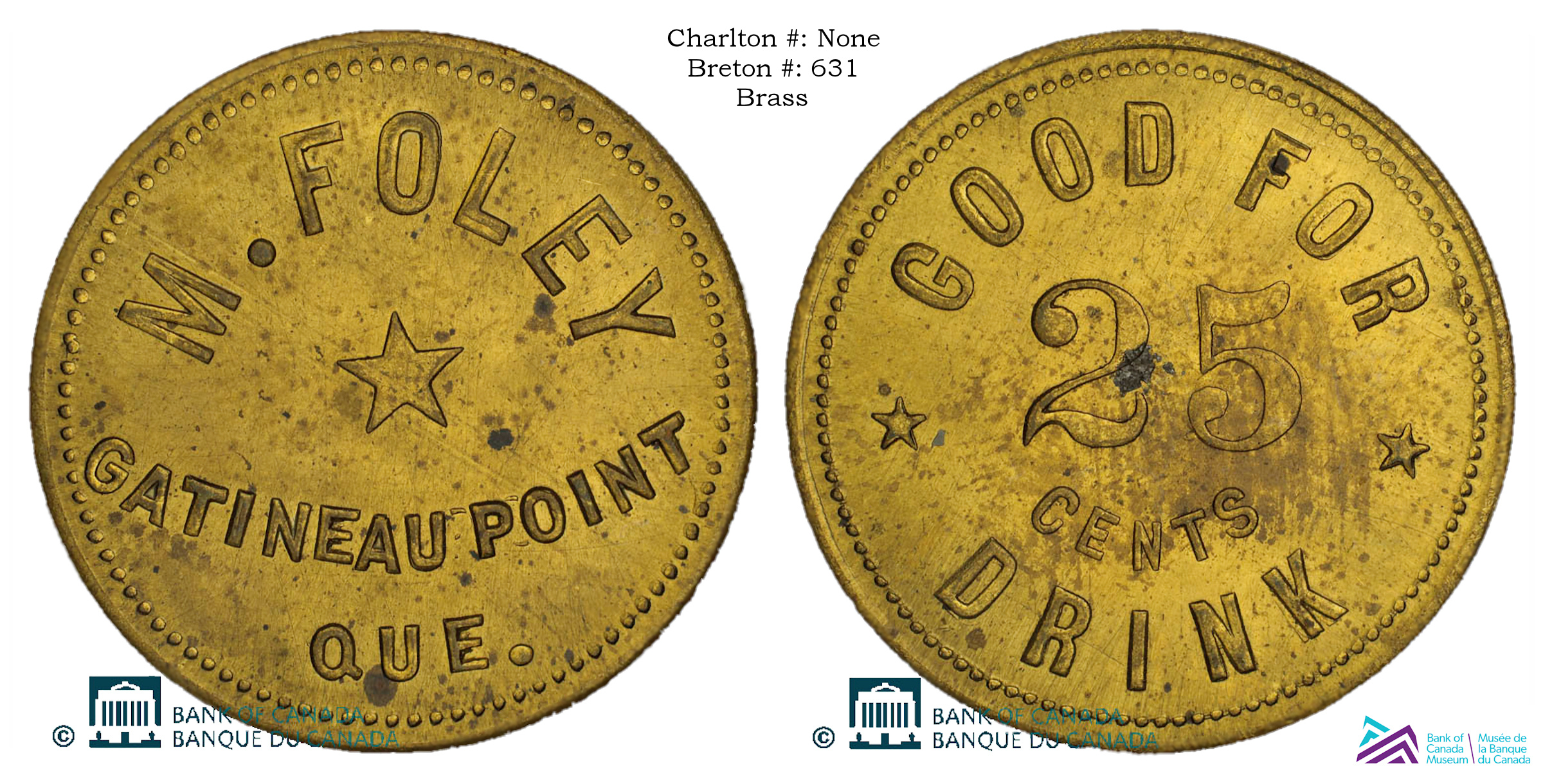 Obverse Content: Legend/Center: M. FOLEY GATINEAU POINT QUE. |