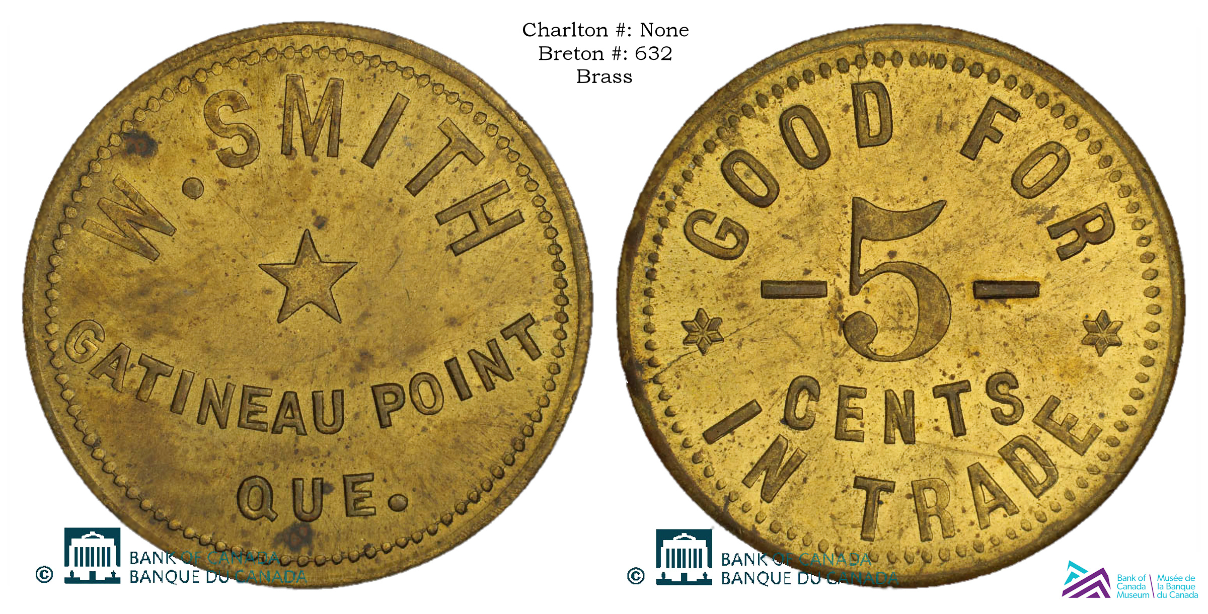 Obverse Content: Legend/Center: W. SMITH GATINEAU POINT QUE. |