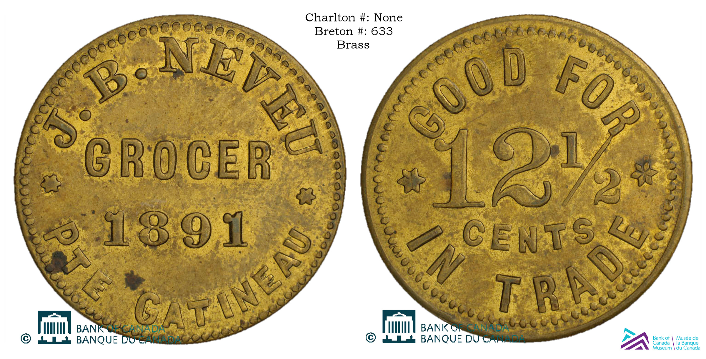 Obverse Content: Legend/Center: J.B. NEVEU GROCER 1891 Pte GATINEAU |