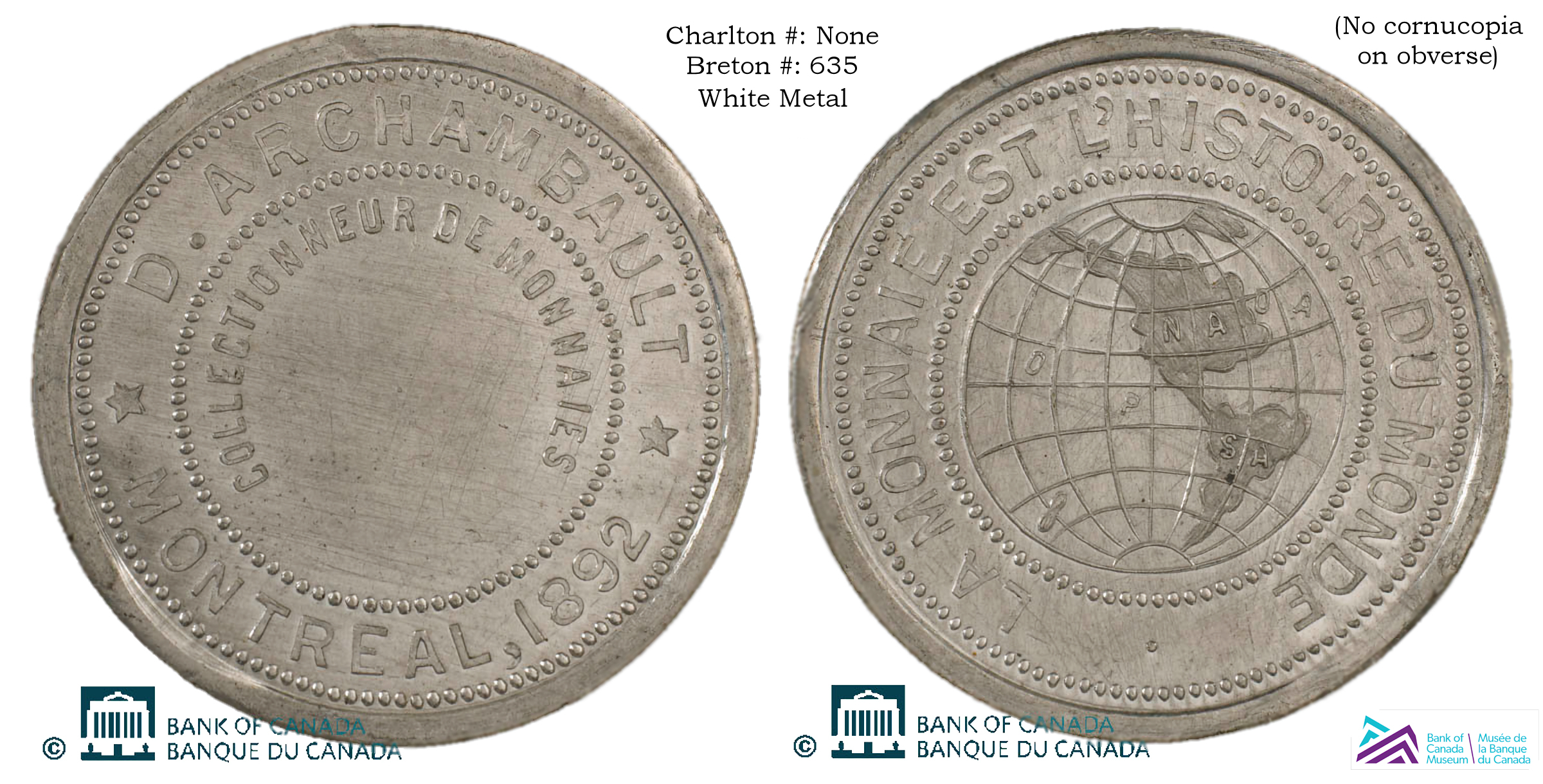 Obverse Content: Legend: D. ARCHAMBAULT / MONTREAL 1892 Center: COLLECTIONNEUR DE MONNAIES (image of a cornucopia filled with coins) |