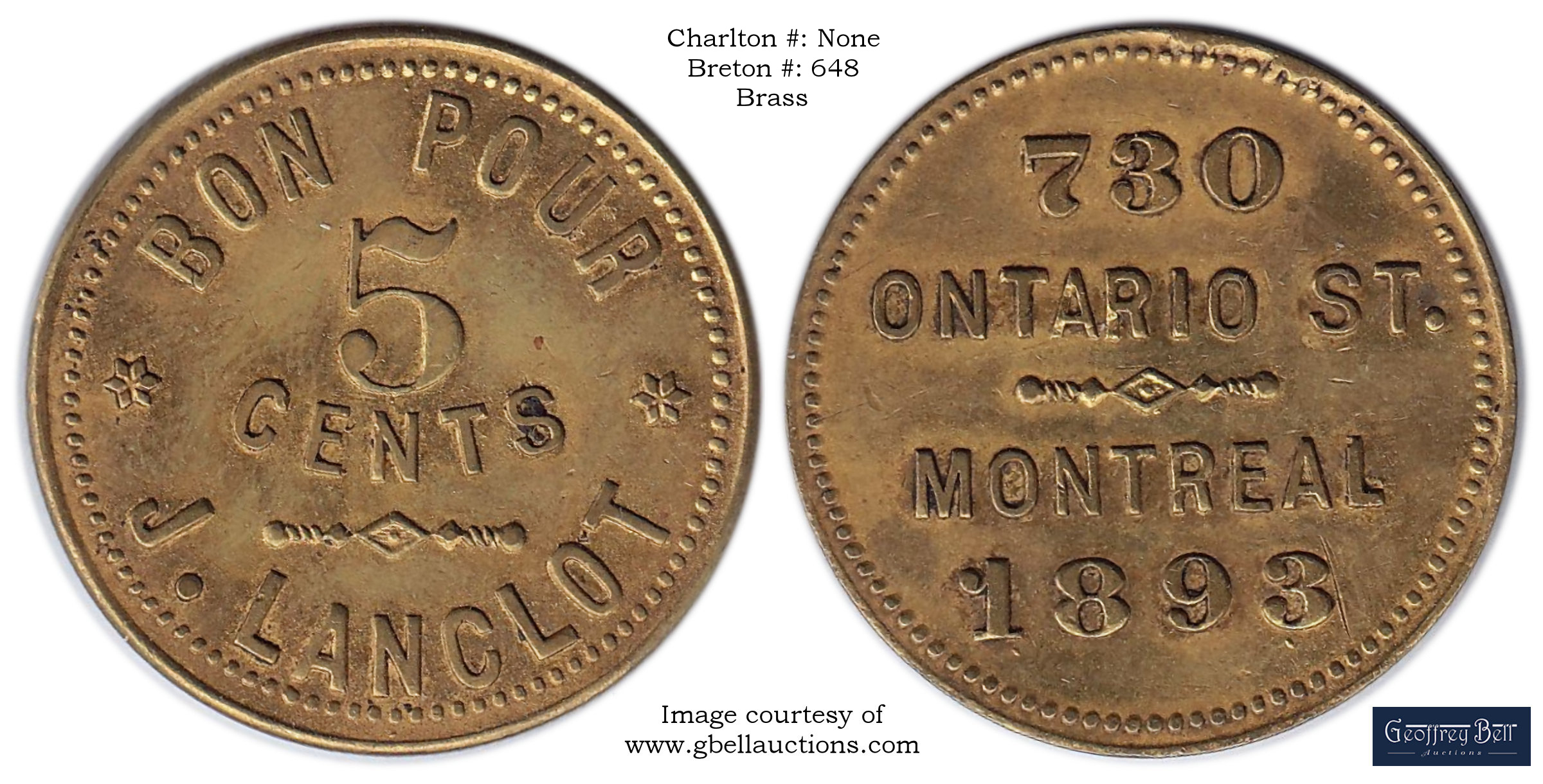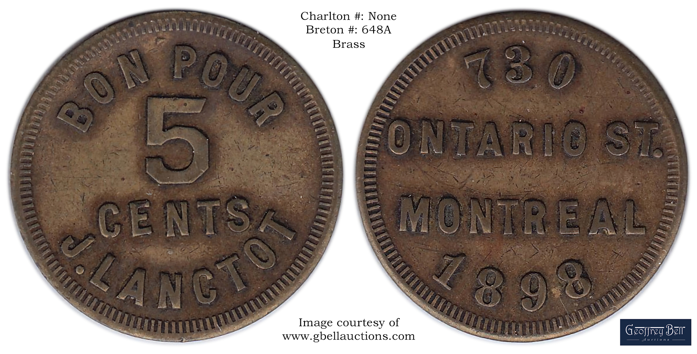 Obverse Content: Legend and Center: BON POUR 5 CENTS J. LANCTOT |