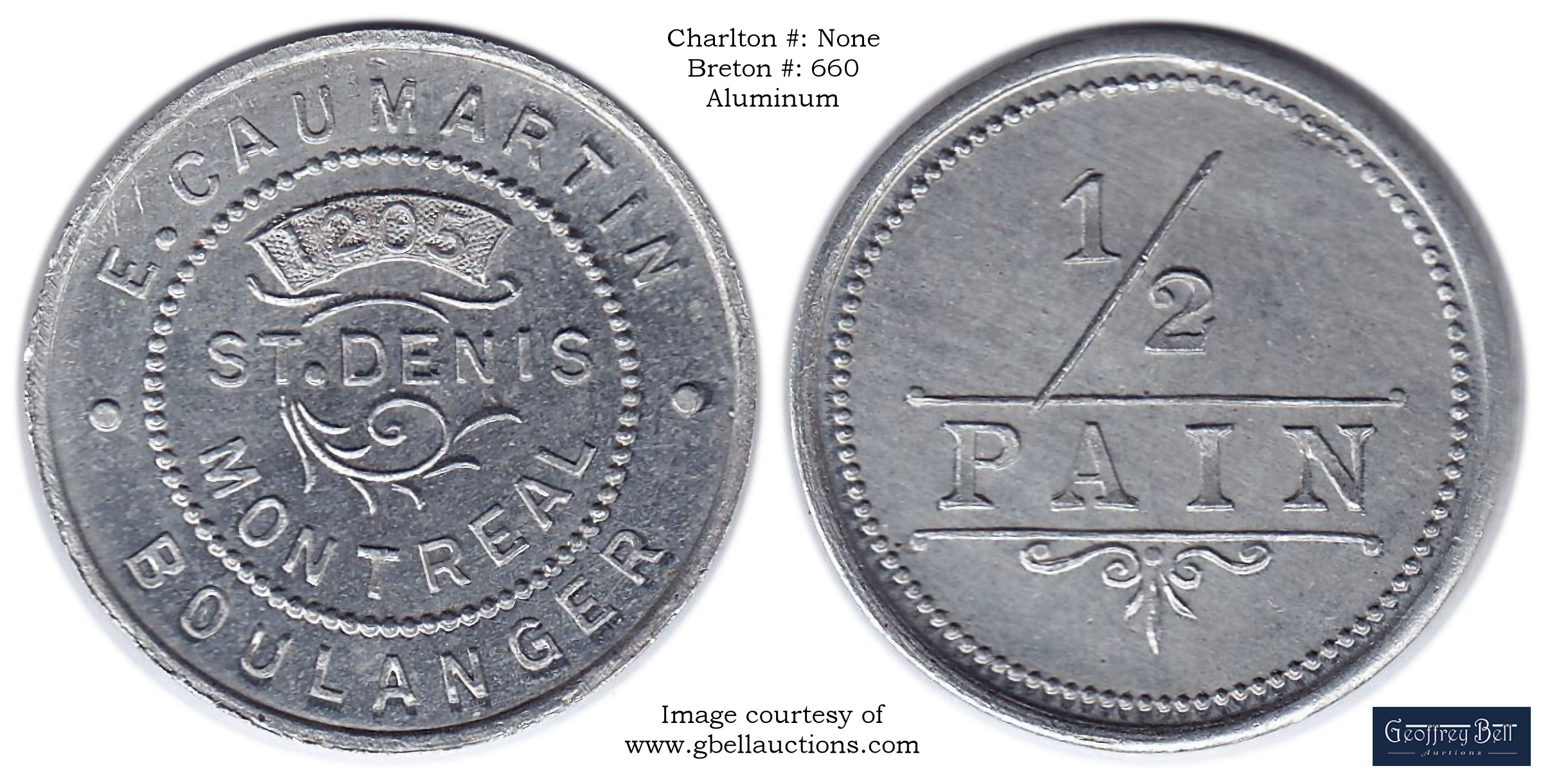 Obverse Content: Legend: E. CAUMARTIN / BOULANGER Center: 1205 ST. DENIS MONTREAL |