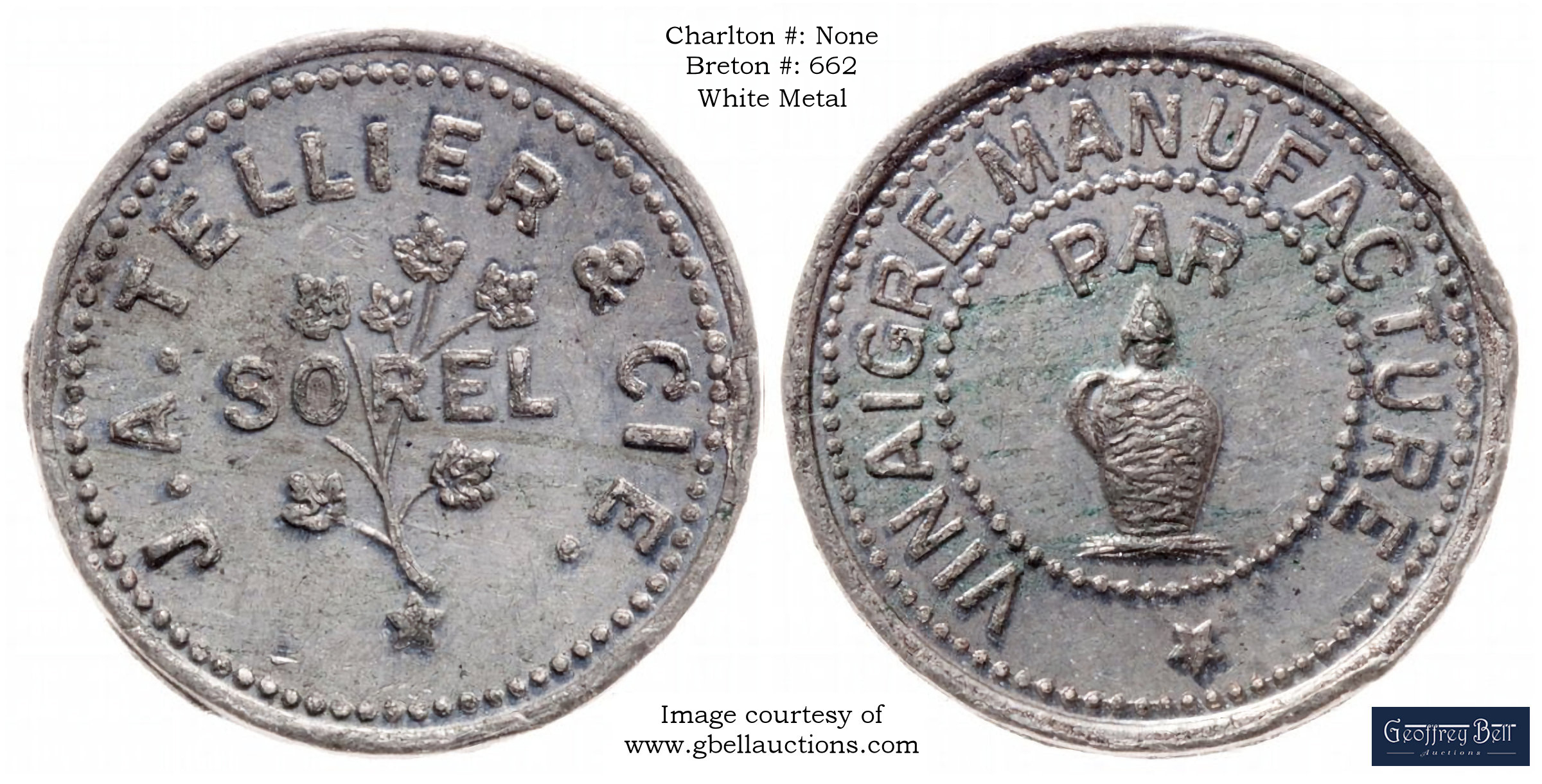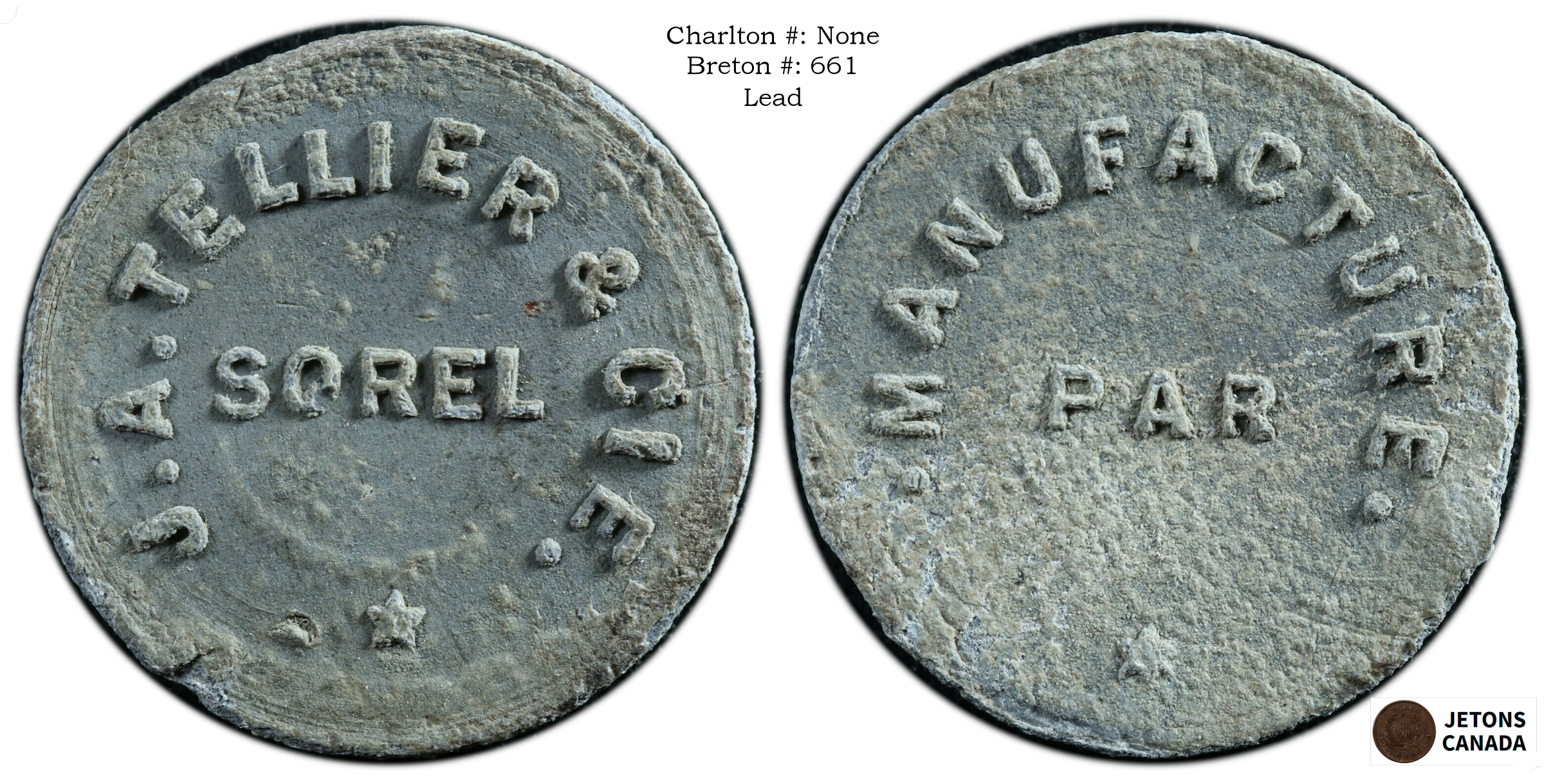 Obverse Content: Legend: J.A. TELLIER & CIE. Center: SOREL |