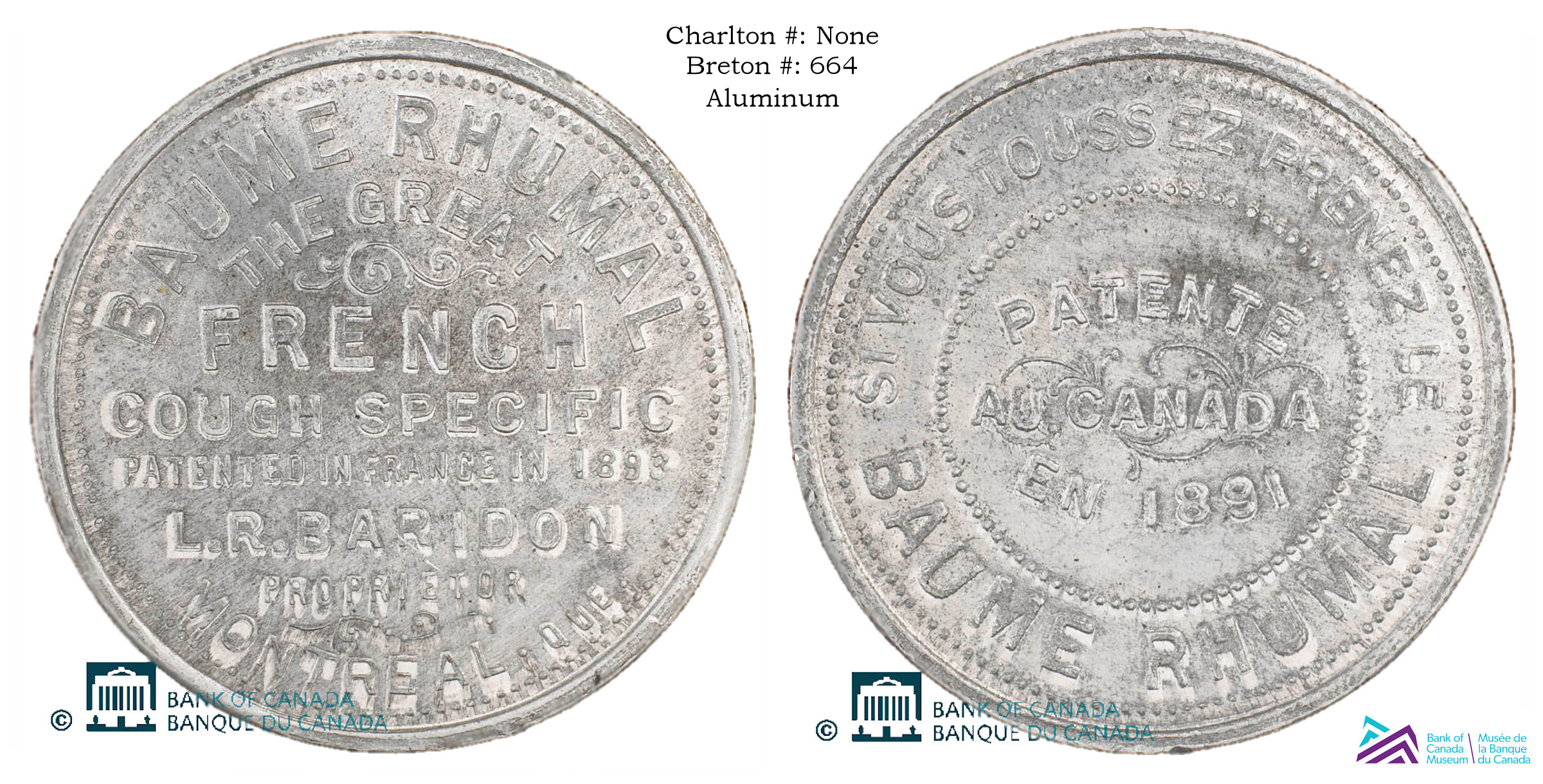 Obverse Content: Legend and Center: BAUME RHUMAL / THE GREAT FRENCH COUGH SPECIFIC / PATENTED IN FRANCE IN 1893 / L.R. BARIDON PROPRIETOR / MONTREAL QUE. |