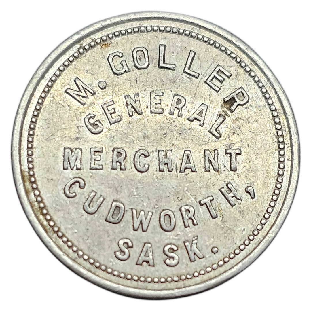 M. Goller General Merchant Cudworth, Sask. (Good For 5¢ In Merchandise) Martin Goller opened the general store in 1922 and in 1925 tokens were issued, $200.00 worth. In 1930 Mr. Goller sold his business and all tokens were gathered up. In 1935 he started another store in Battleford and intended to reuse the tokens but for some reason which he could not remember, they were not used. This business was sold in 1939 and Mr. Goller does not remember what happened to the tokens at this time. He must have had two issues as a recent discovery shows a 5¢, 10¢ and 25¢ different than the above listed. |