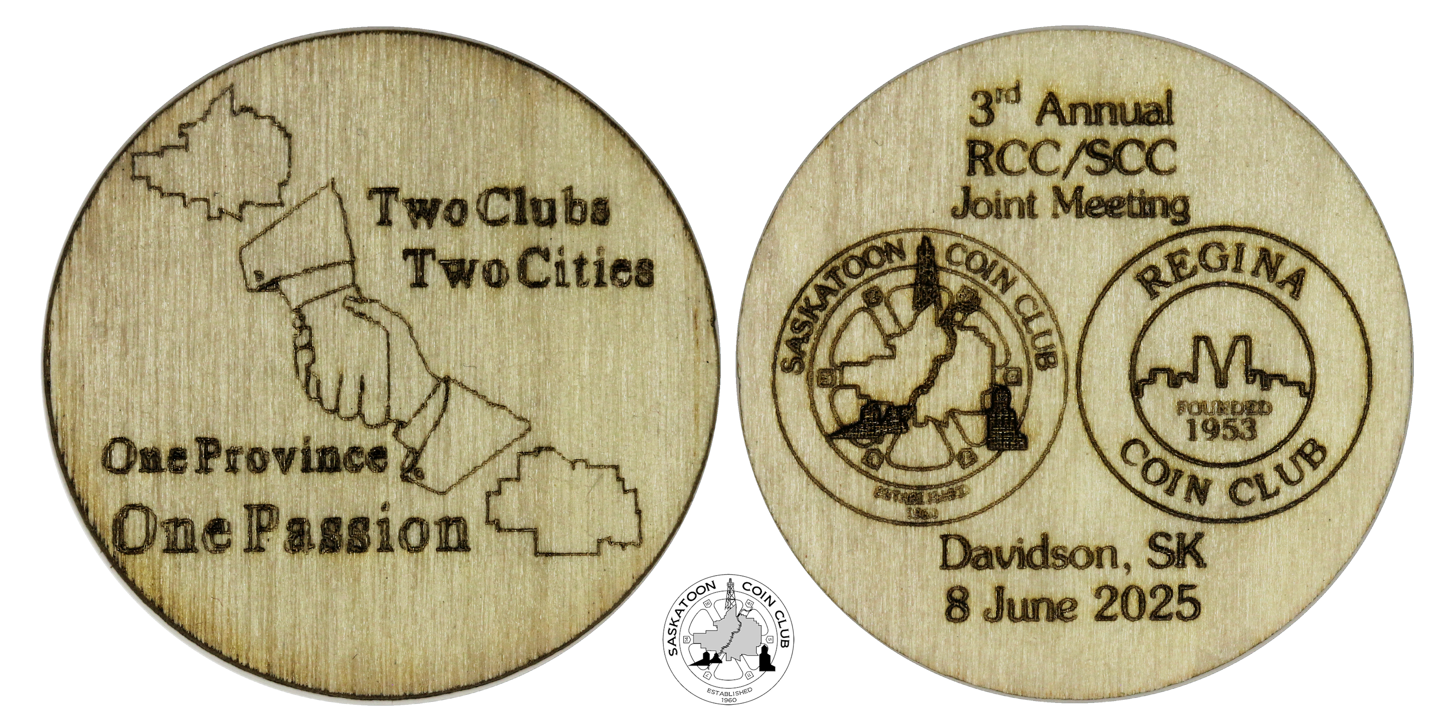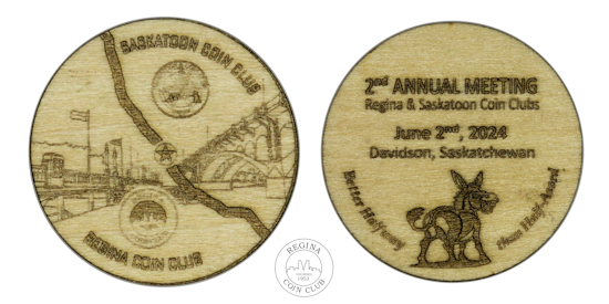 In 2024 a member of the Regina club produced a group of laser engraved wooden tokens to commemorate the event (see below), and in 2025 the Saskatoon club took our turn in producing a wooden token.