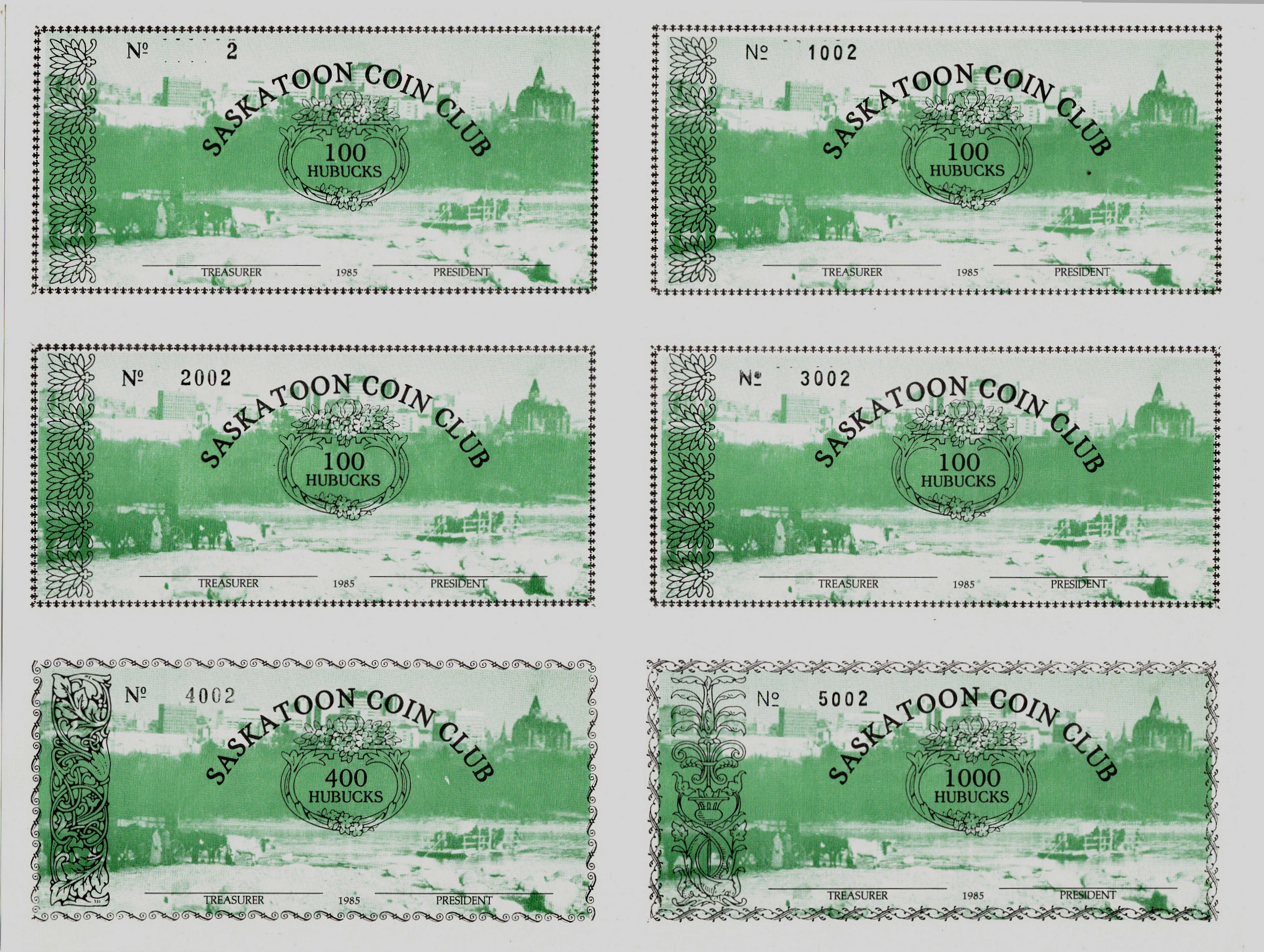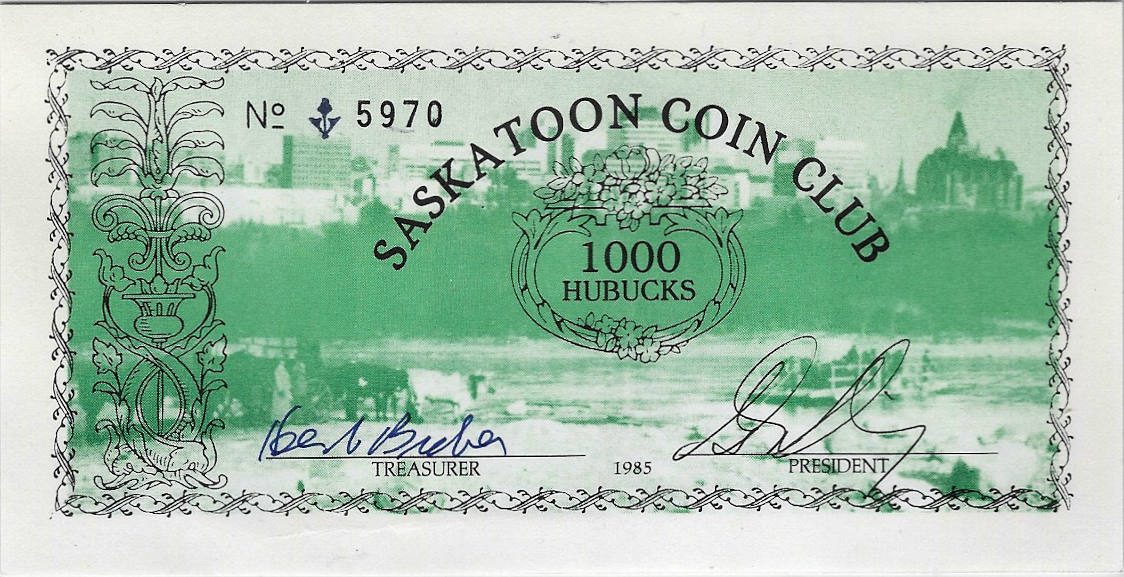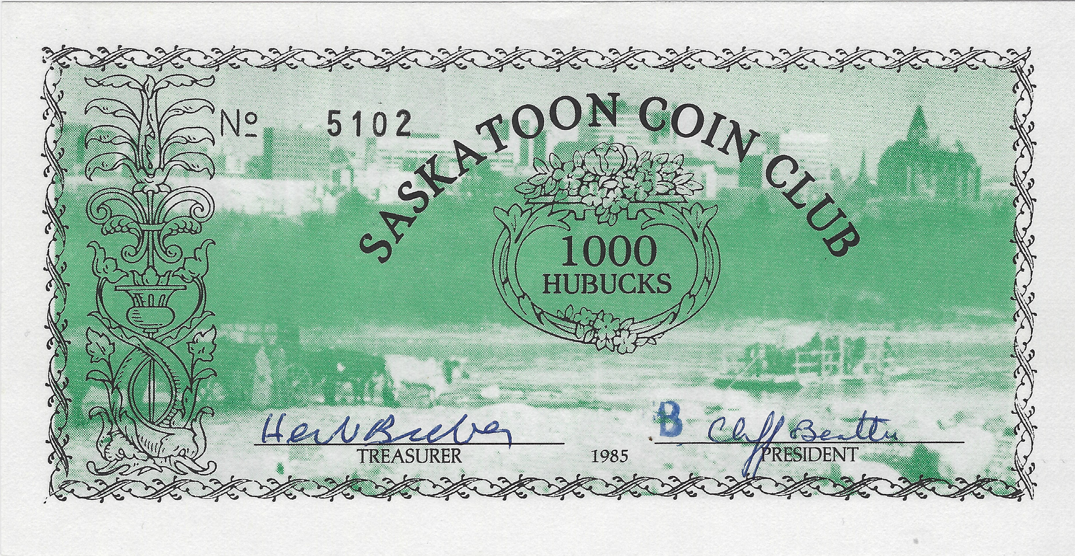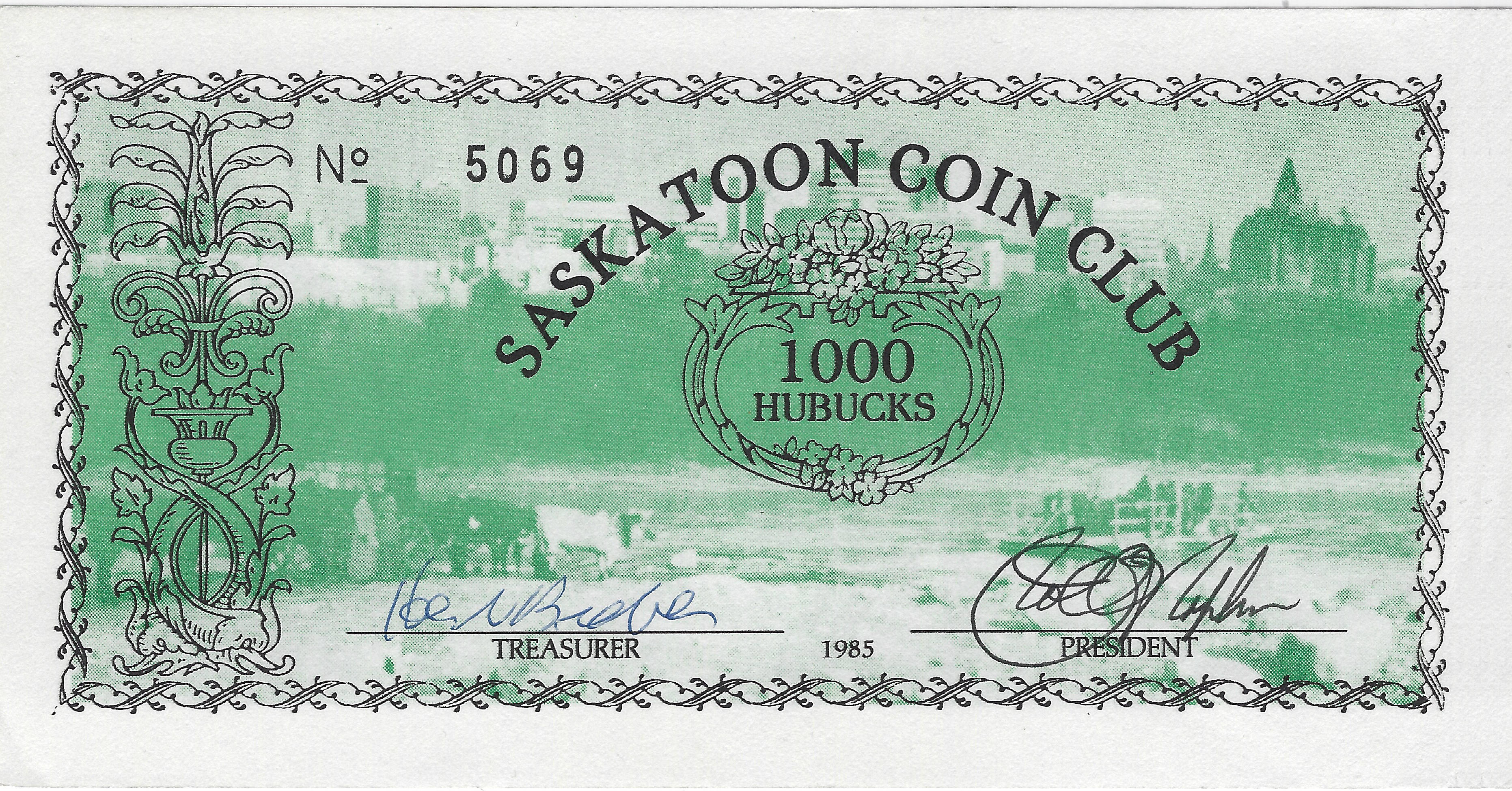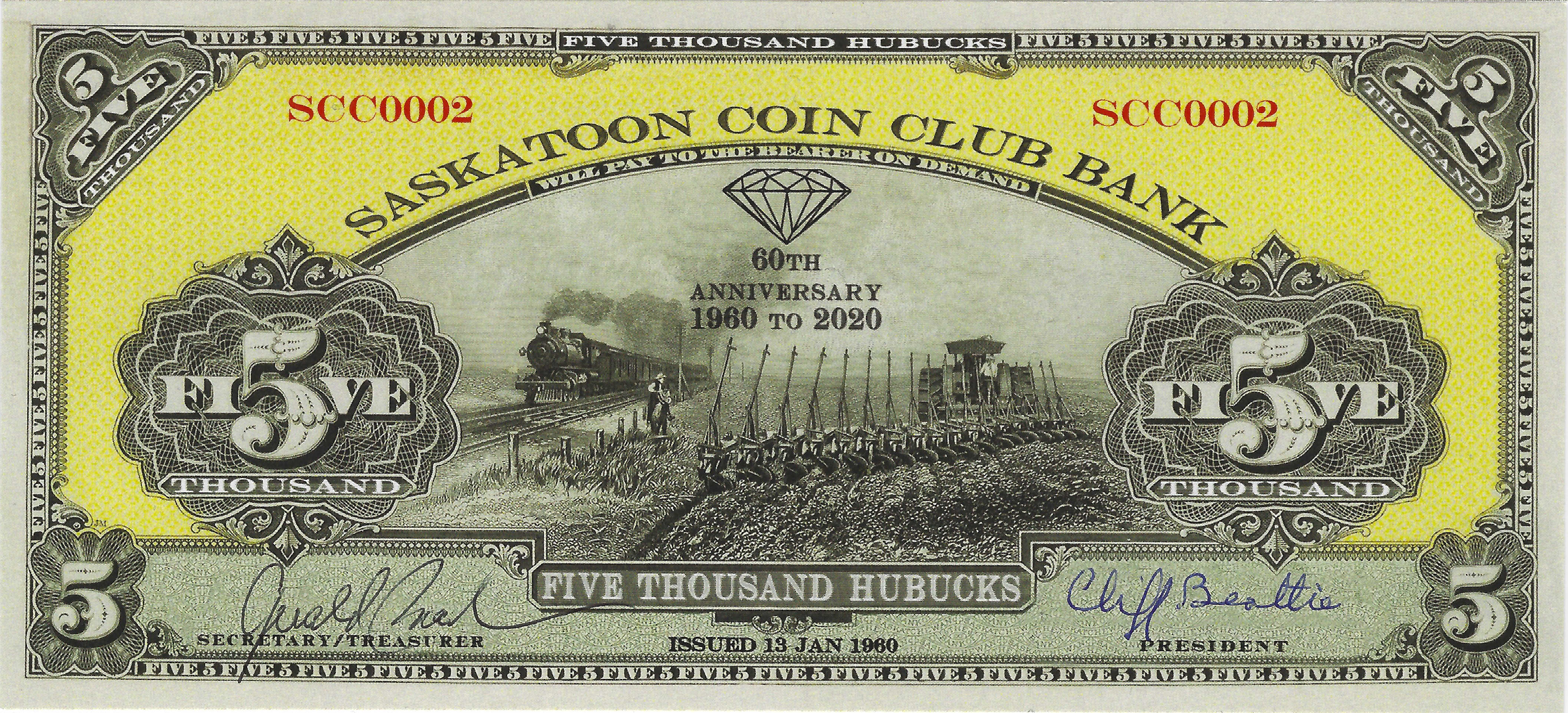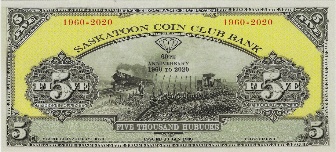 2020 marked the sixtieth anniversary of the Saskatoon Coin Club. To commemorate this event Jim MacKenzie and Cliff Beattie designed a special 5000 Hubuck note.