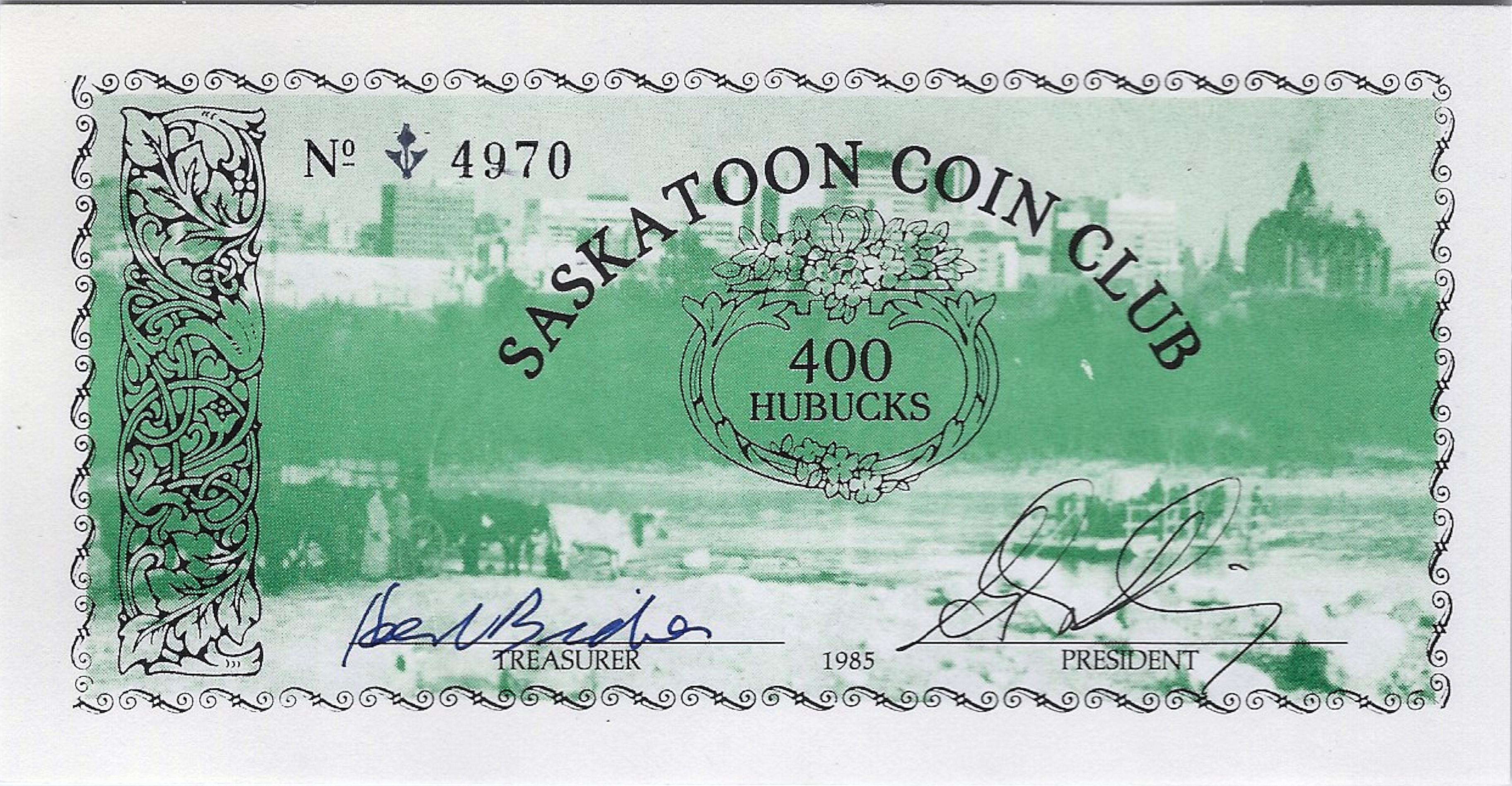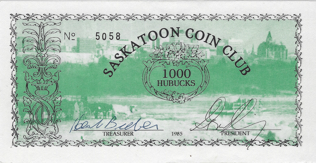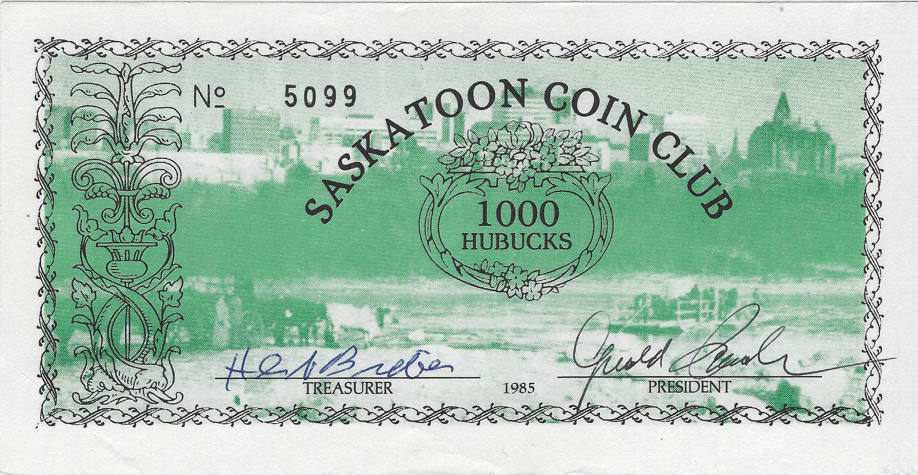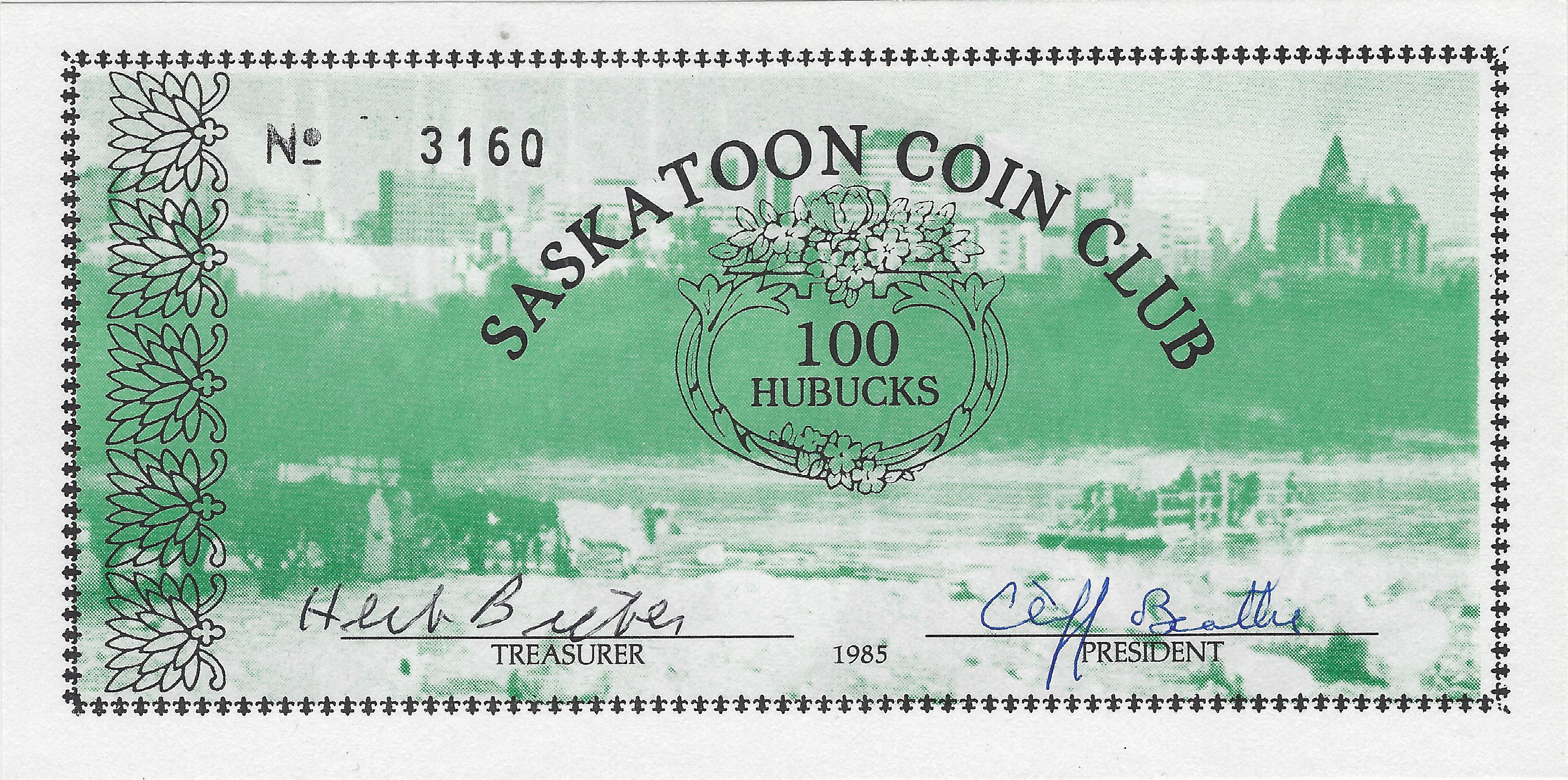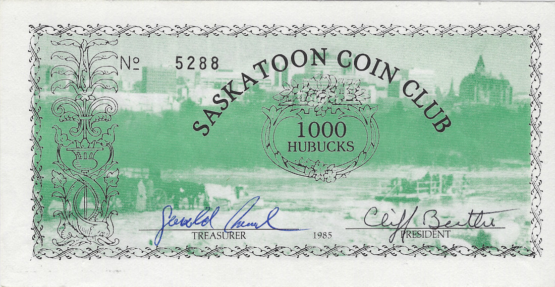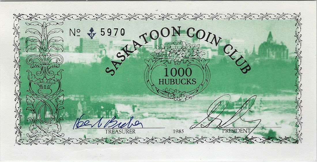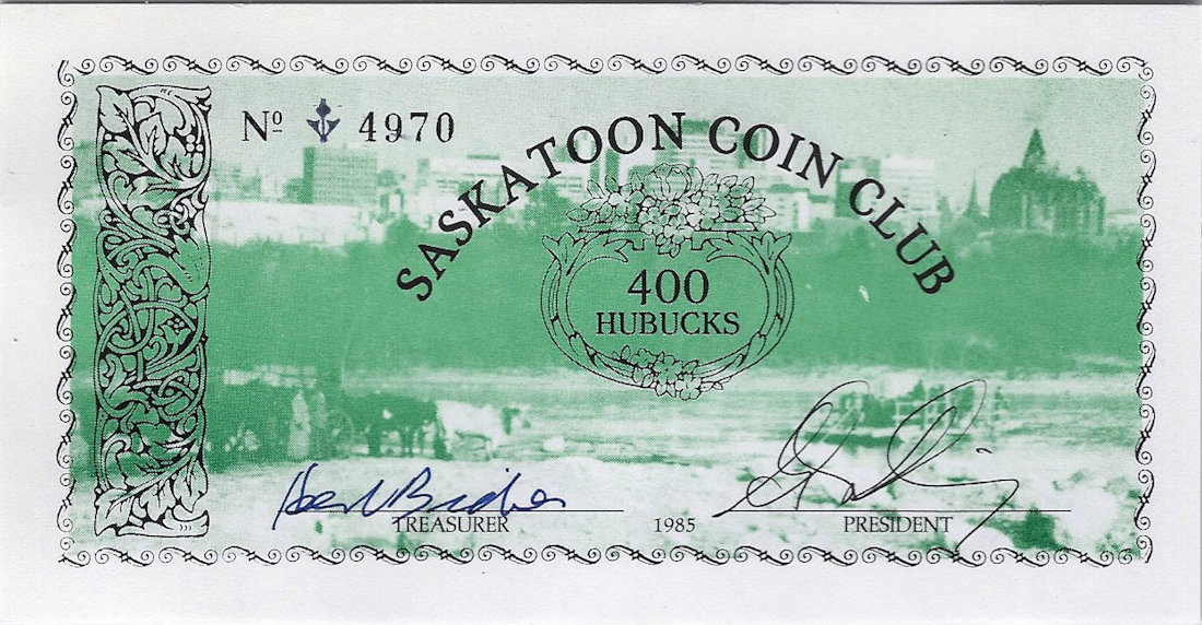 2020 marked the sixtieth anniversary of the Saskatoon Coin Club. To commemorate this event Jim MacKenzie and Cliff Beattie designed a special 5000 Hubuck note.