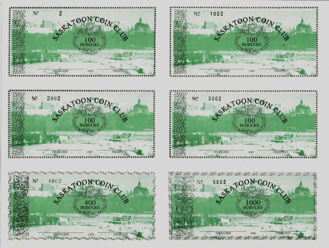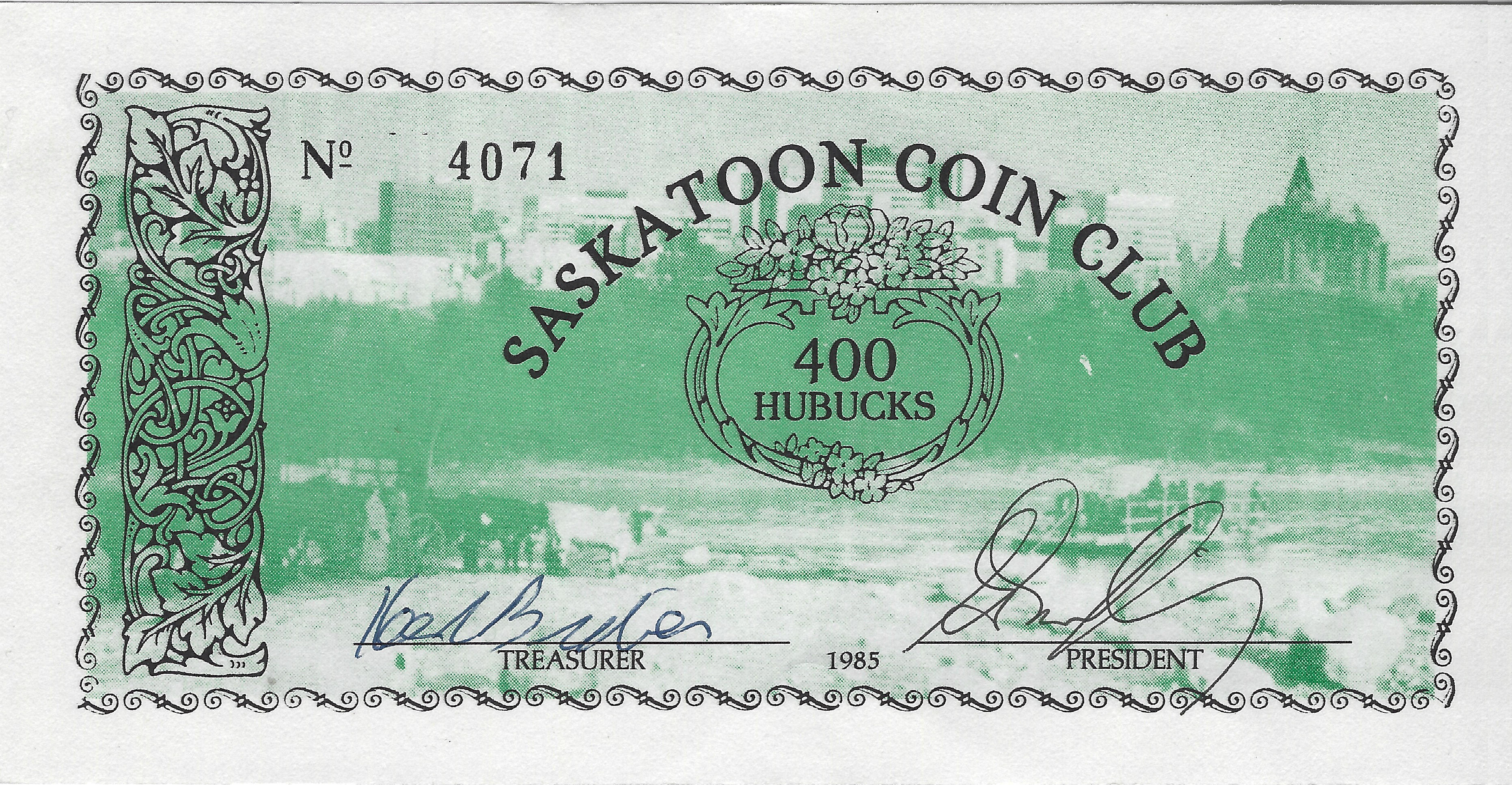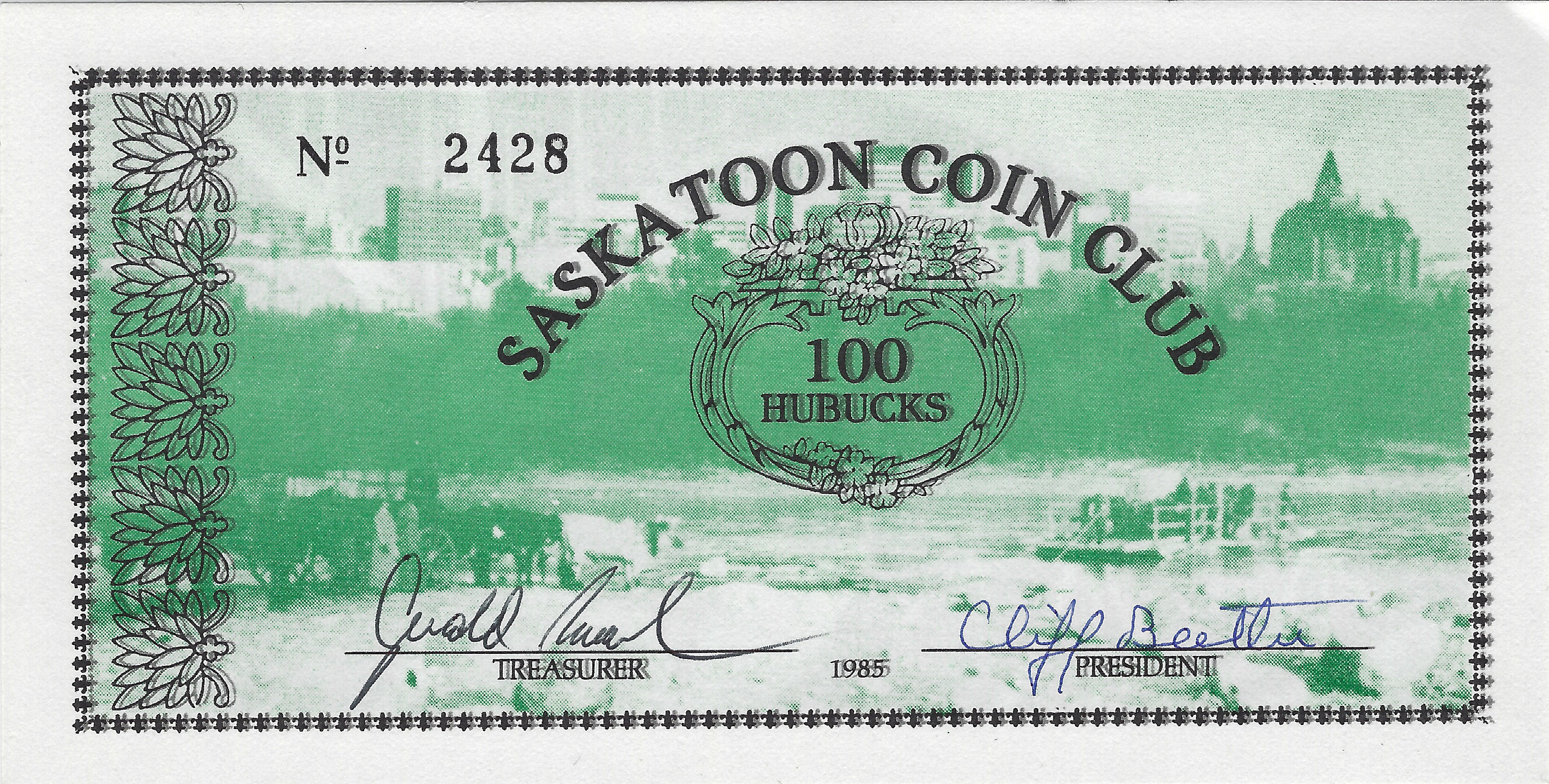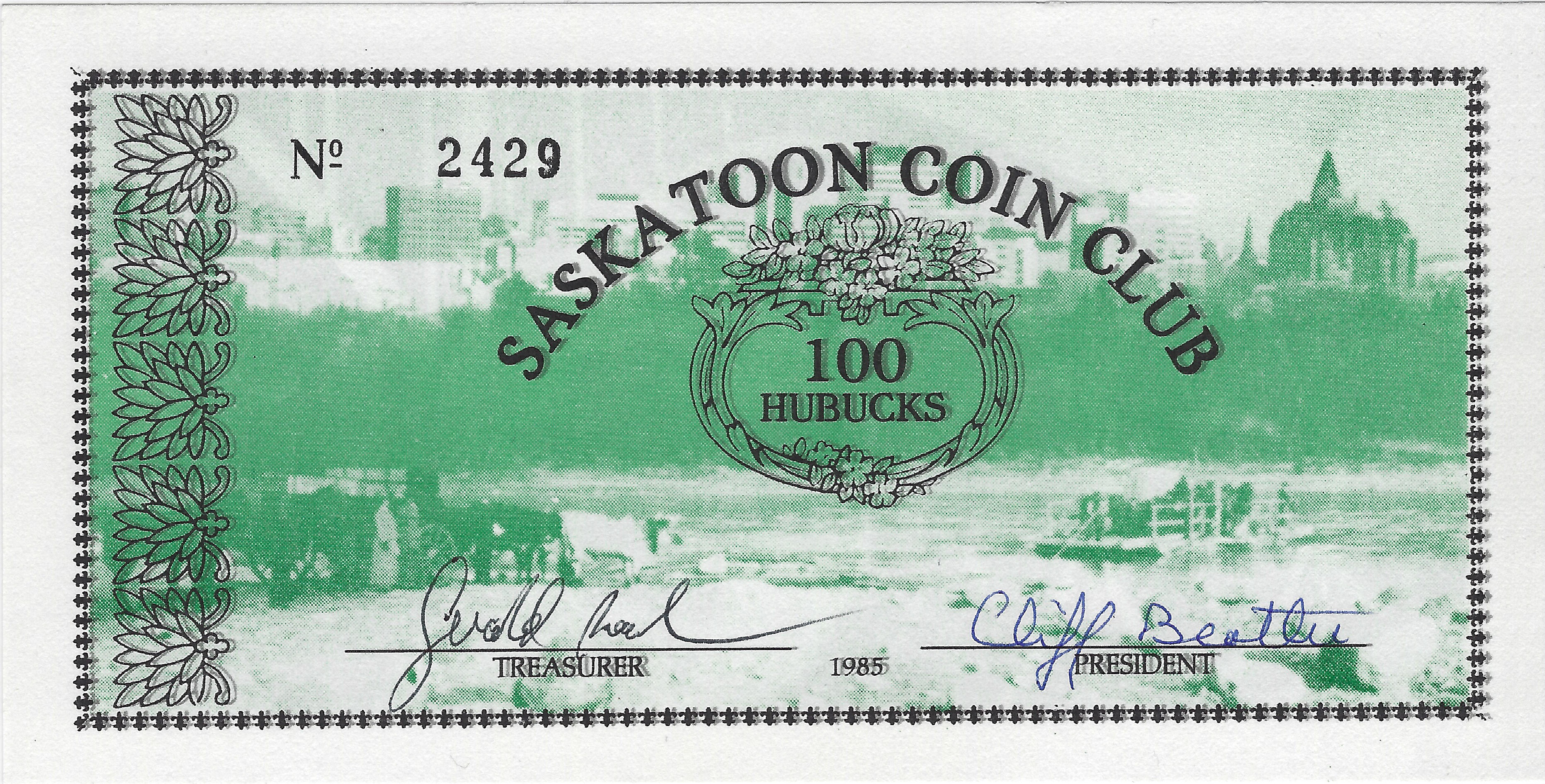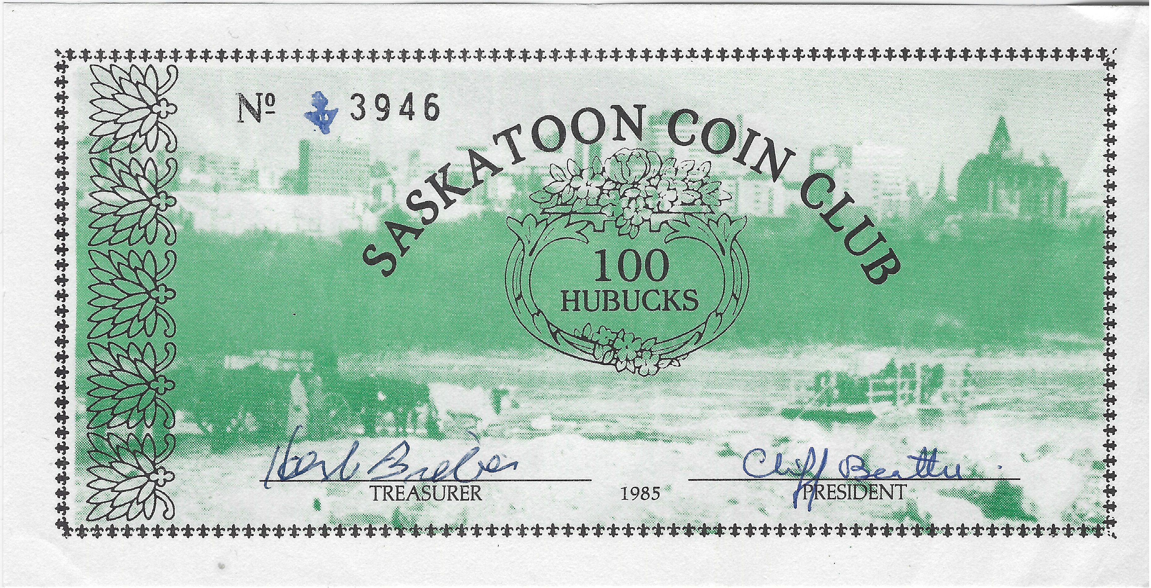 2020 marked the sixtieth anniversary of the Saskatoon Coin Club. To commemorate this event Jim MacKenzie and Cliff Beattie designed a special 5000 Hubuck note.