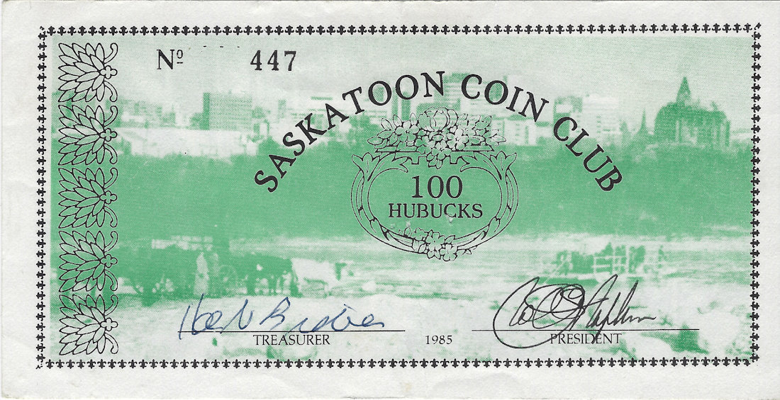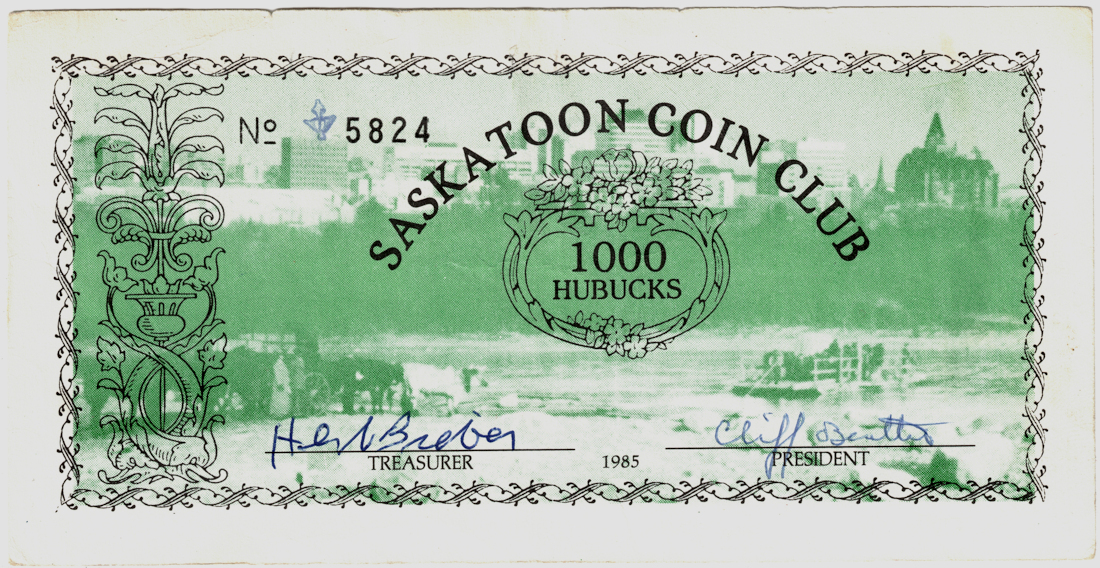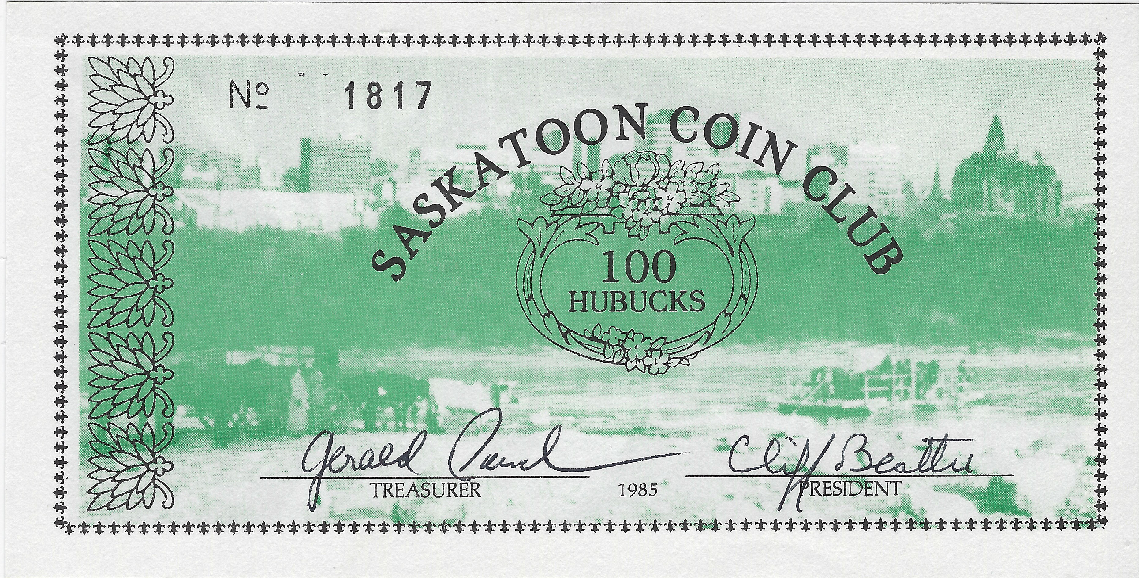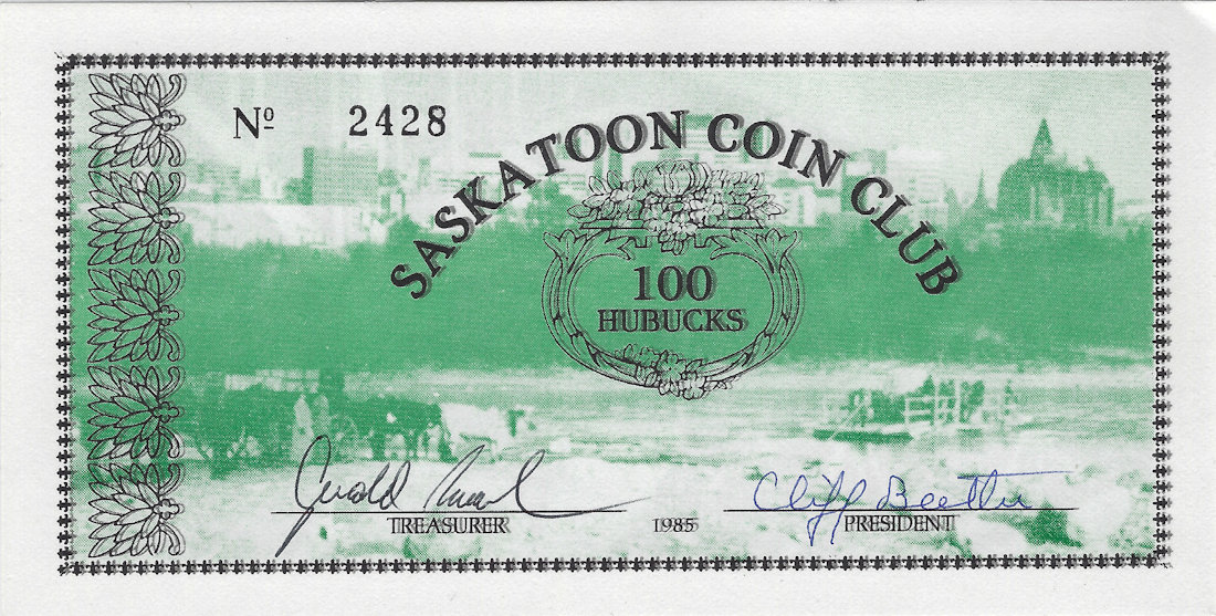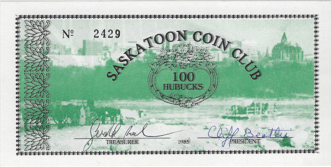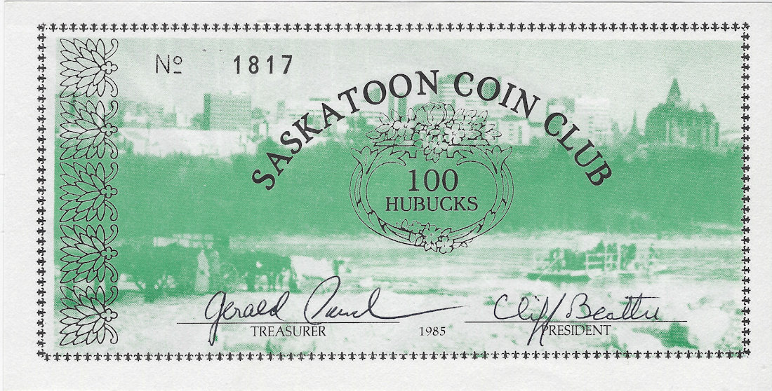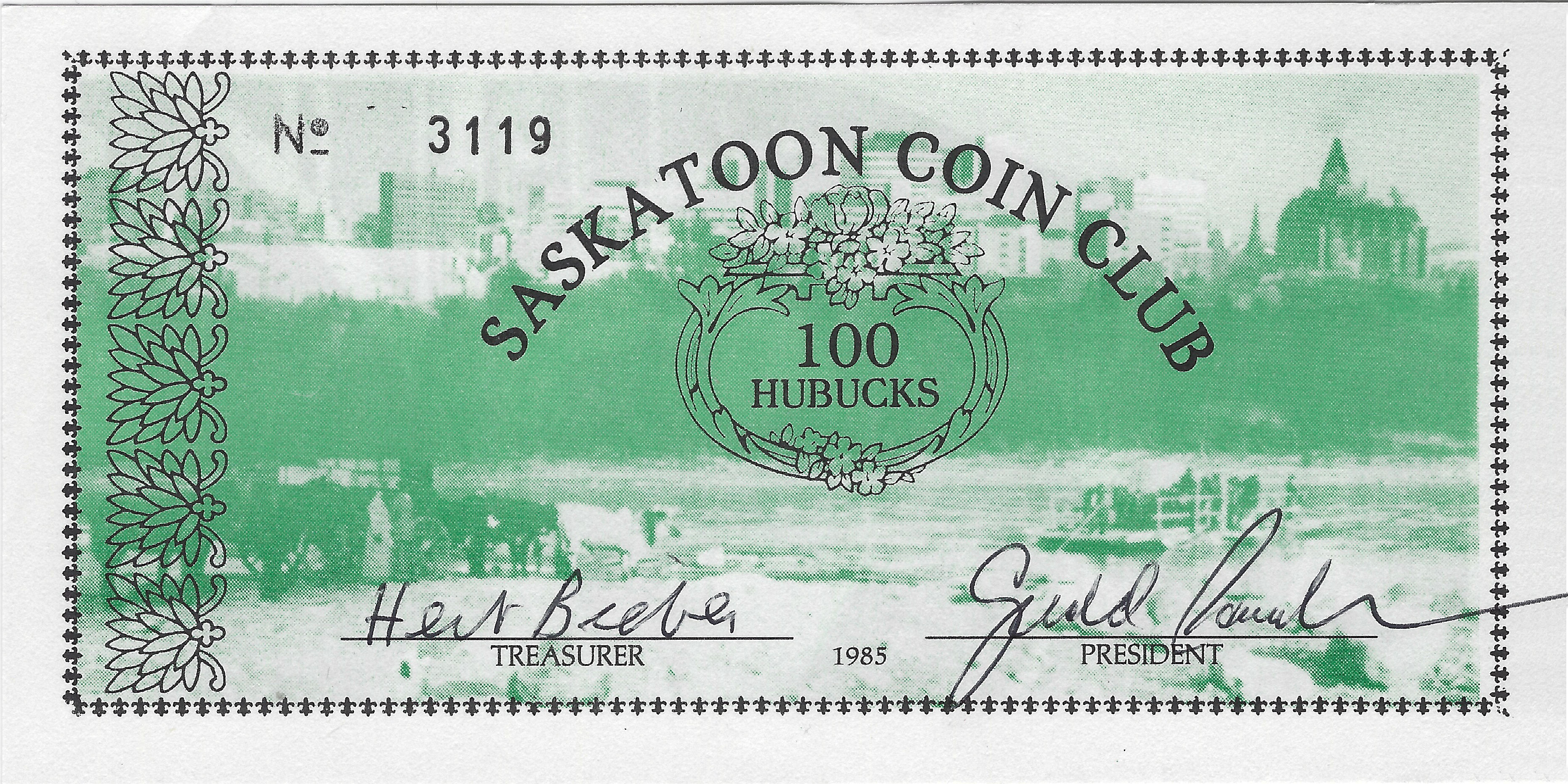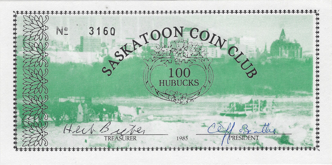 2020 marked the sixtieth anniversary of the Saskatoon Coin Club. To commemorate this event Jim MacKenzie and Cliff Beattie designed a special 5000 Hubuck note.