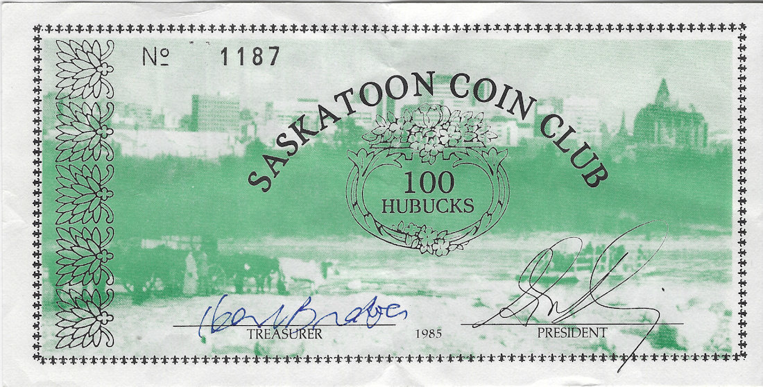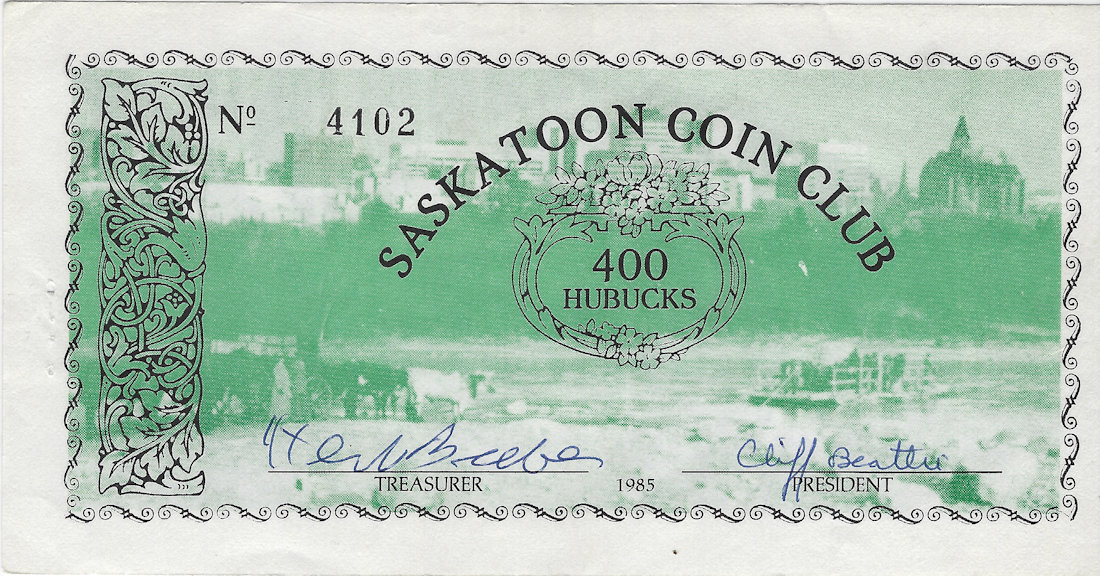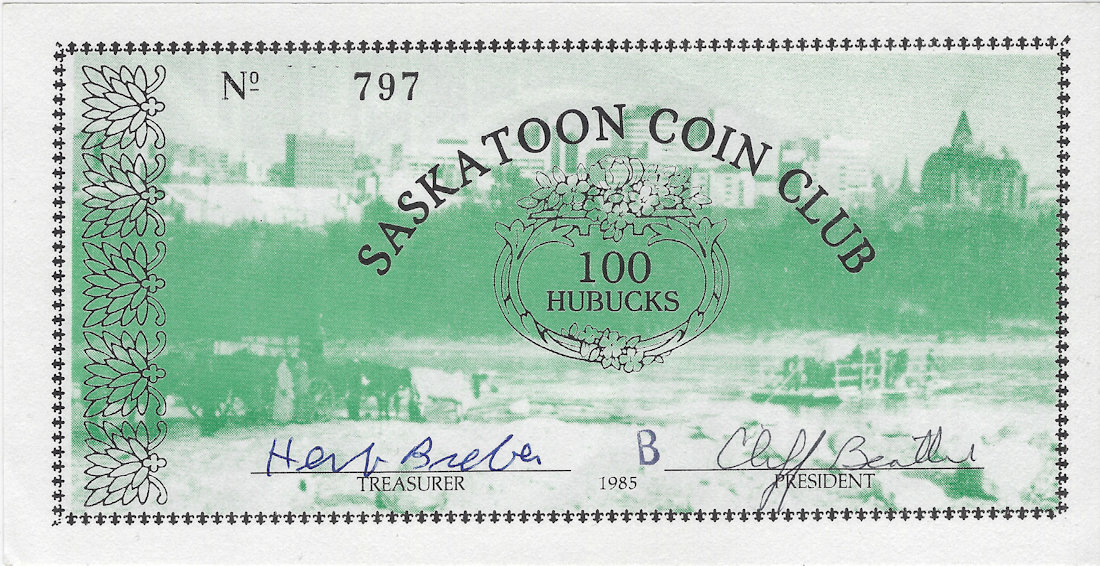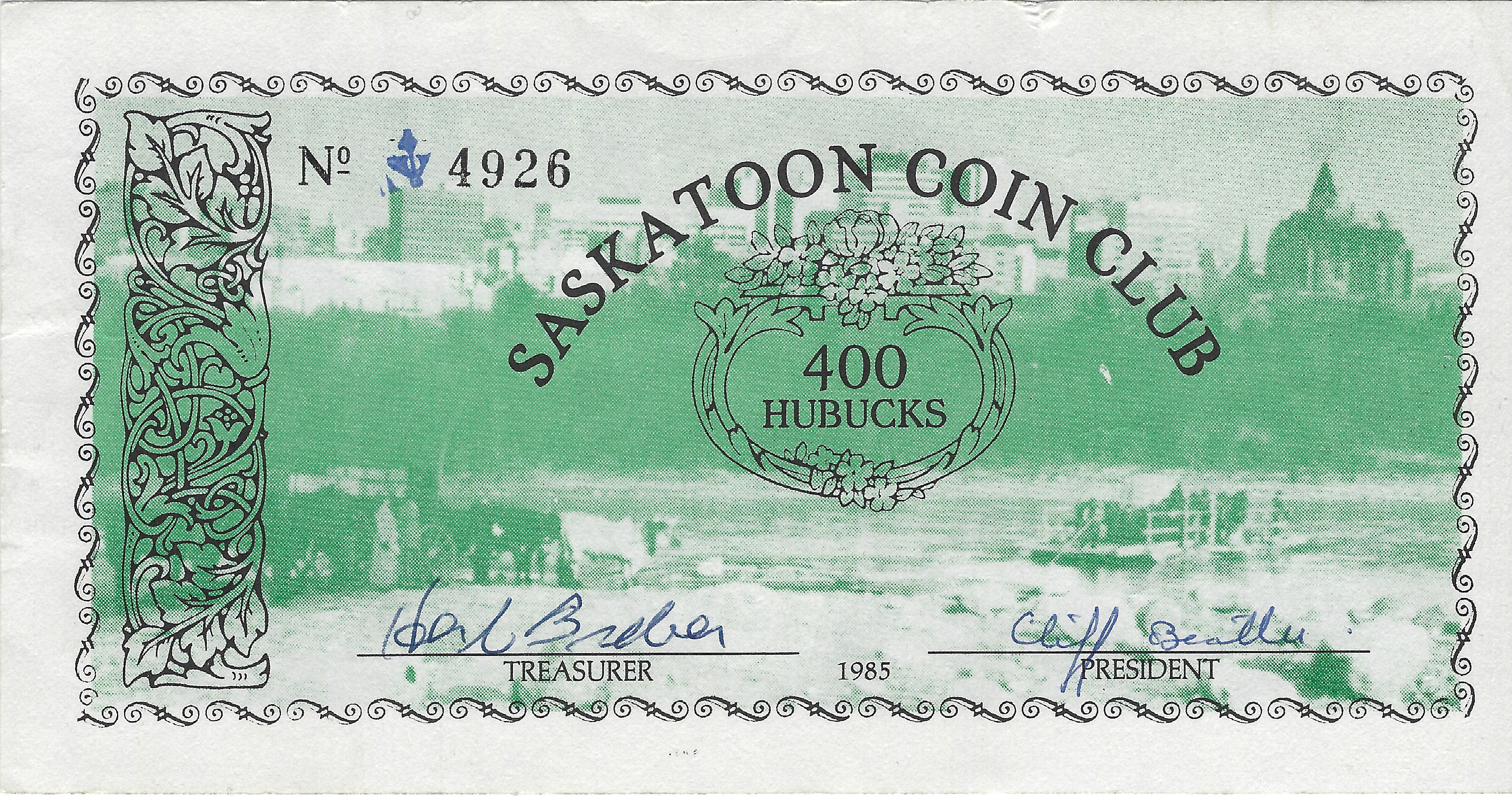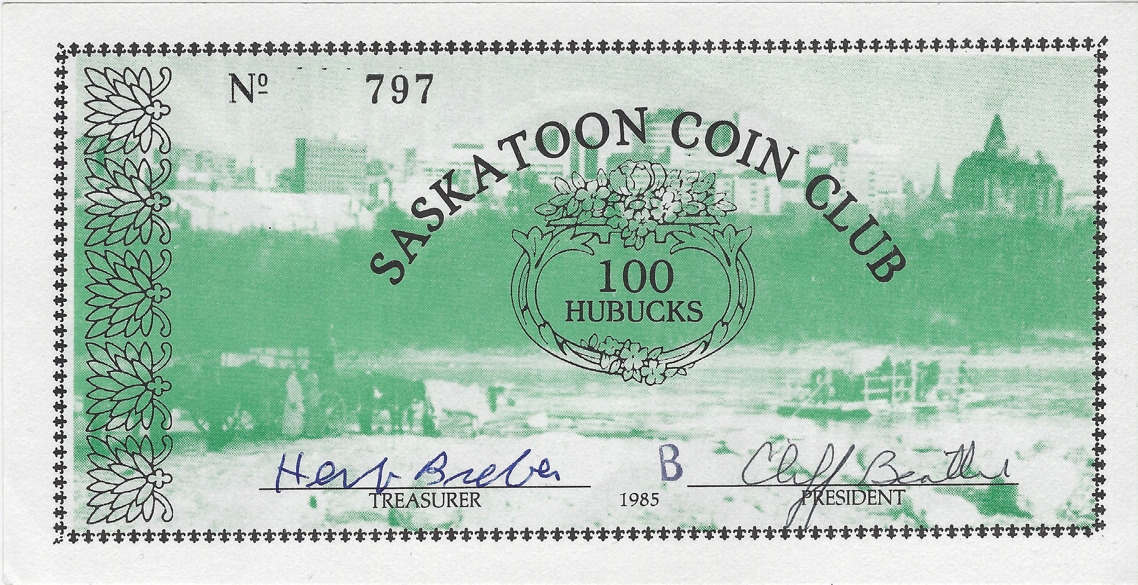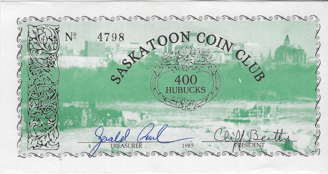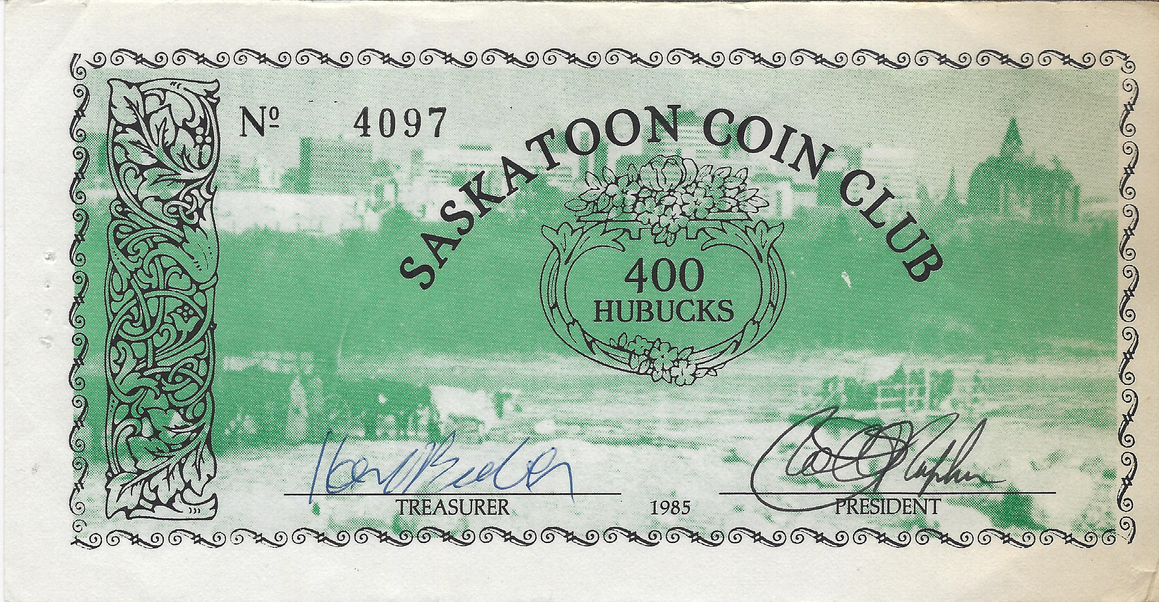 2020 marked the sixtieth anniversary of the Saskatoon Coin Club. To commemorate this event Jim MacKenzie and Cliff Beattie designed a special 5000 Hubuck note.