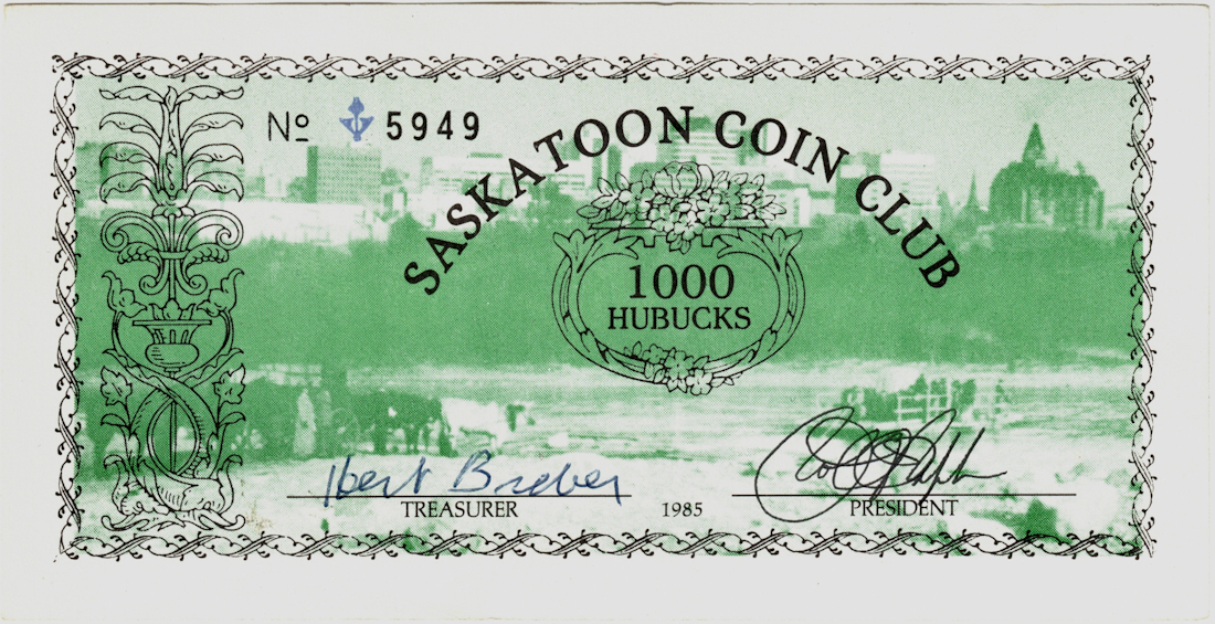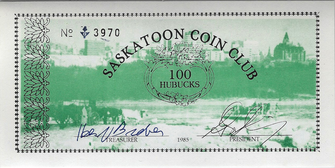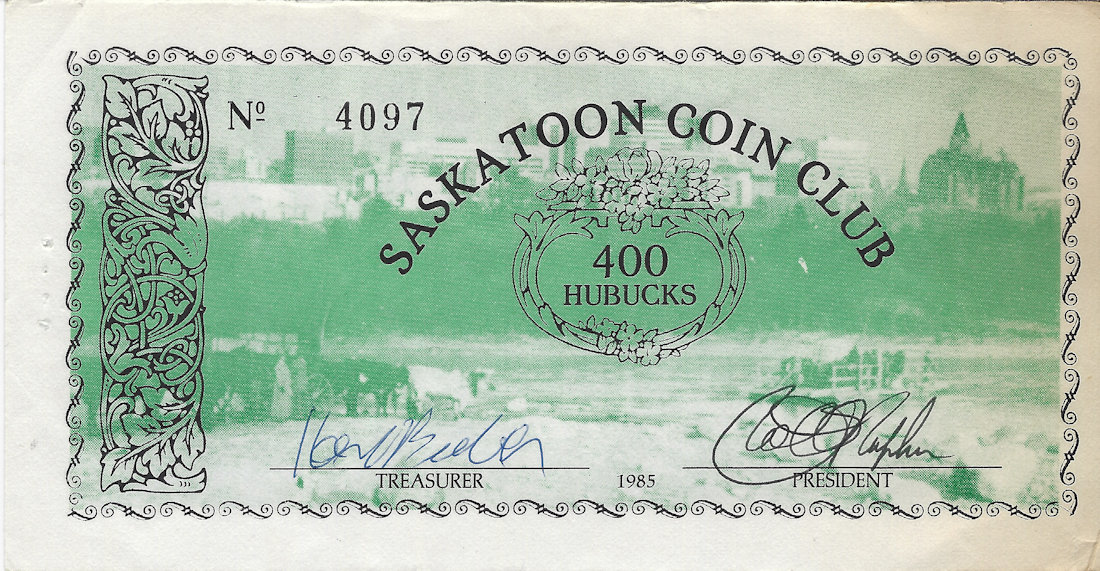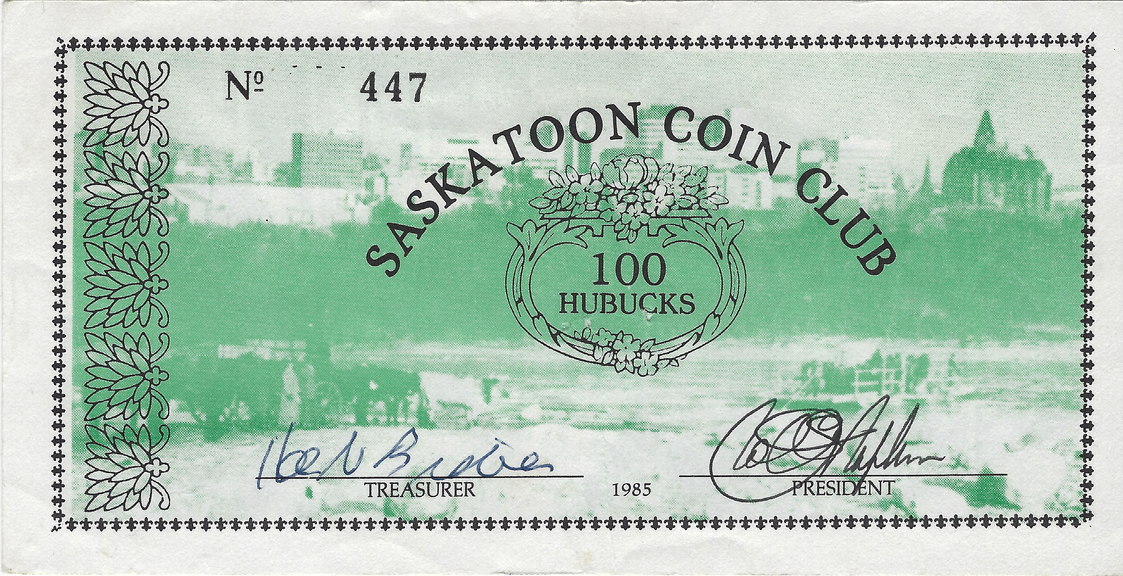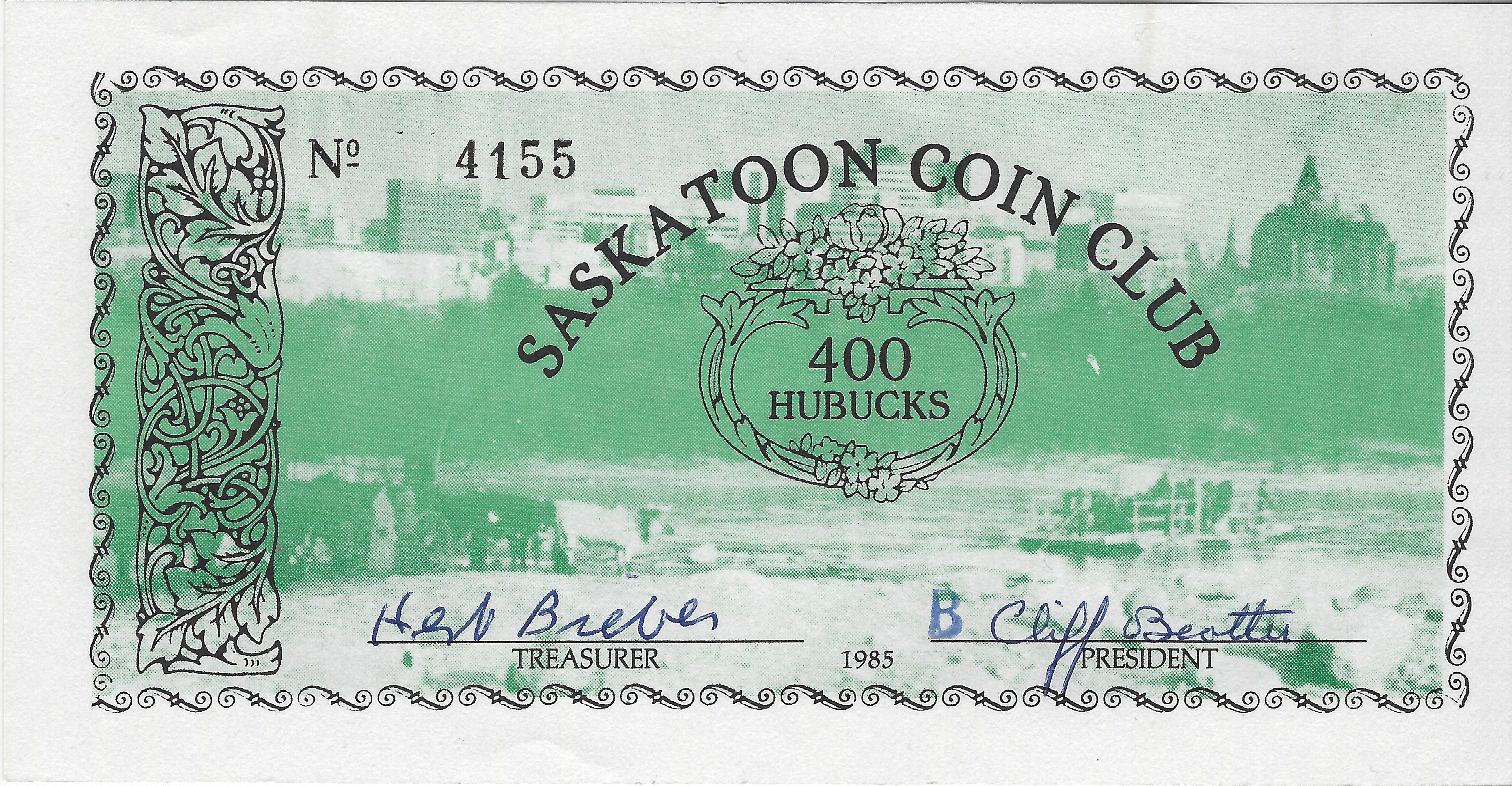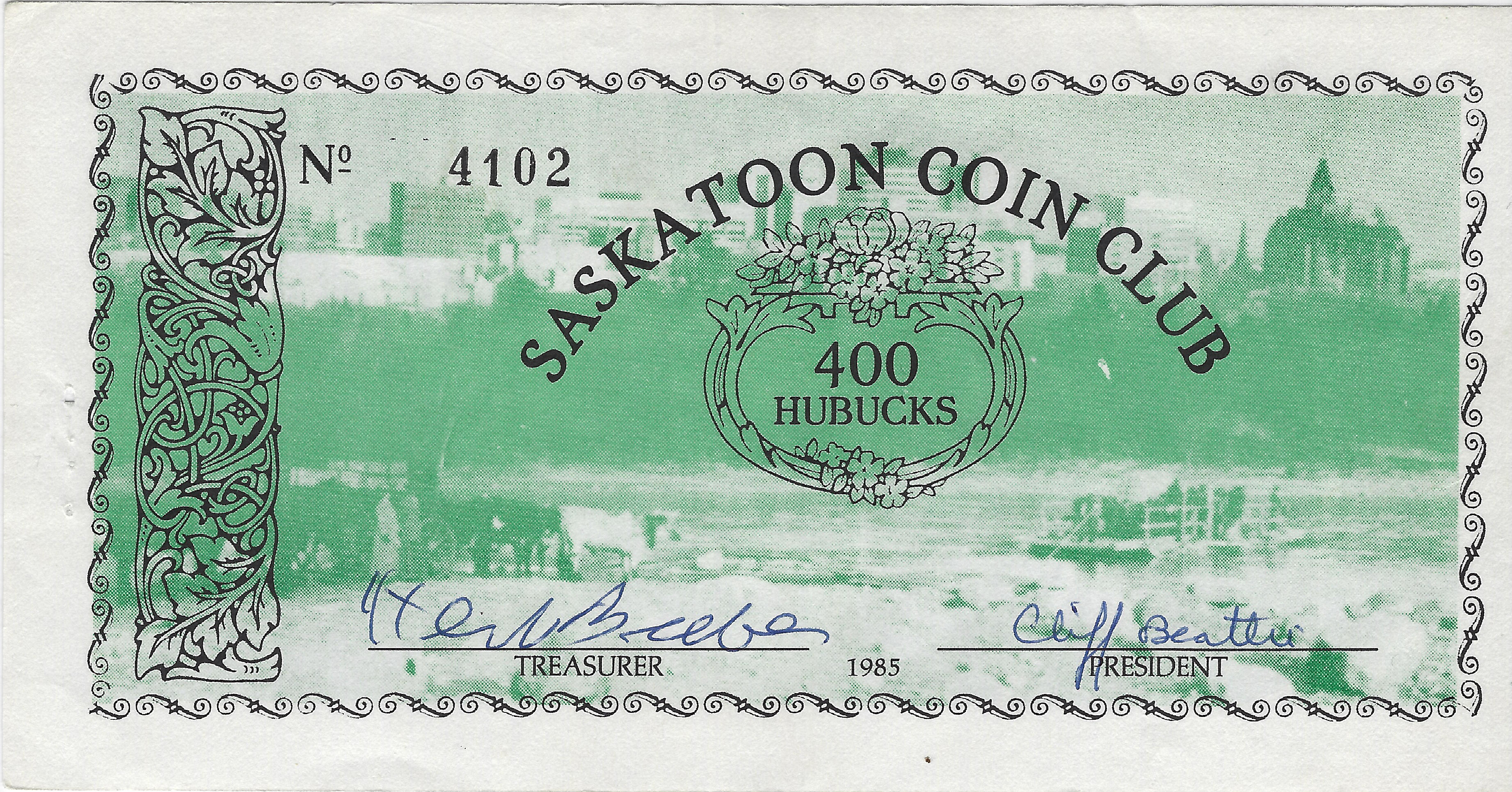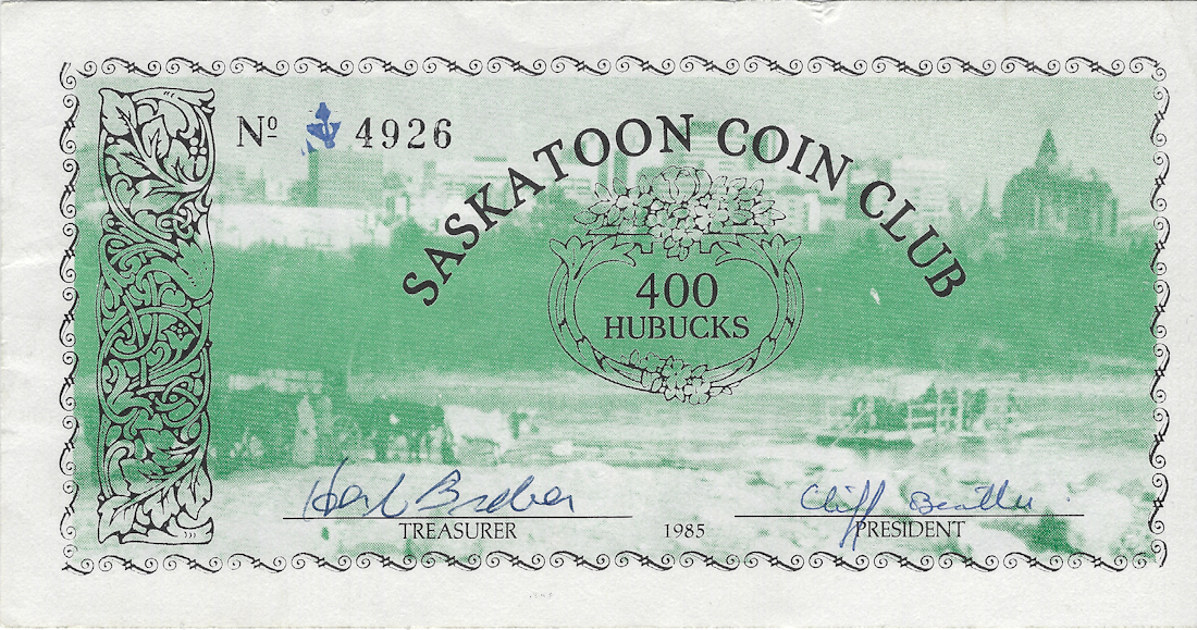 2020 marked the sixtieth anniversary of the Saskatoon Coin Club. To commemorate this event Jim MacKenzie and Cliff Beattie designed a special 5000 Hubuck note.