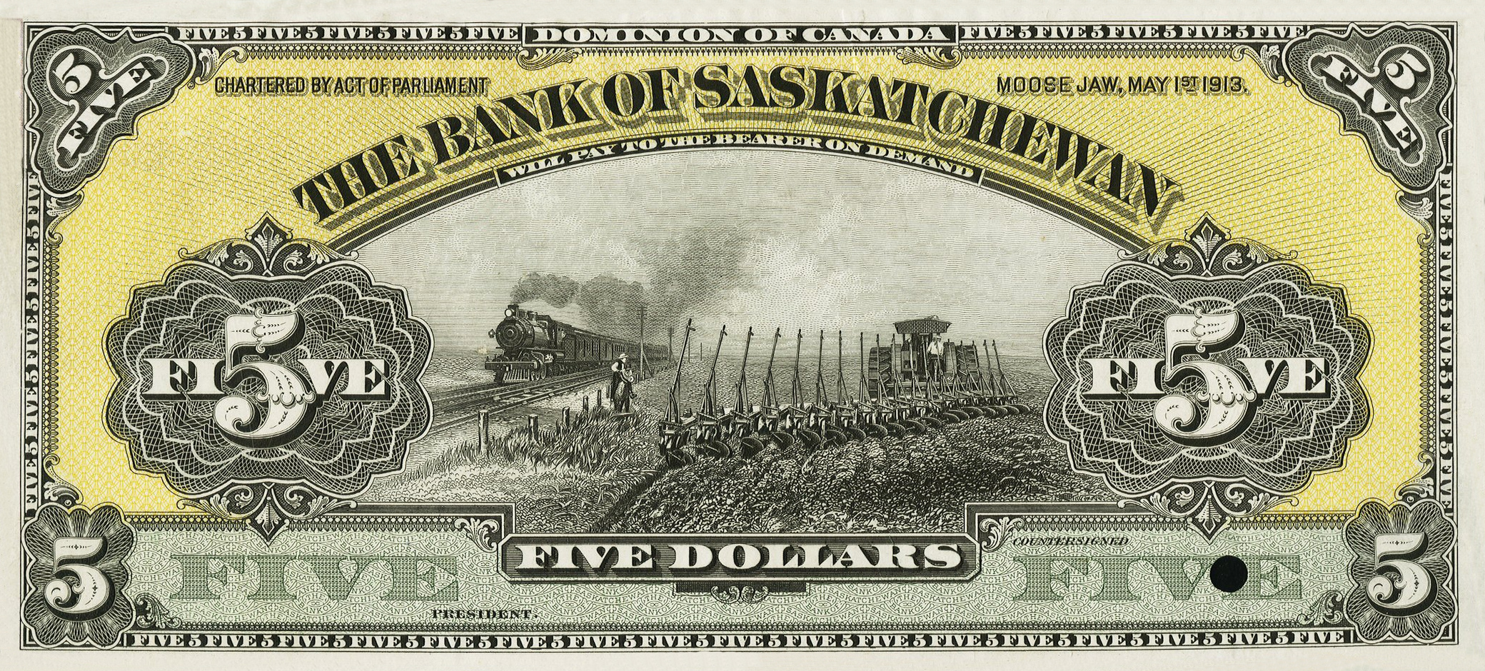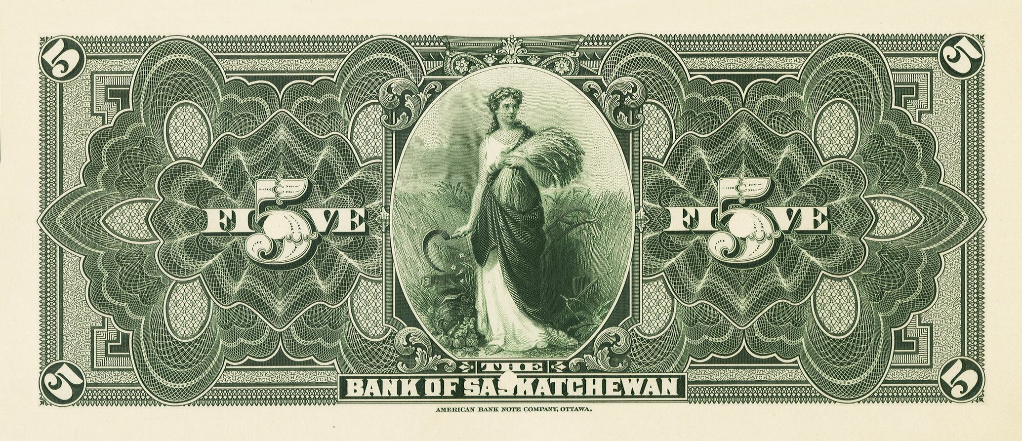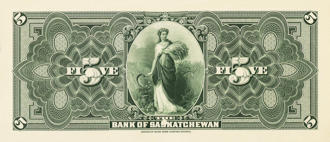 These notes use the original design for a 5 dollar note which was intended for release by the Bank of Saskatchewan, but the bank folded before any notes were issued.
