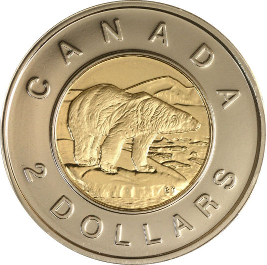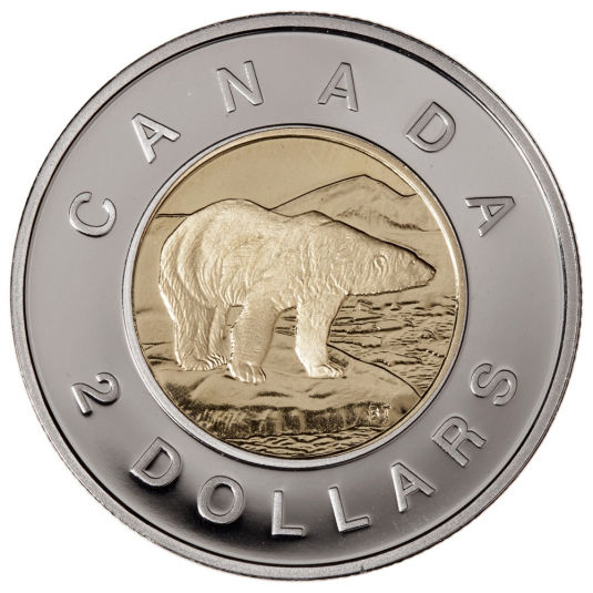 Designed by wildlife and landscape artist Brent Townsend and Ago Aarand, the 2-dollar coin, or 'Toonie', as Canadians have named it, features the image of an adult polar bear in early summer on an ice floe.