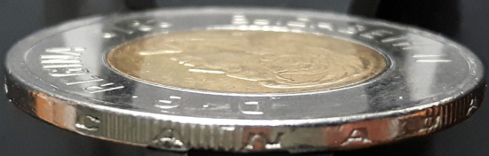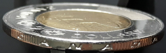 manufactured for general circulation as legal tender. The 2-dollar coin was first introduced on February 19, 1996, to replace the 2-dollar bill. The 'Toonie' has a life span approximately 20 times longer than paper currency and is manufactured using a distinctive bi-metallic coin locking mechanism patented by the Royal Canadian Mint NOTE: Click on any photo to load a much larger version of the same photo |