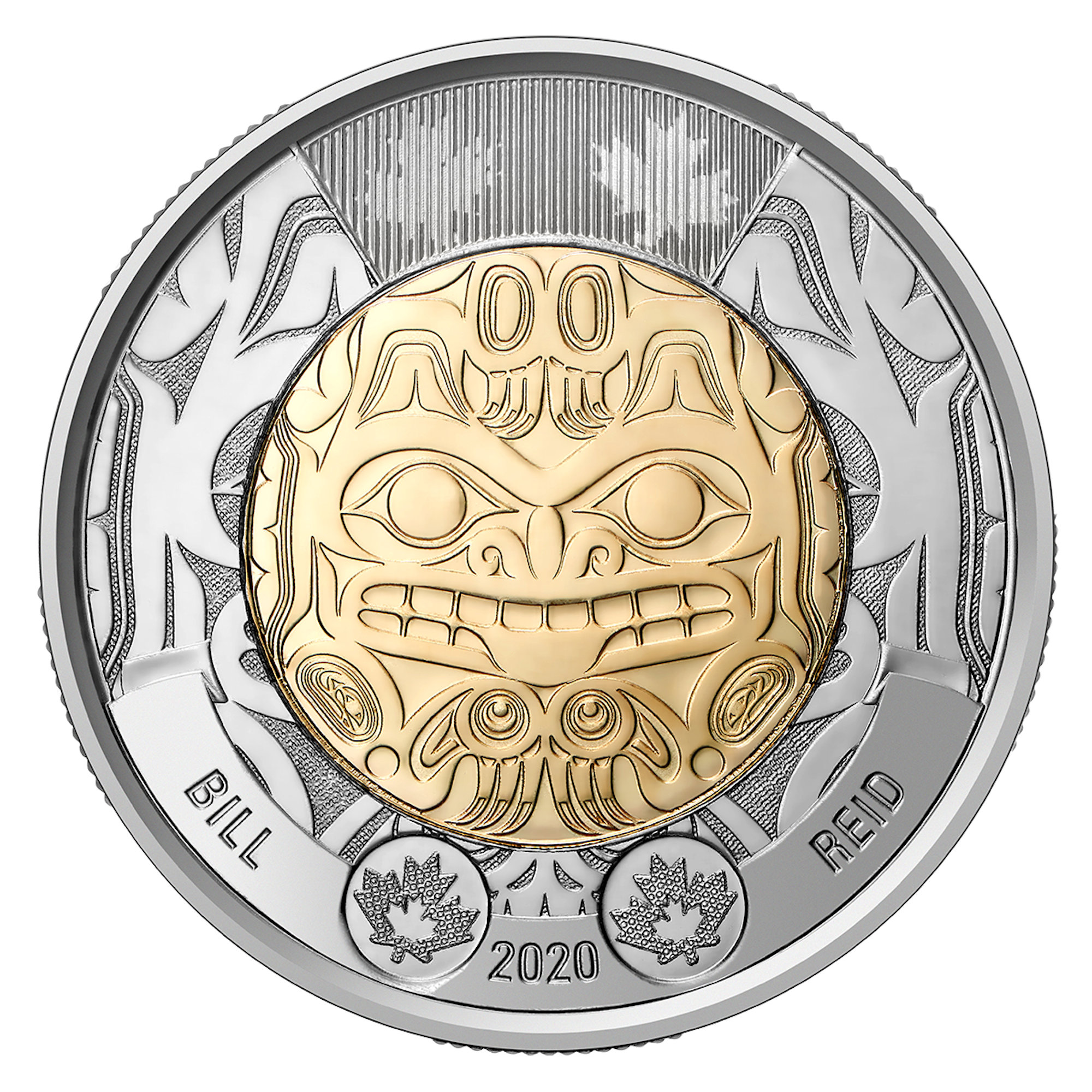 In July of 2020 the Royal Canadian Mint released a pair of commemorative two dollar coins. They celebrate the 100th Anniversary of the birth of world famous Haida artist and sculptor Iljuwas (Bill Reid) (1920-1998).