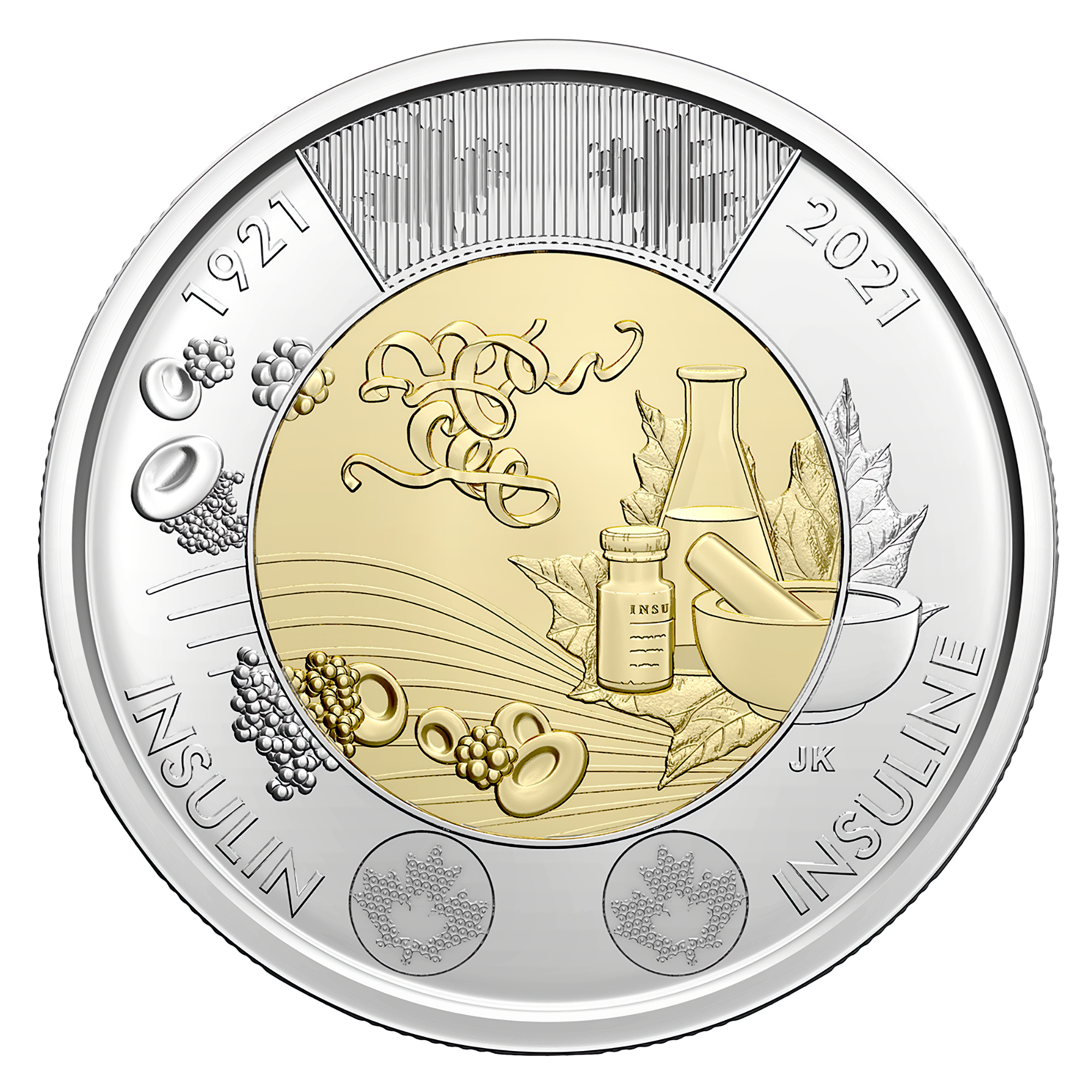In 2021 the Royal Canadian Mint released a pair of commemorative two dollar coins. They celebrate the 100th Anniversary of the discovery of insulin.