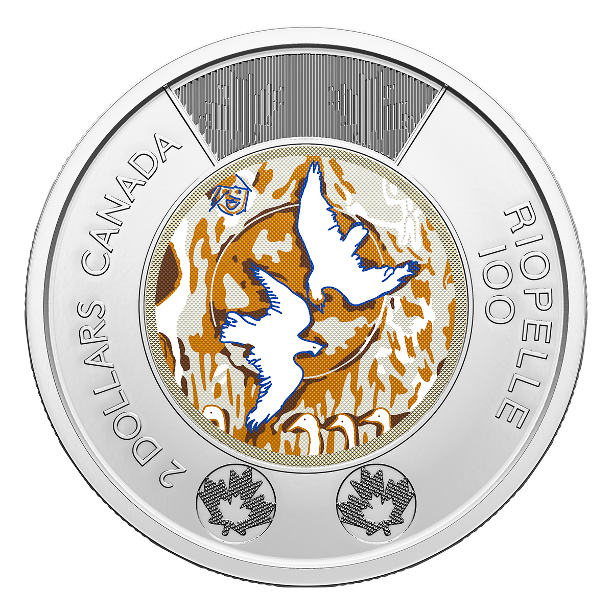 In September of 2018 the Royal Canadian Mint released a pair of commemorative two dollar coins. They commemorate the 100th Anniversary of the end of the First World War (Armistice Day). With two minutes of silence each November 11, Canadians commemorate four years that changed the course of history. It is at the exact moment of Armistice, when the first modern war suddenly came to an end in 1918, that we silently reflect upon that conflict of unprecedented scale, and all who served in a war that was supposed to "end all wars." Design: Designed by Canadian artist Laurie McGaw, the reverse designs mark the 100th anniversary of the Armistice of 1918 with a poignant pairing of two symbols of remembrance. Within the brass-plated inner core, a soldier's helmet represents the end of the First World War and serves as a solemn reminder of the many lives lost during history's first mechanized war. Below the helmet lies a large poppy, the official bloom of remembrance. - In the first version of this coin the poppy's bright scarlet colour is re-created. Two more poppies are engraved on the nickel-plated outer ring, which includes a special-engraved security feature, along with a banner bearing the bilingual words "REMEMBER", "SOUVENIR" and the year "2018". - The second version of this coin is identical to the coloured one with the exception of the main poppy. Instead of being coloured, the poppy's details have been engraved. |