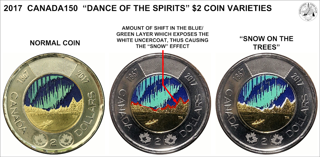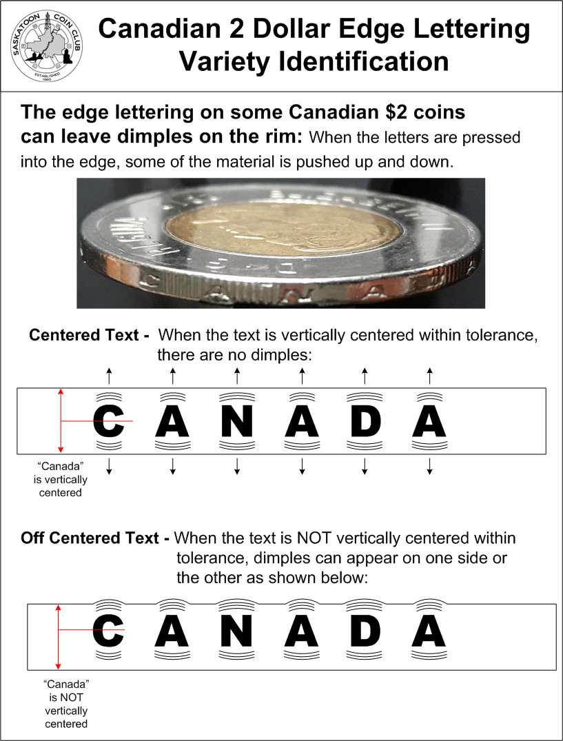 When the new security features were added to the two dollar coins in 2012, Edge-lettering of the words "CANADA" and "2 DOLLARS" were engraved along the coin's outer edge.