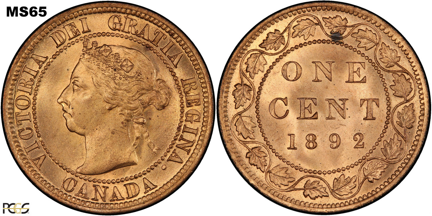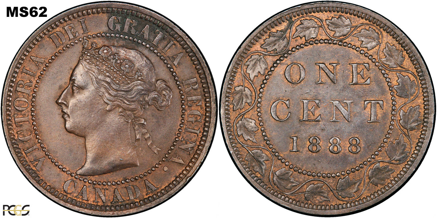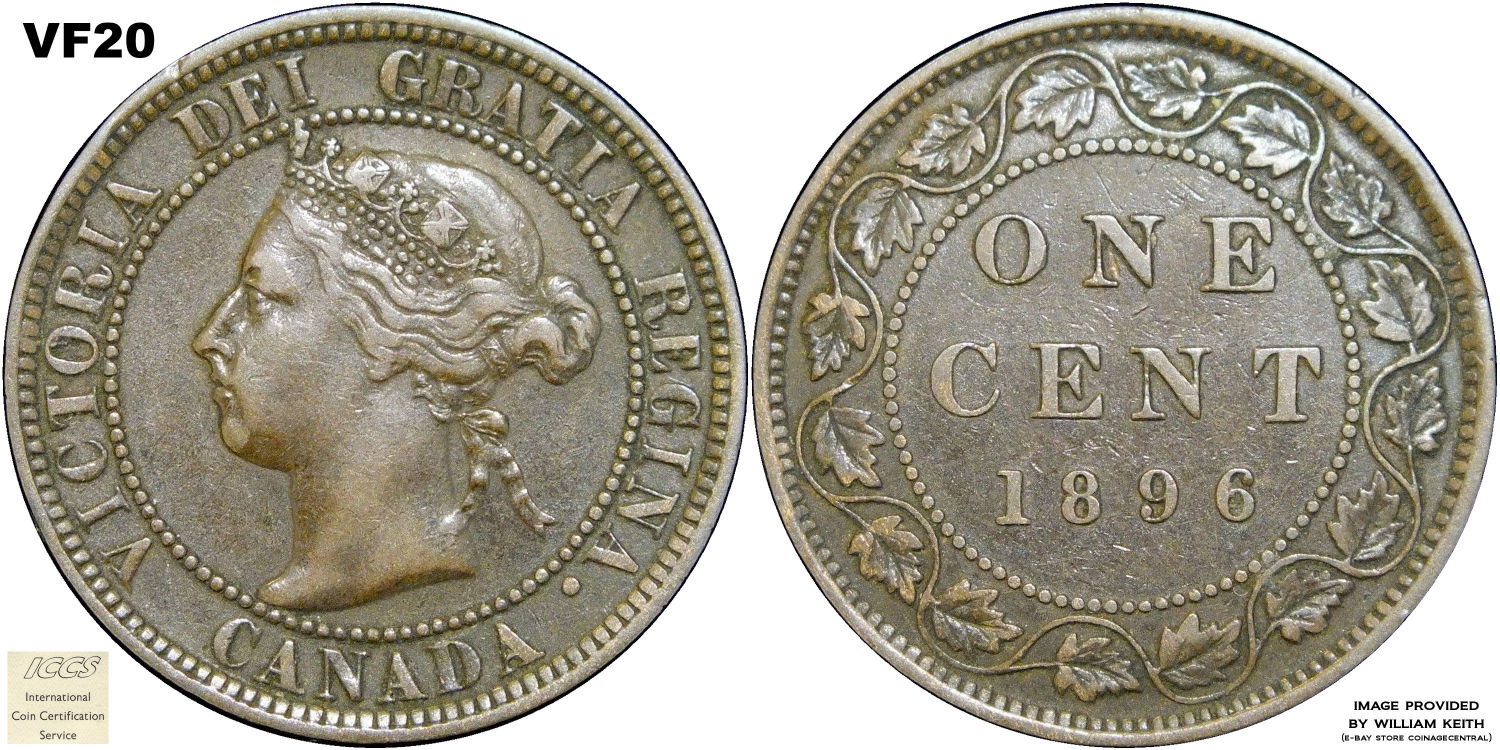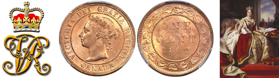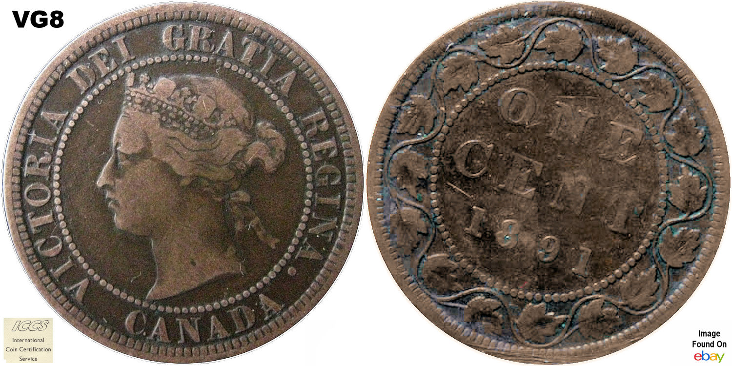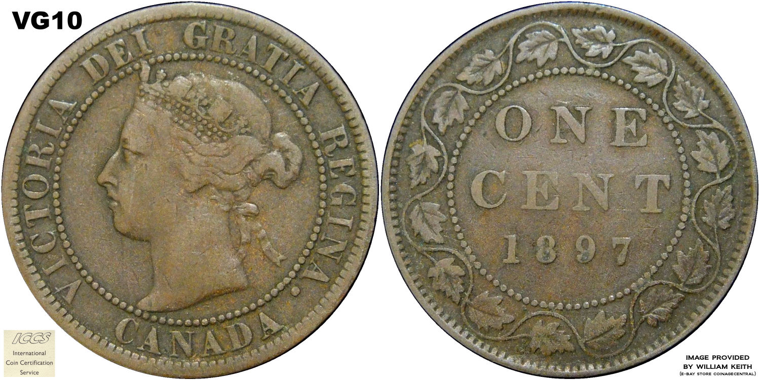 This page describes the criteria used to assign grades to 1 cent Canadian circulation coins which use the "Diademed" portrait of Queen Victoria, issued between 1876 and 1901. It also shows sample images of each grade. All photos used here were taken of coins that have been professionally graded by companies like PCGS, NGC, ICCS, CCCS, ANACS, or ICG. NOTE: Click on any photo to load a much larger version of both the obverse and reverse sides of the graded coin. Once that photo has loaded on screen, if you click it again you will see a huge photo which allows you to see every fine detail. |