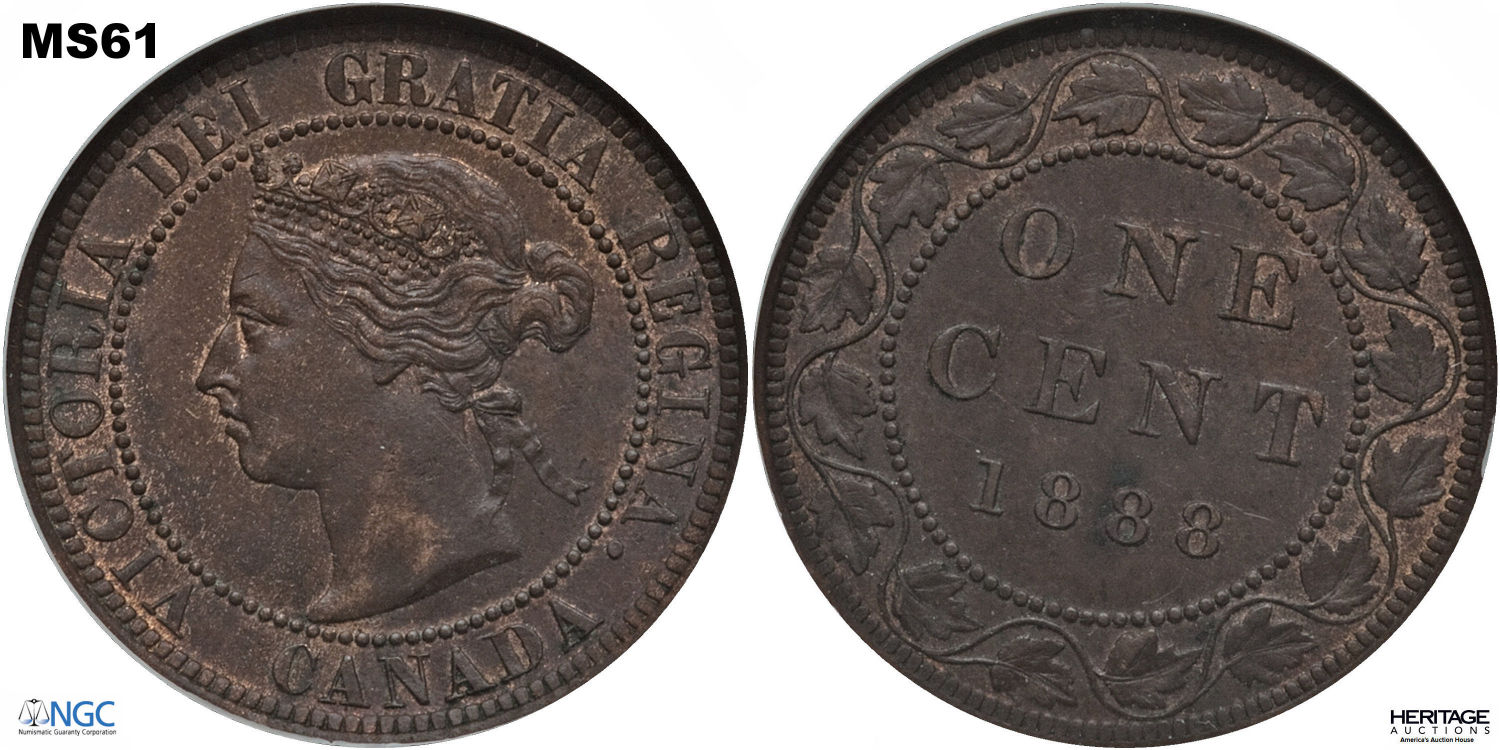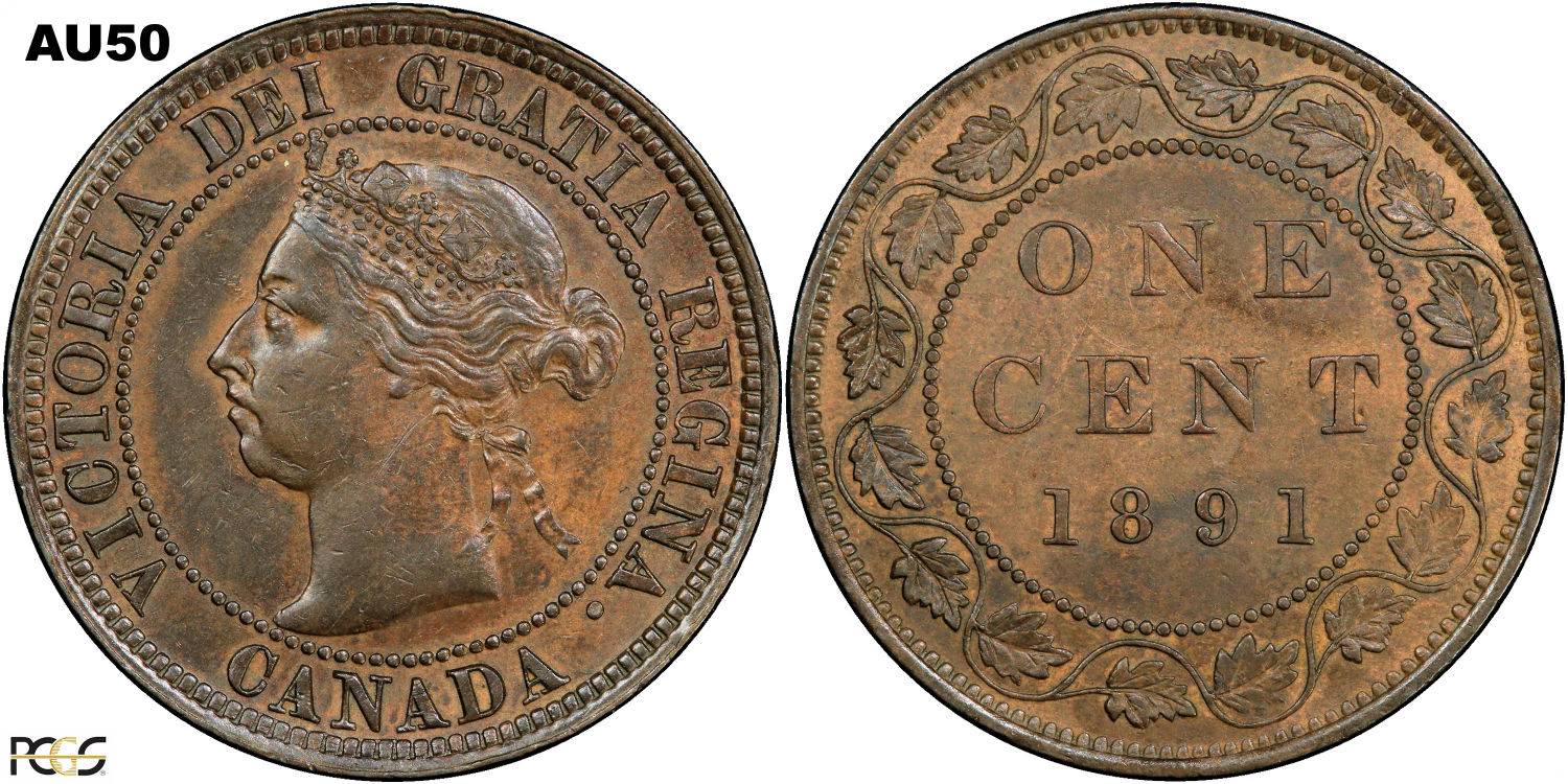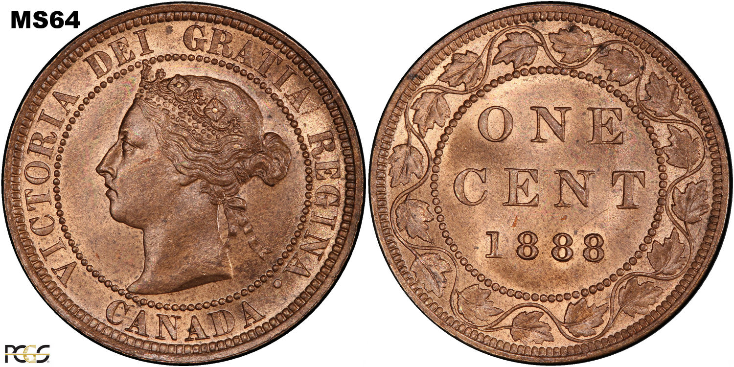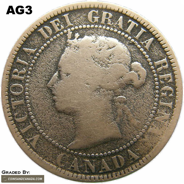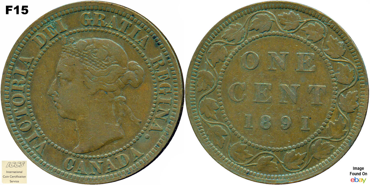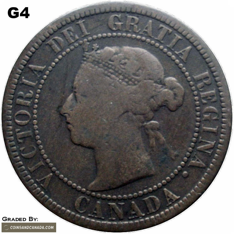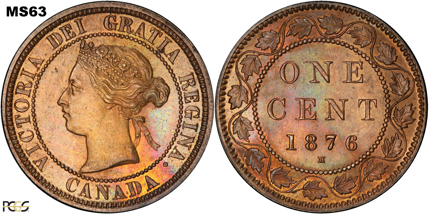 This page describes the criteria used to assign grades to 1 cent Canadian circulation coins which use the "Diademed" portrait of Queen Victoria, issued between 1876 and 1901. It also shows sample images of each grade. All photos used here were taken of coins that have been professionally graded by companies like PCGS, NGC, ICCS, CCCS, ANACS, or ICG. NOTE: Click on any photo to load a much larger version of both the obverse and reverse sides of the graded coin. Once that photo has loaded on screen, if you click it again you will see a huge photo which allows you to see every fine detail. |