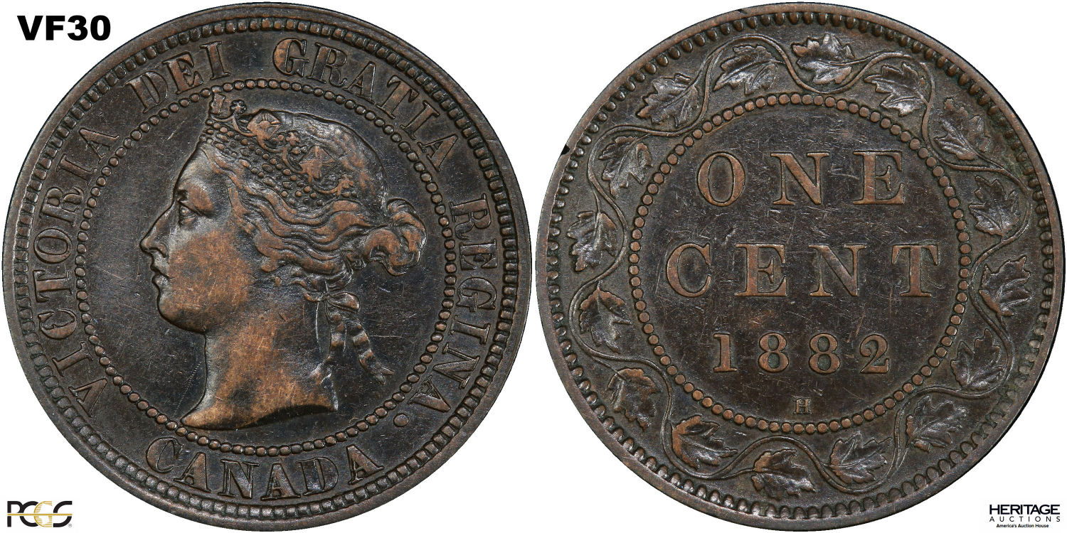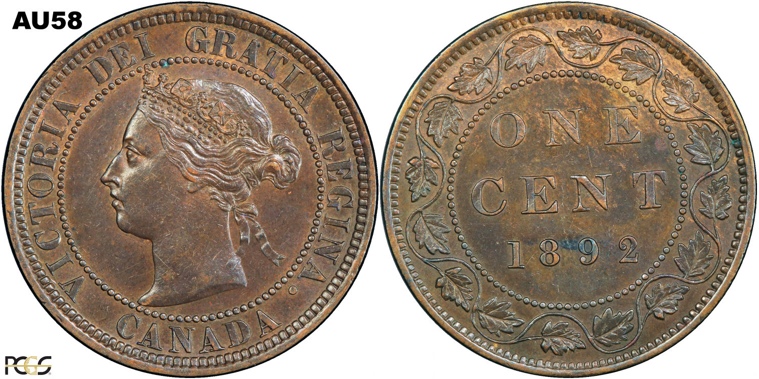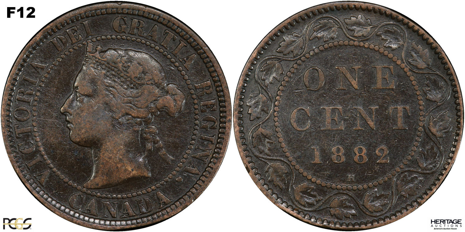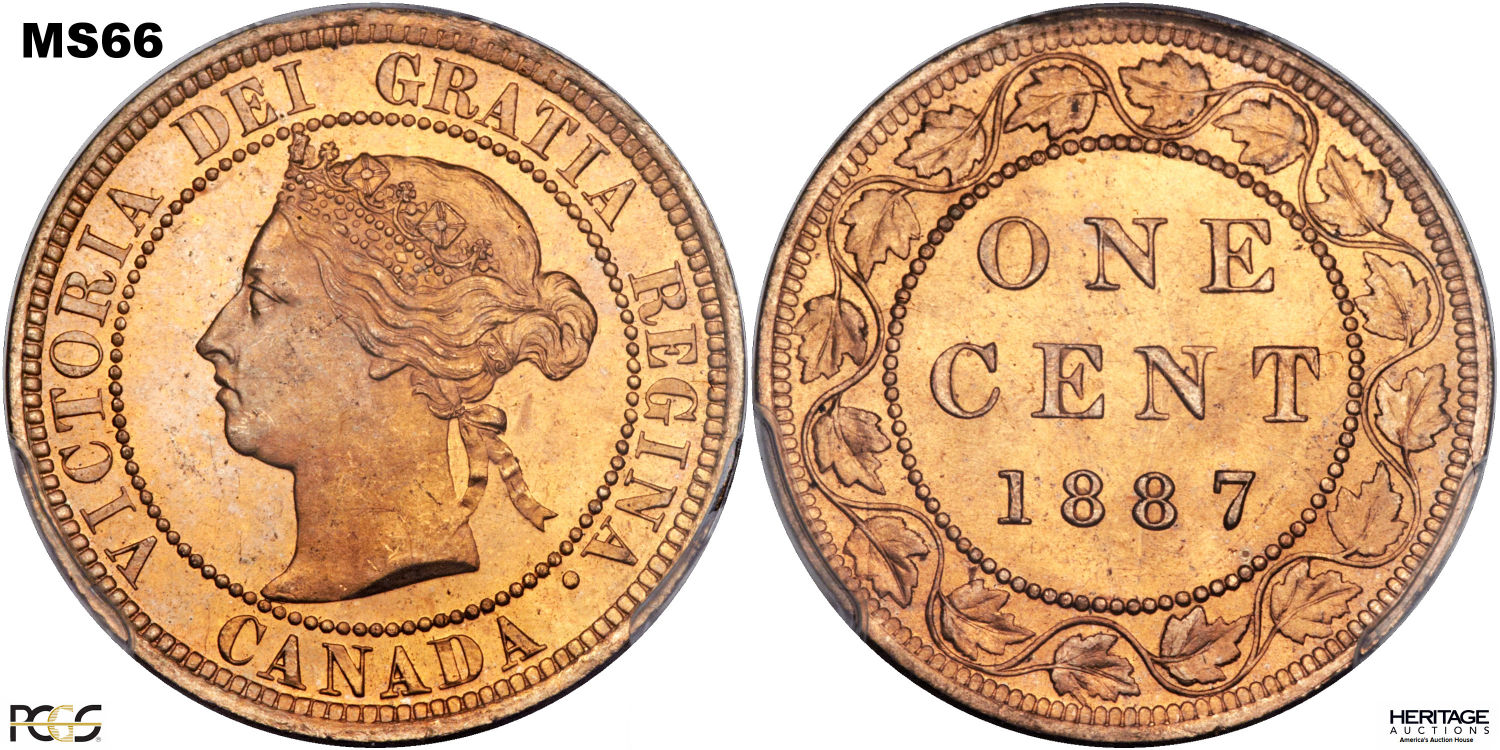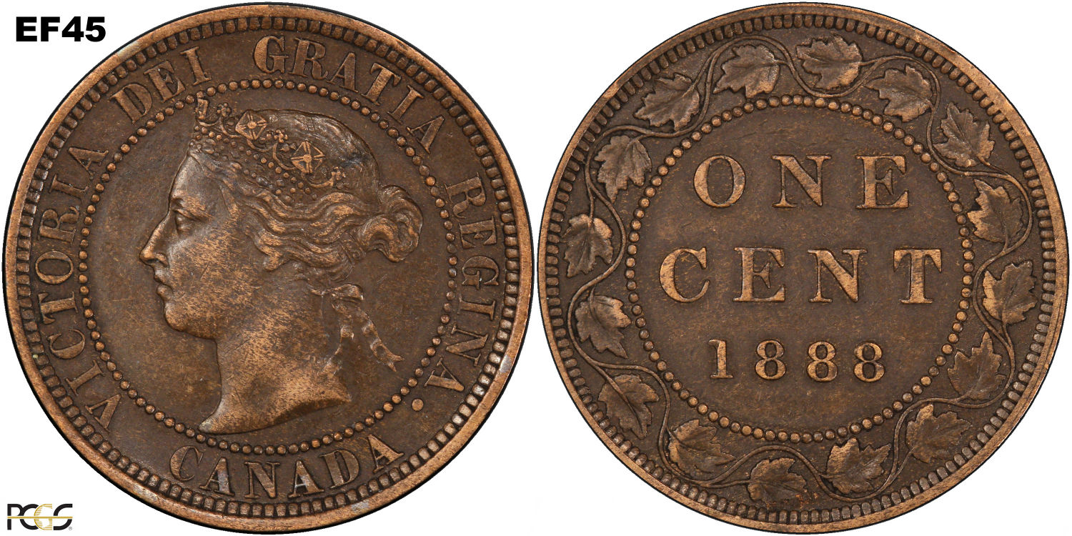 This page describes the criteria used to assign grades to 1 cent Canadian circulation coins which use the "Diademed" portrait of Queen Victoria, issued between 1876 and 1901. It also shows sample images of each grade. All photos used here were taken of coins that have been professionally graded by companies like PCGS, NGC, ICCS, CCCS, ANACS, or ICG. NOTE: Click on any photo to load a much larger version of both the obverse and reverse sides of the graded coin. Once that photo has loaded on screen, if you click it again you will see a huge photo which allows you to see every fine detail. |