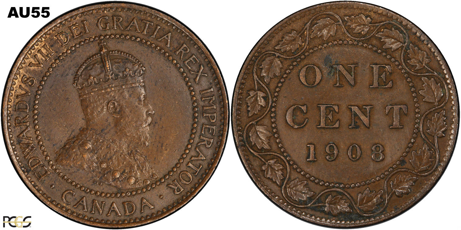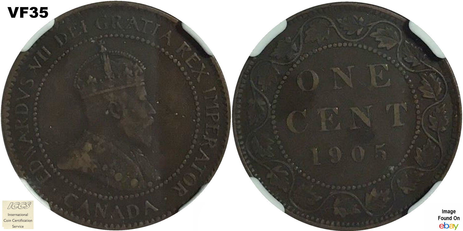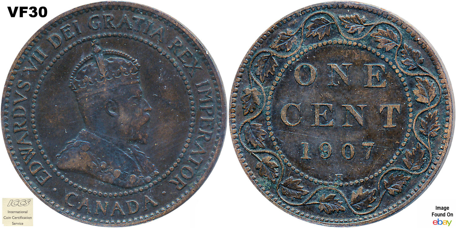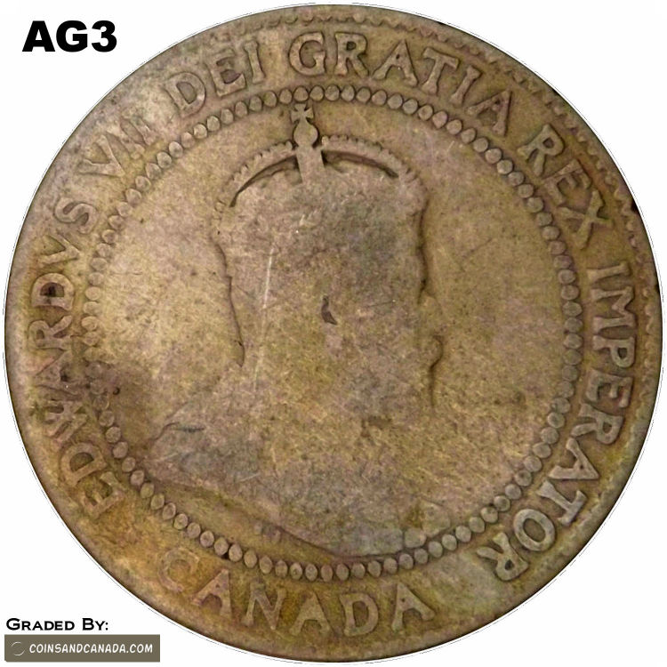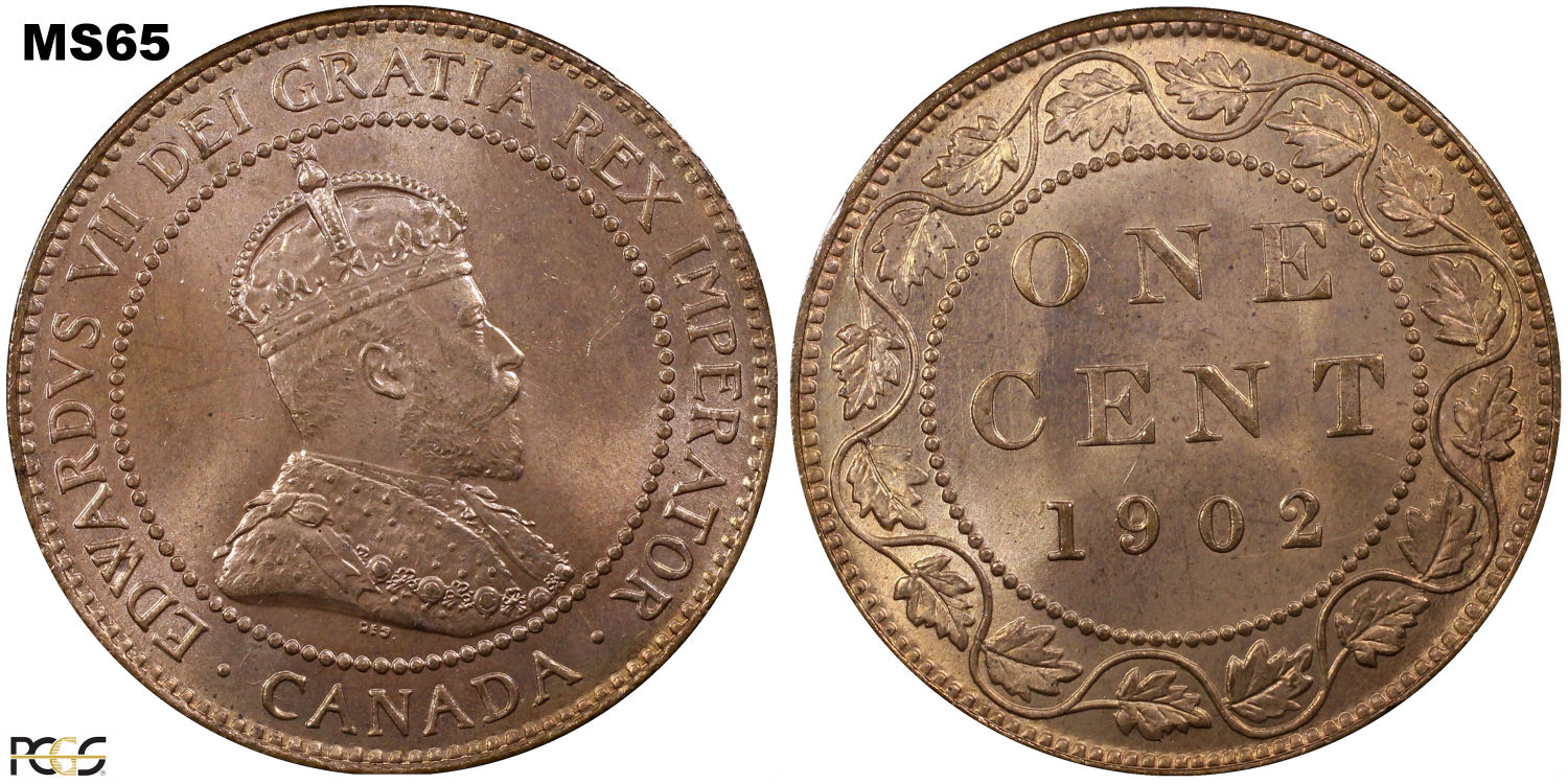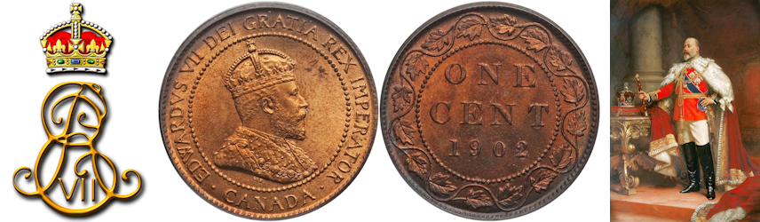 This page describes the criteria used to assign grades to 1 cent Canadian circulation coins issued between 1902 and 1910, which use the portrait of King Edward VII. It also shows sample images of each grade. All photos used here were taken of coins that have been professionally graded by companies like PCGS, NGC, ICCS, CCCS, ANACS, or ICG. NOTE: Click on any photo to load a much larger version of both the obverse and reverse sides of the graded coin. Once that photo has loaded on screen, if you click it again you will see a huge photo which allows you to see every fine detail. |