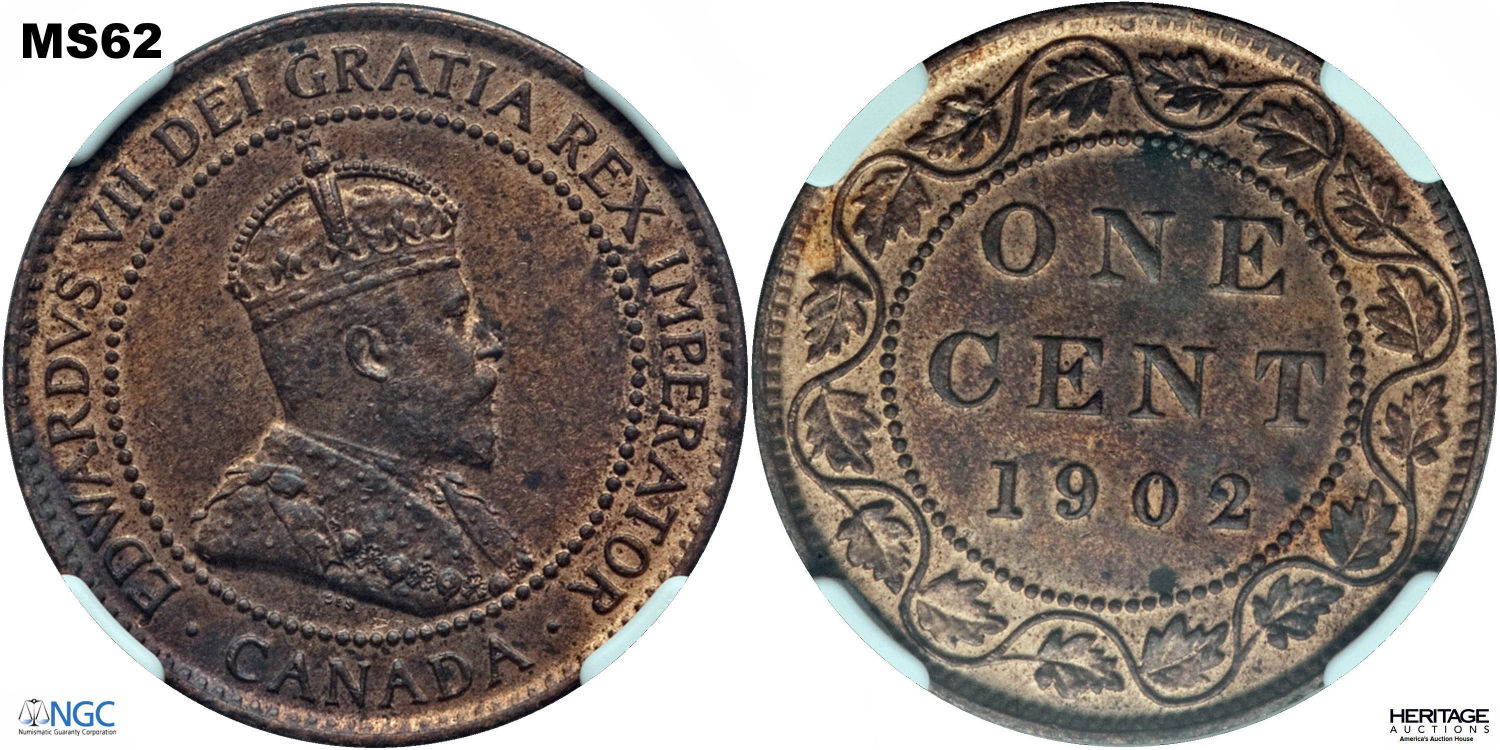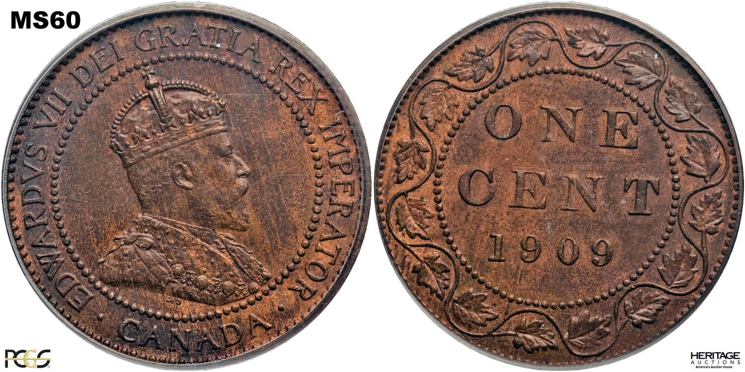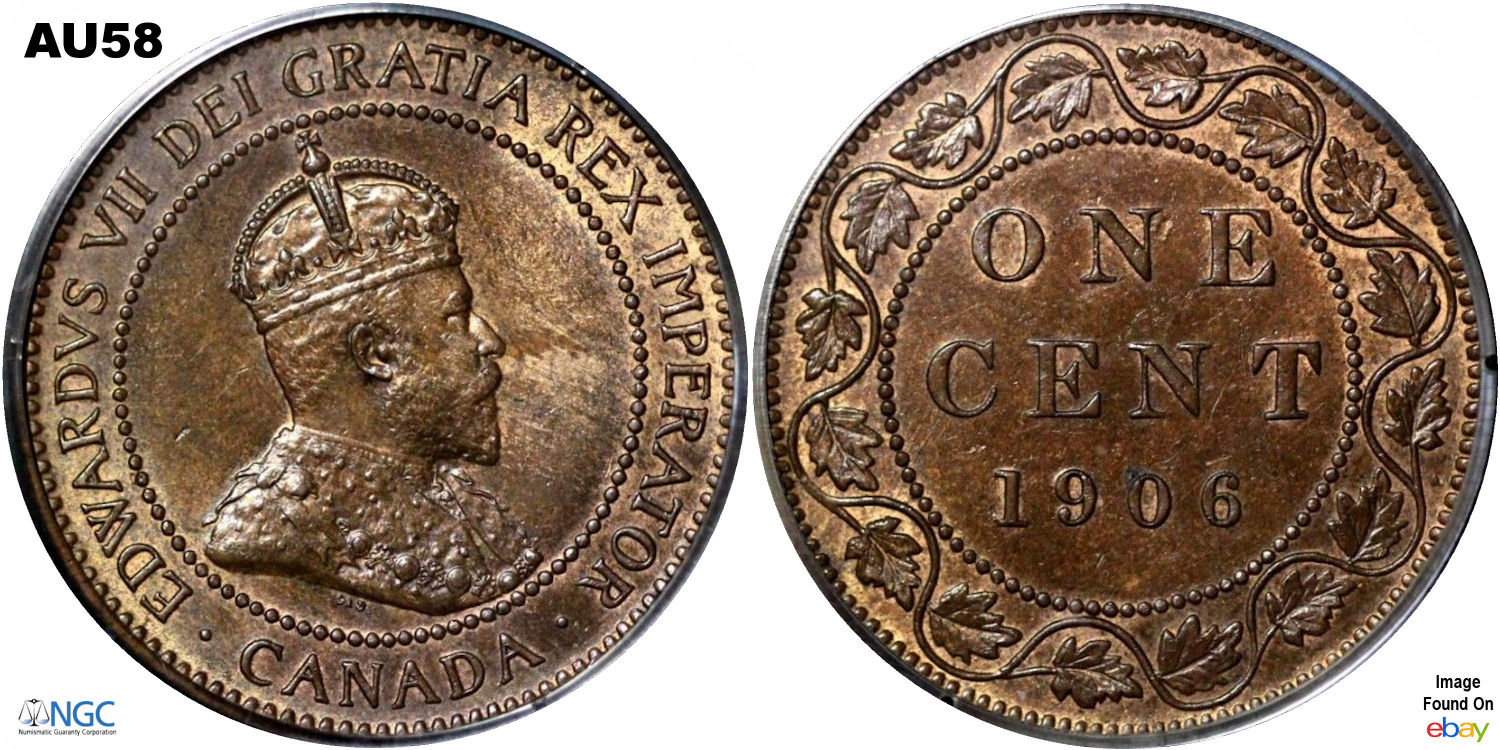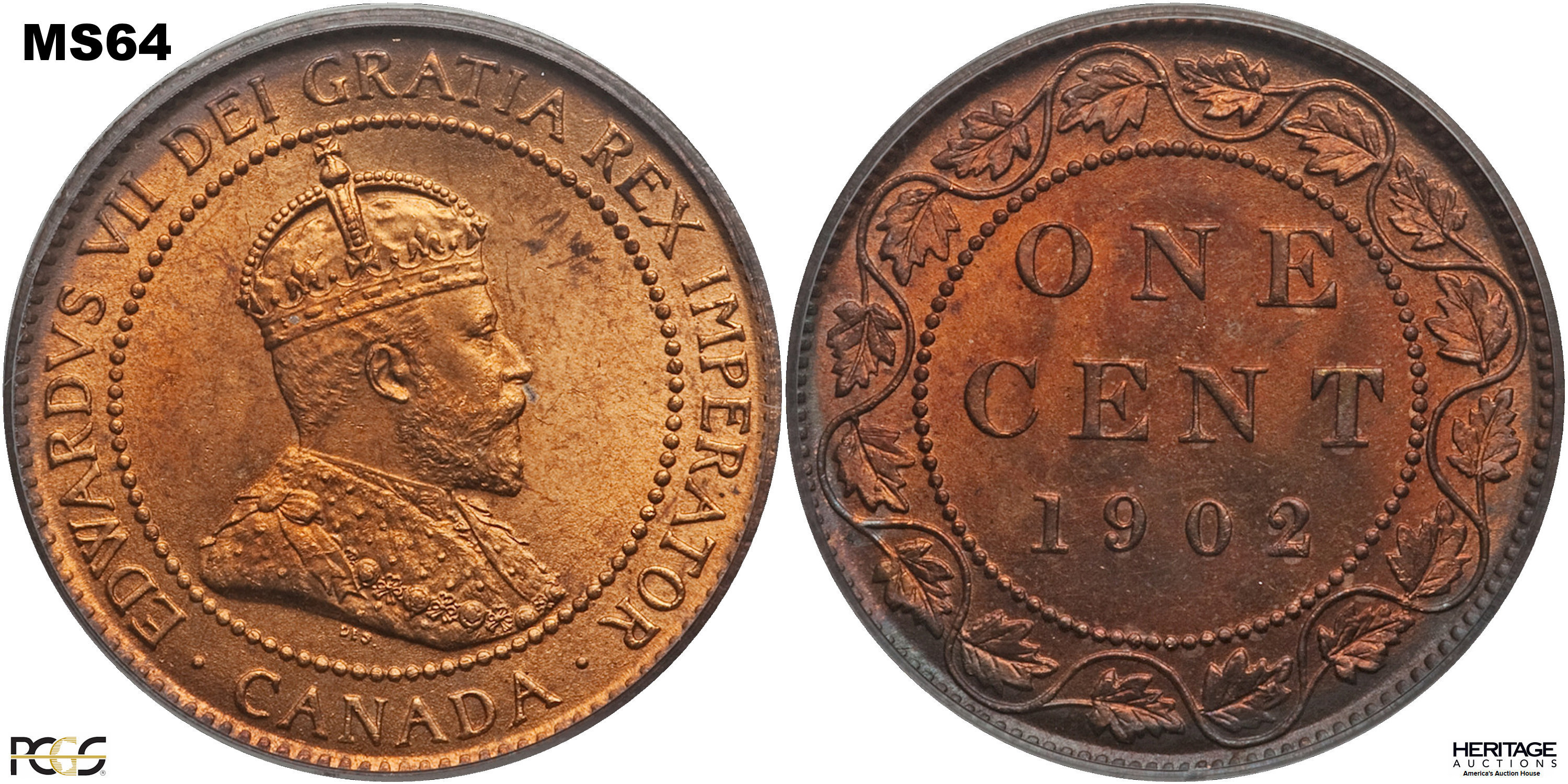 This page describes the criteria used to assign grades to 1 cent Canadian circulation coins issued between 1902 and 1910, which use the portrait of King Edward VII. It also shows sample images of each grade. All photos used here were taken of coins that have been professionally graded by companies like PCGS, NGC, ICCS, CCCS, ANACS, or ICG. NOTE: Click on any photo to load a much larger version of both the obverse and reverse sides of the graded coin. Once that photo has loaded on screen, if you click it again you will see a huge photo which allows you to see every fine detail. |