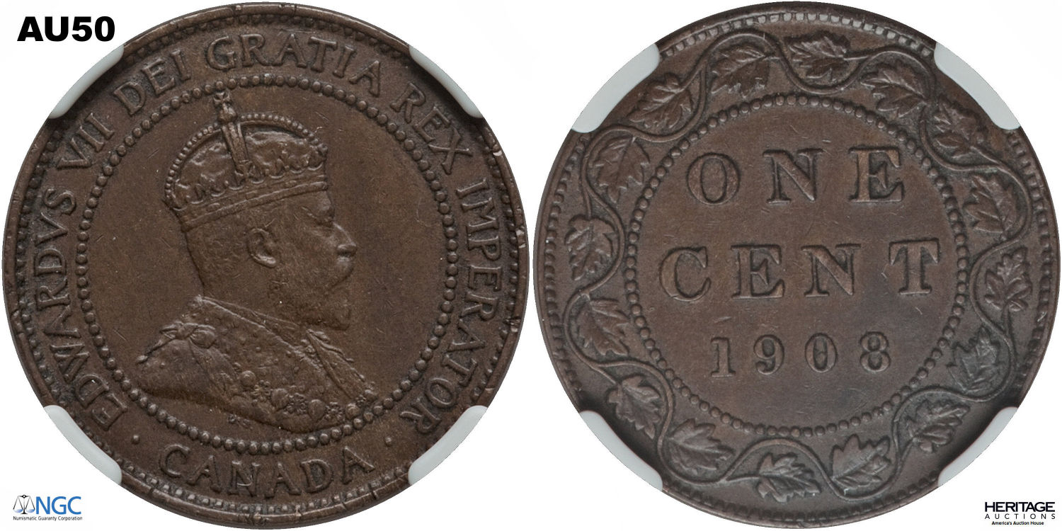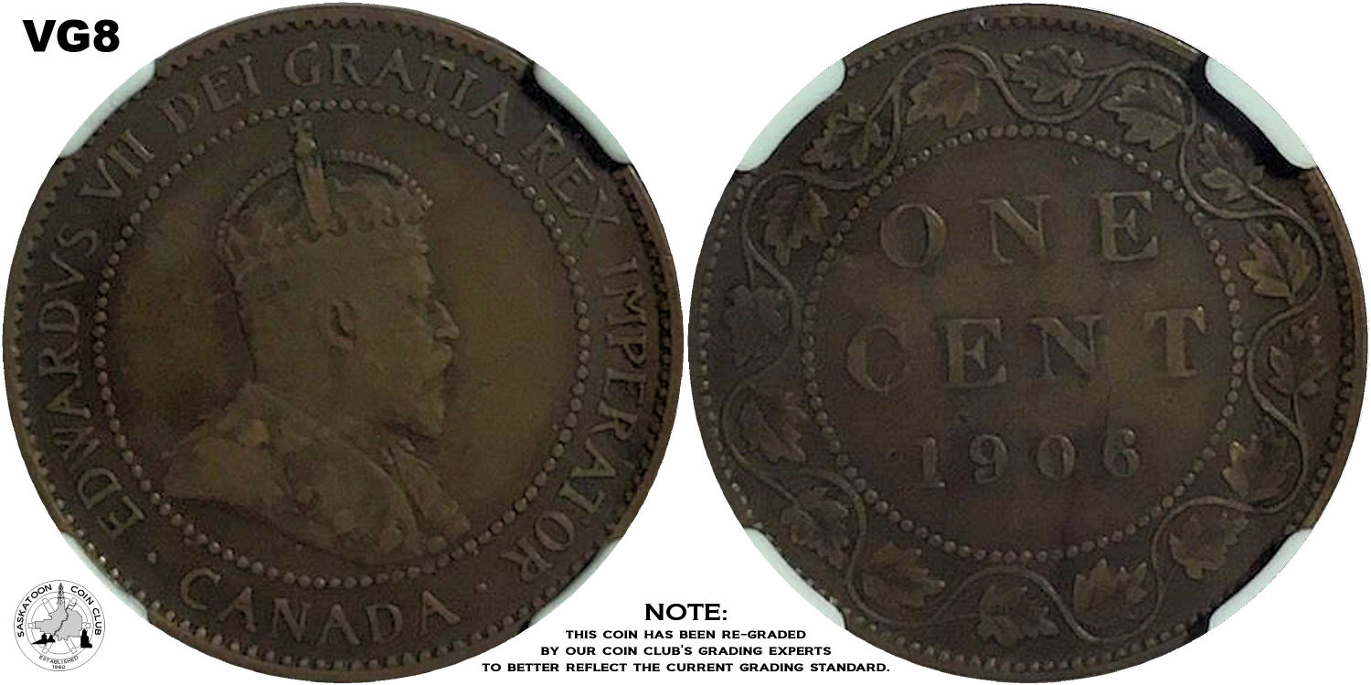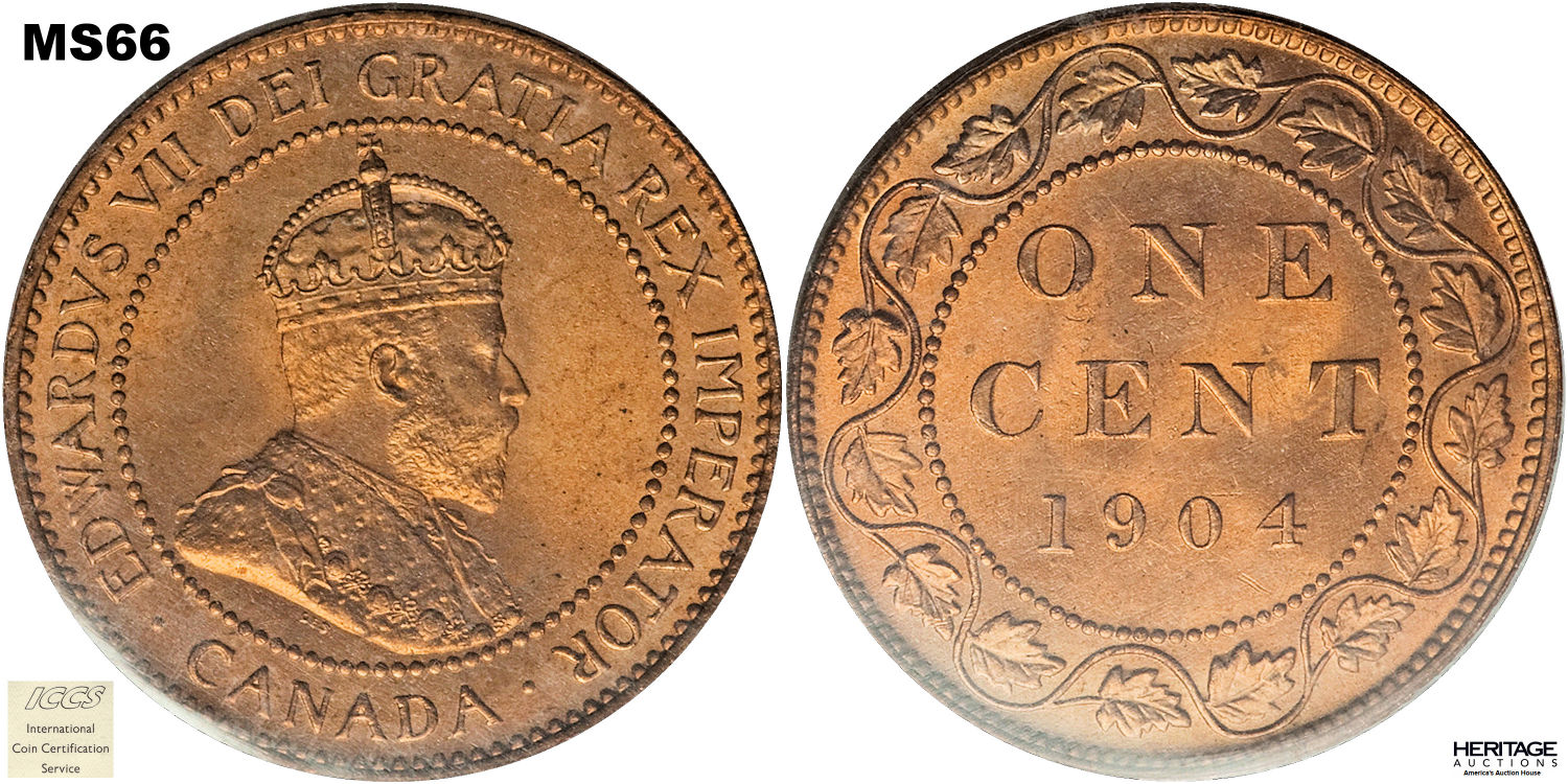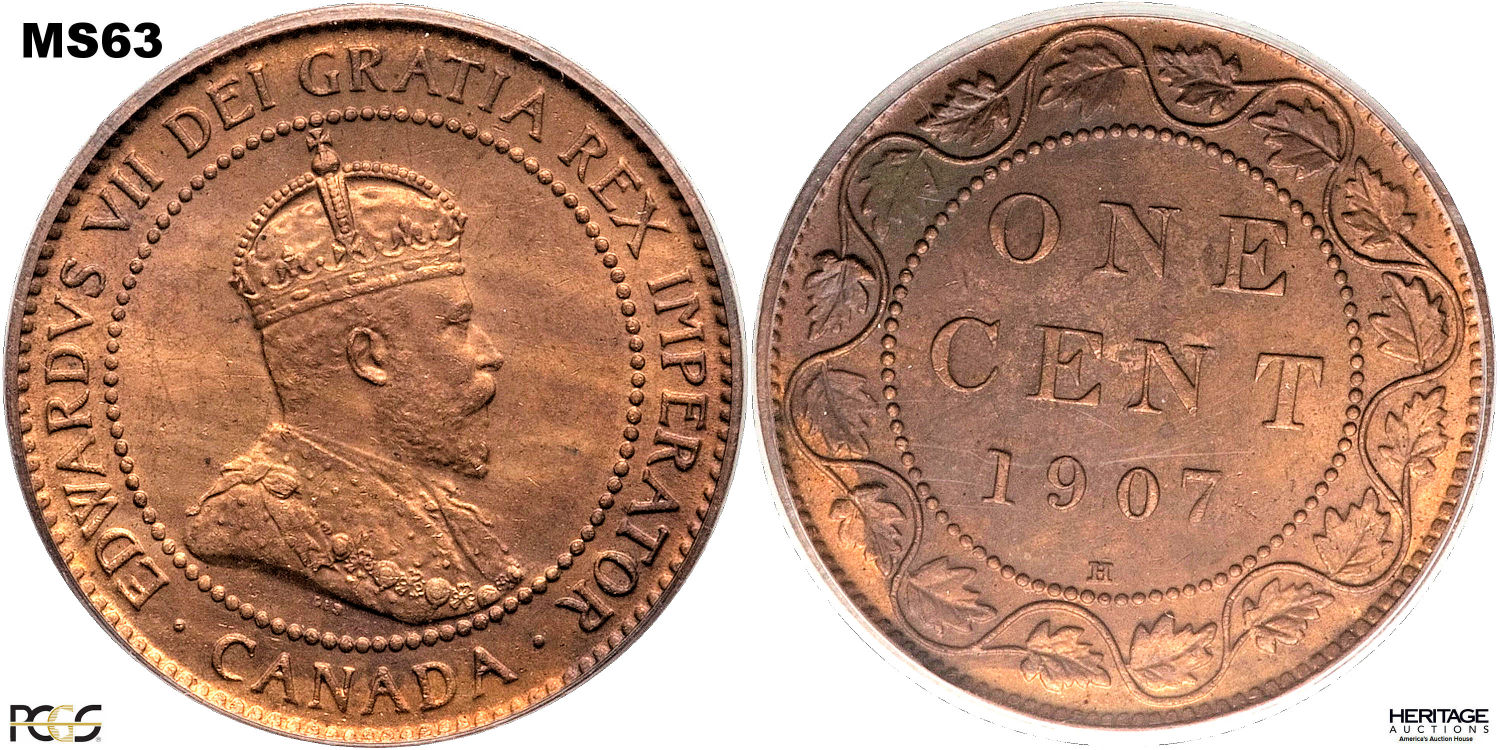 This page describes the criteria used to assign grades to 1 cent Canadian circulation coins issued between 1902 and 1910, which use the portrait of King Edward VII. It also shows sample images of each grade. All photos used here were taken of coins that have been professionally graded by companies like PCGS, NGC, ICCS, CCCS, ANACS, or ICG. NOTE: Click on any photo to load a much larger version of both the obverse and reverse sides of the graded coin. Once that photo has loaded on screen, if you click it again you will see a huge photo which allows you to see every fine detail. |