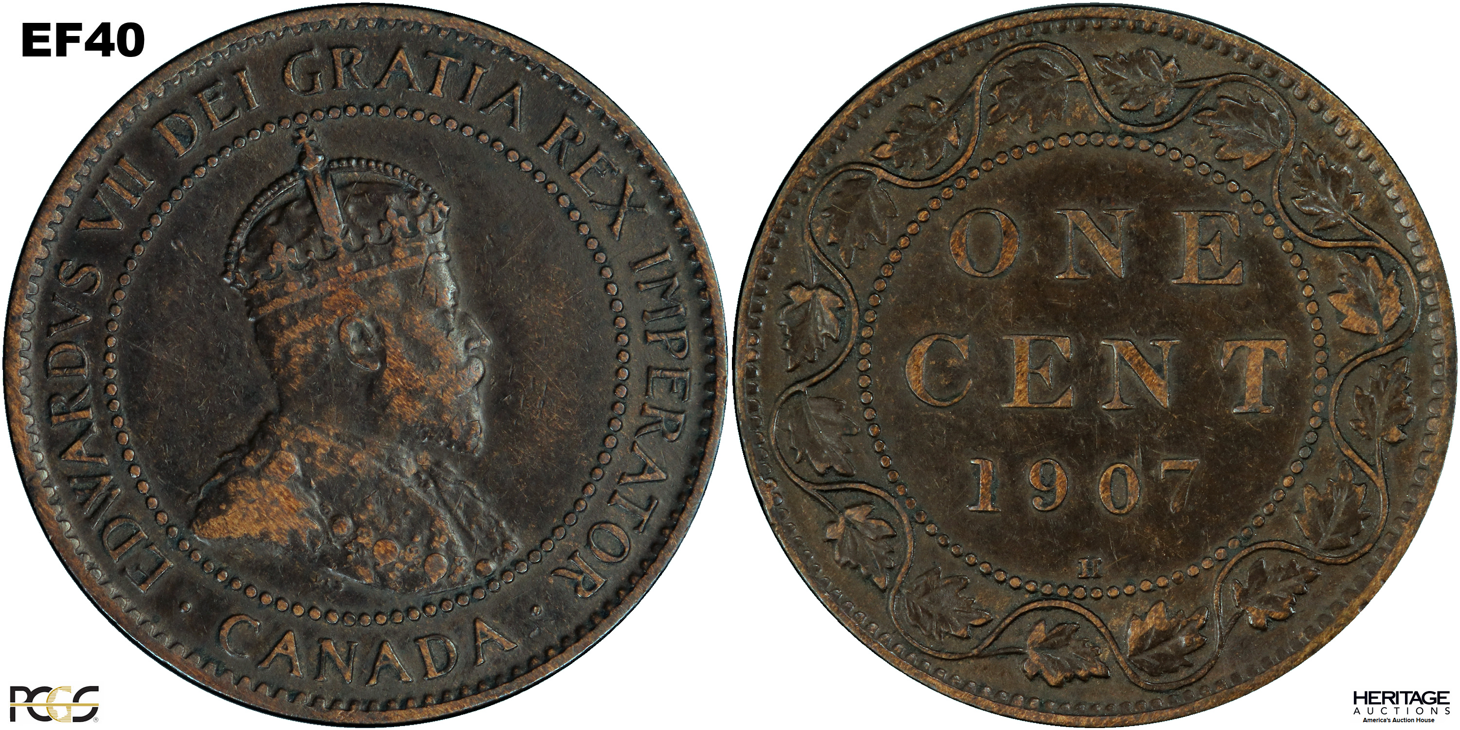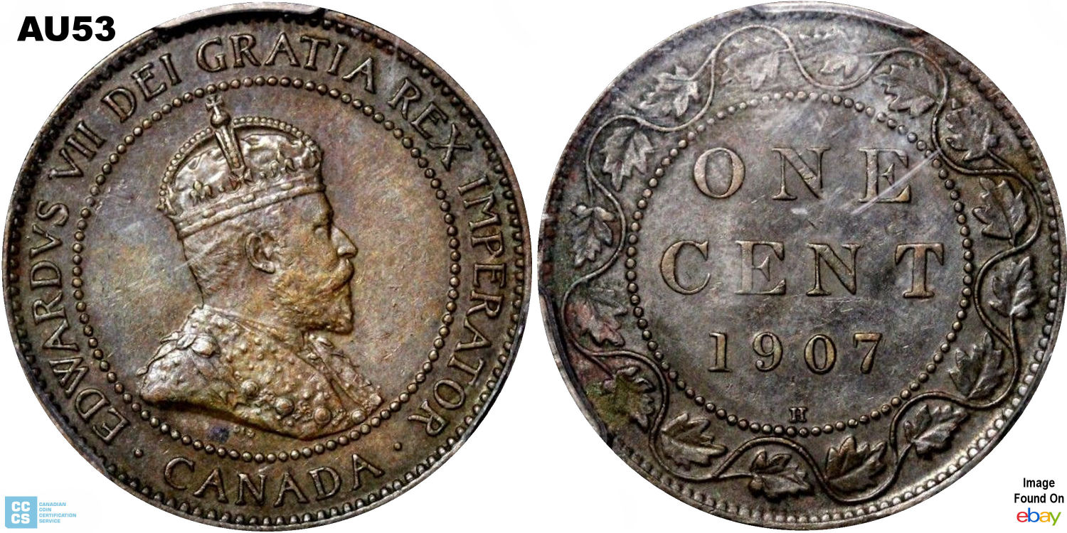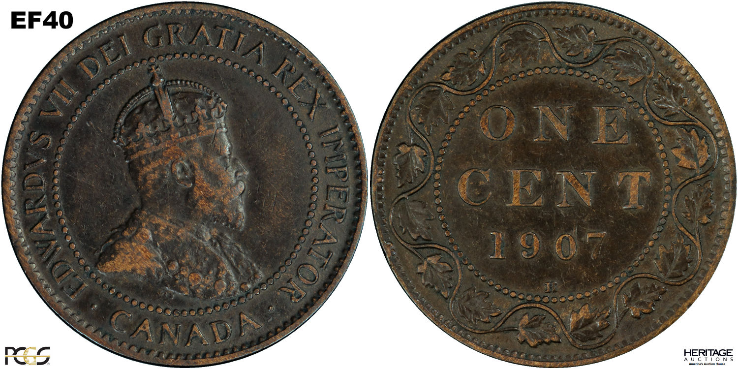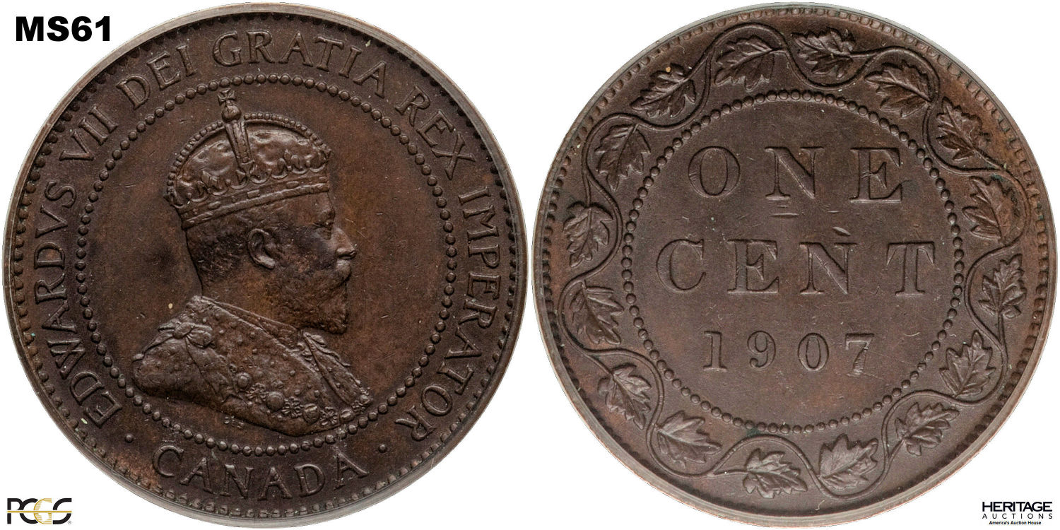 This page describes the criteria used to assign grades to 1 cent Canadian circulation coins issued between 1902 and 1910, which use the portrait of King Edward VII. It also shows sample images of each grade. All photos used here were taken of coins that have been professionally graded by companies like PCGS, NGC, ICCS, CCCS, ANACS, or ICG. NOTE: Click on any photo to load a much larger version of both the obverse and reverse sides of the graded coin. Once that photo has loaded on screen, if you click it again you will see a huge photo which allows you to see every fine detail. |