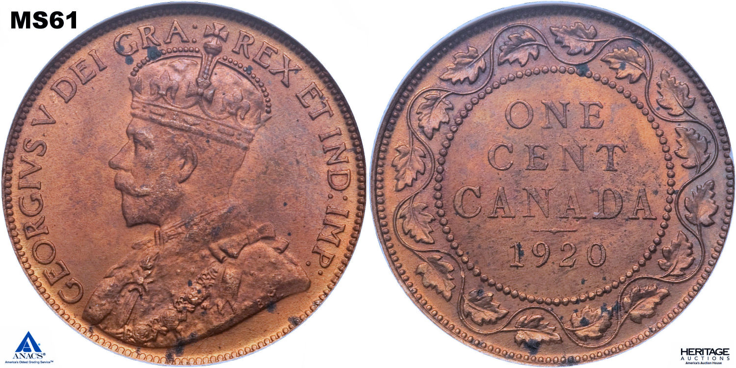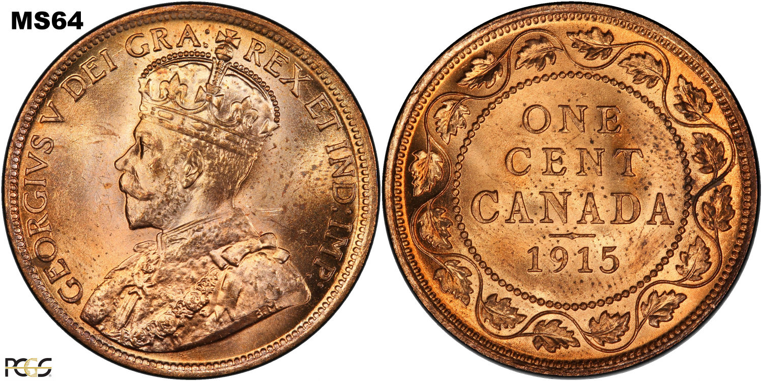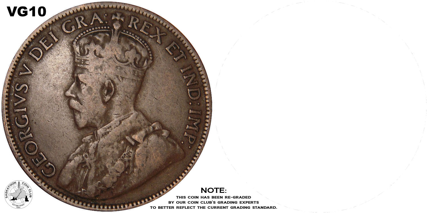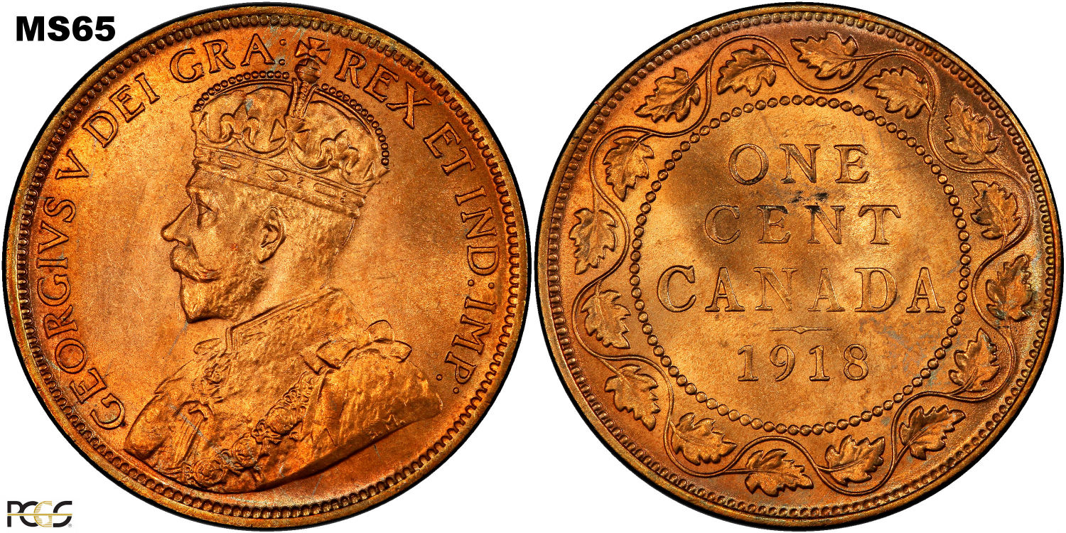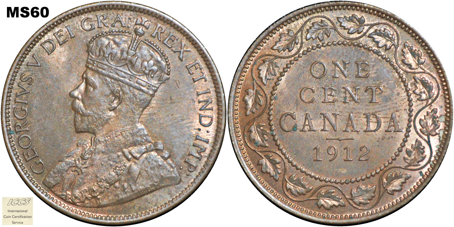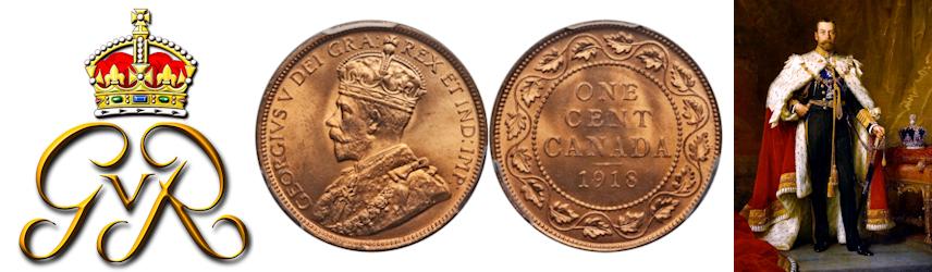 This page describes the criteria used to assign grades to "large cent" 1 cent Canadian circulation coins issued between 1911 and 1920, which use the portrait of King George V. It also shows sample images of each grade. All photos used here were taken of coins that have been professionally graded by companies like PCGS, NGC, ICCS, CCCS, ANACS, or ICG. NOTE: Click on any photo to load a much larger version of both the obverse and reverse sides of the graded coin. Once that photo has loaded on screen, if you click it again you will see a huge photo which allows you to see every fine detail. |