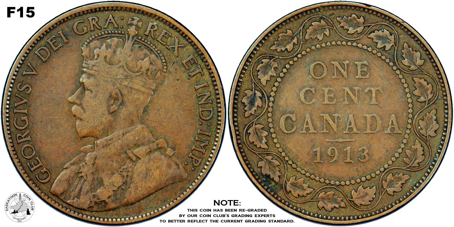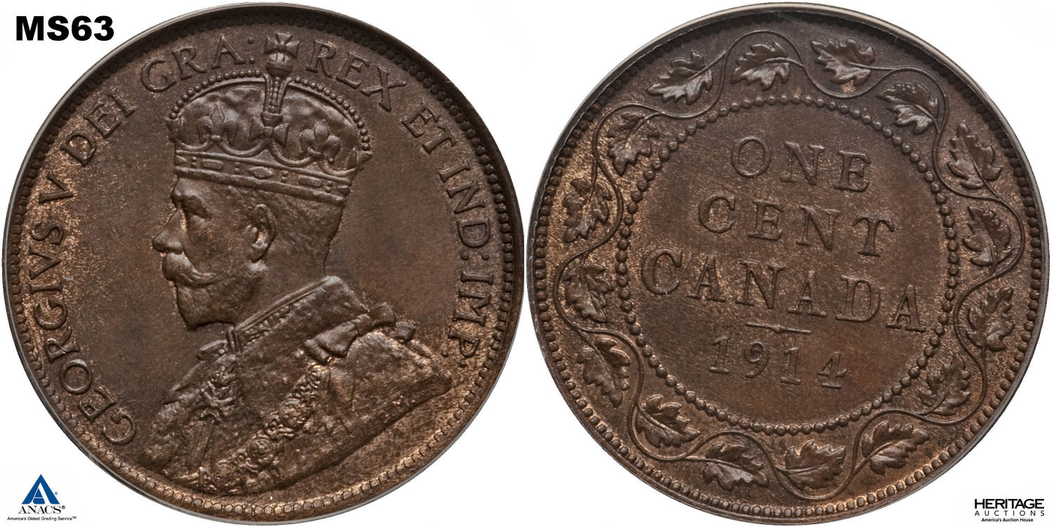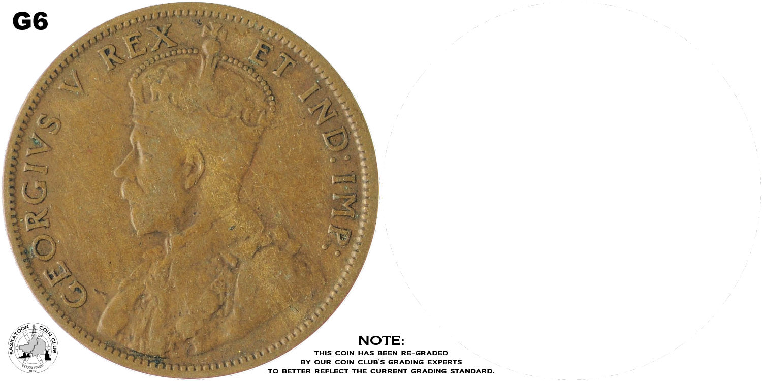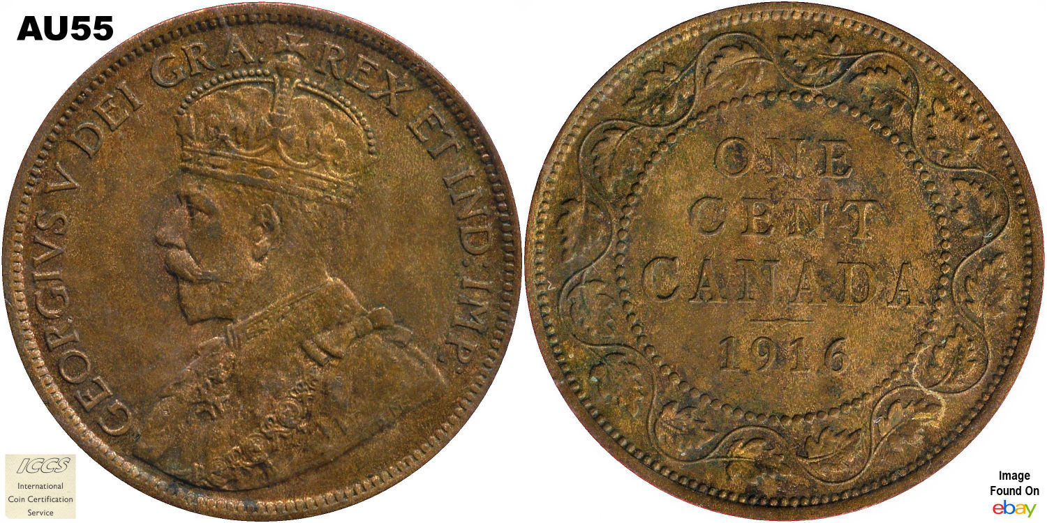 This page describes the criteria used to assign grades to "large cent" 1 cent Canadian circulation coins issued between 1911 and 1920, which use the portrait of King George V. It also shows sample images of each grade. All photos used here were taken of coins that have been professionally graded by companies like PCGS, NGC, ICCS, CCCS, ANACS, or ICG. NOTE: Click on any photo to load a much larger version of both the obverse and reverse sides of the graded coin. Once that photo has loaded on screen, if you click it again you will see a huge photo which allows you to see every fine detail. |