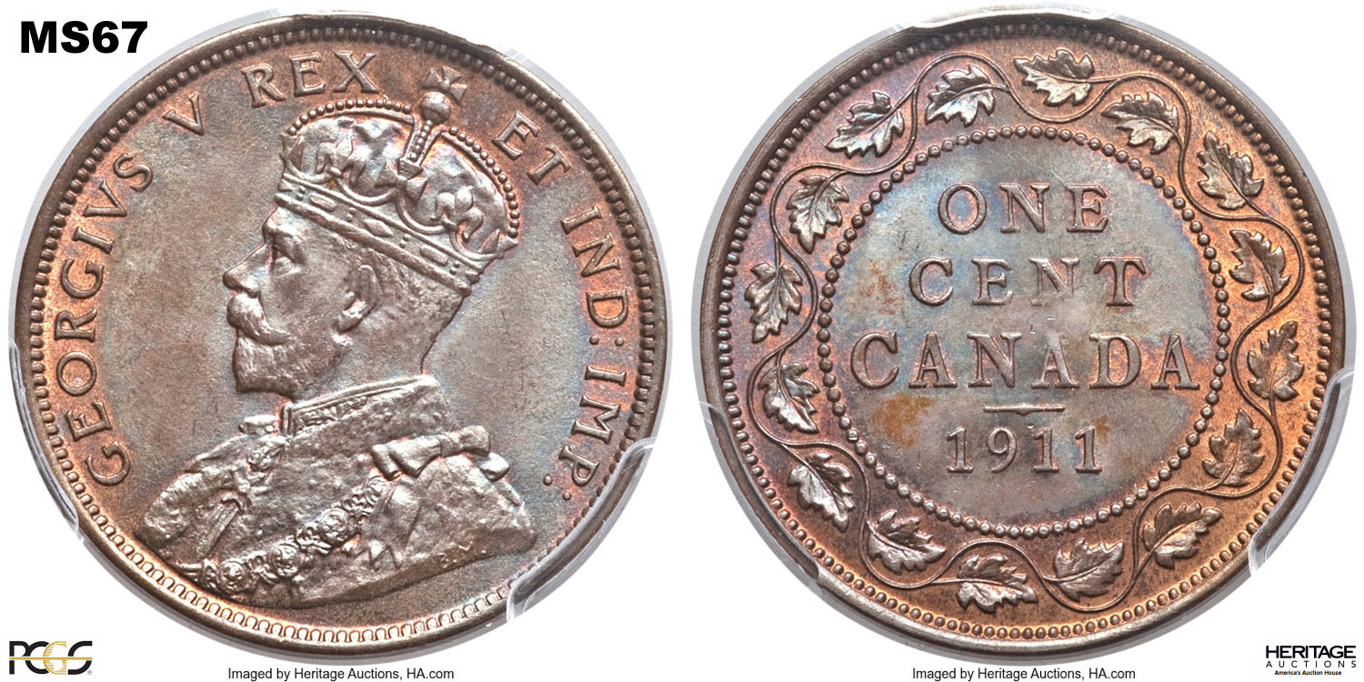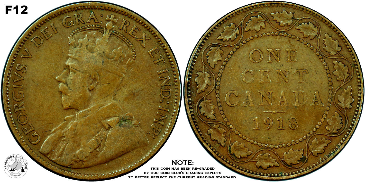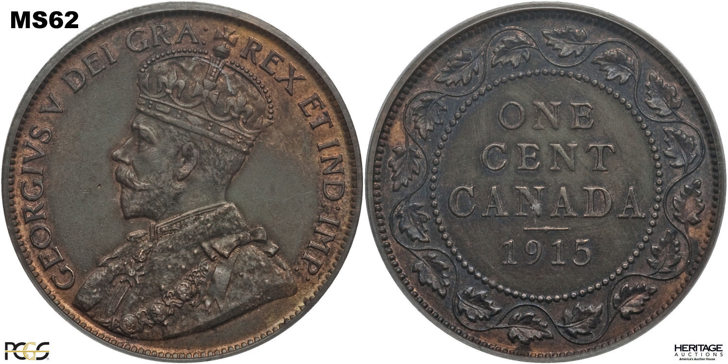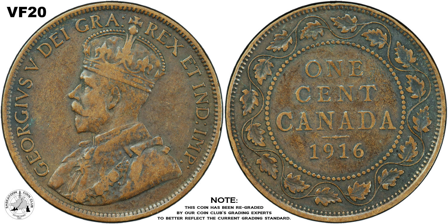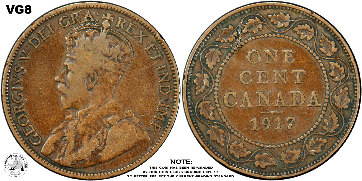 This page describes the criteria used to assign grades to "large cent" 1 cent Canadian circulation coins issued between 1911 and 1920, which use the portrait of King George V. It also shows sample images of each grade. All photos used here were taken of coins that have been professionally graded by companies like PCGS, NGC, ICCS, CCCS, ANACS, or ICG. NOTE: Click on any photo to load a much larger version of both the obverse and reverse sides of the graded coin. Once that photo has loaded on screen, if you click it again you will see a huge photo which allows you to see every fine detail. |