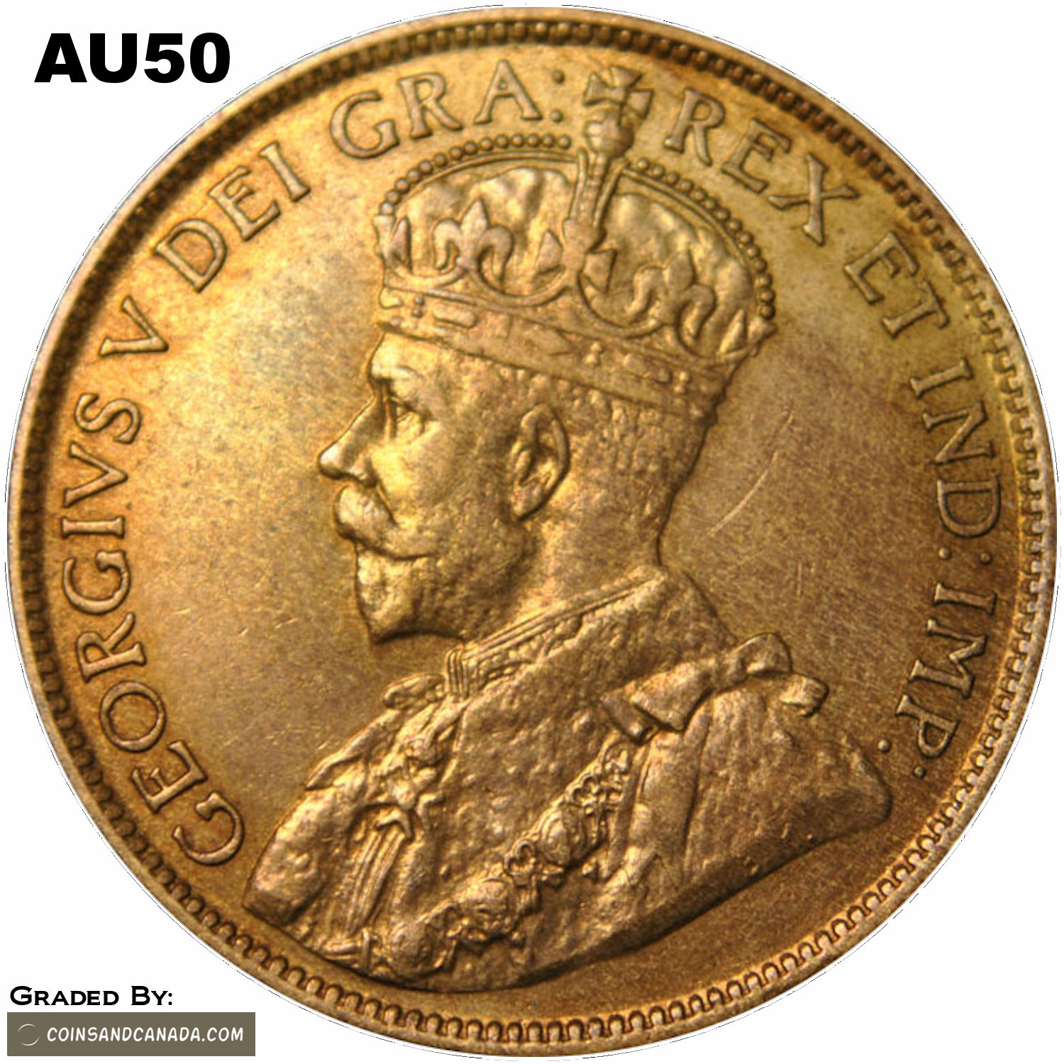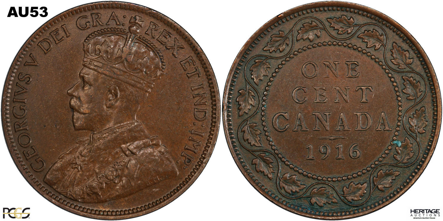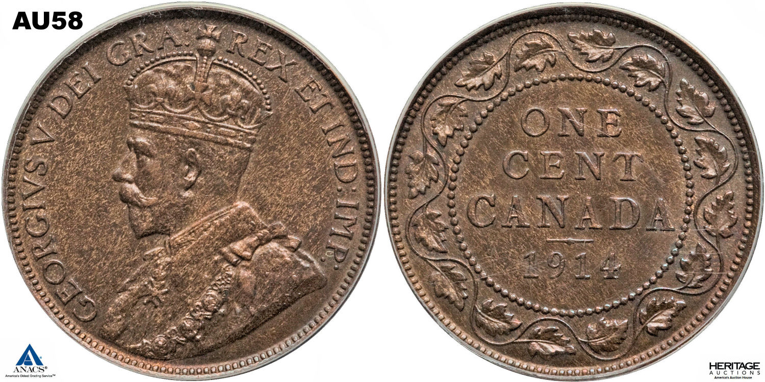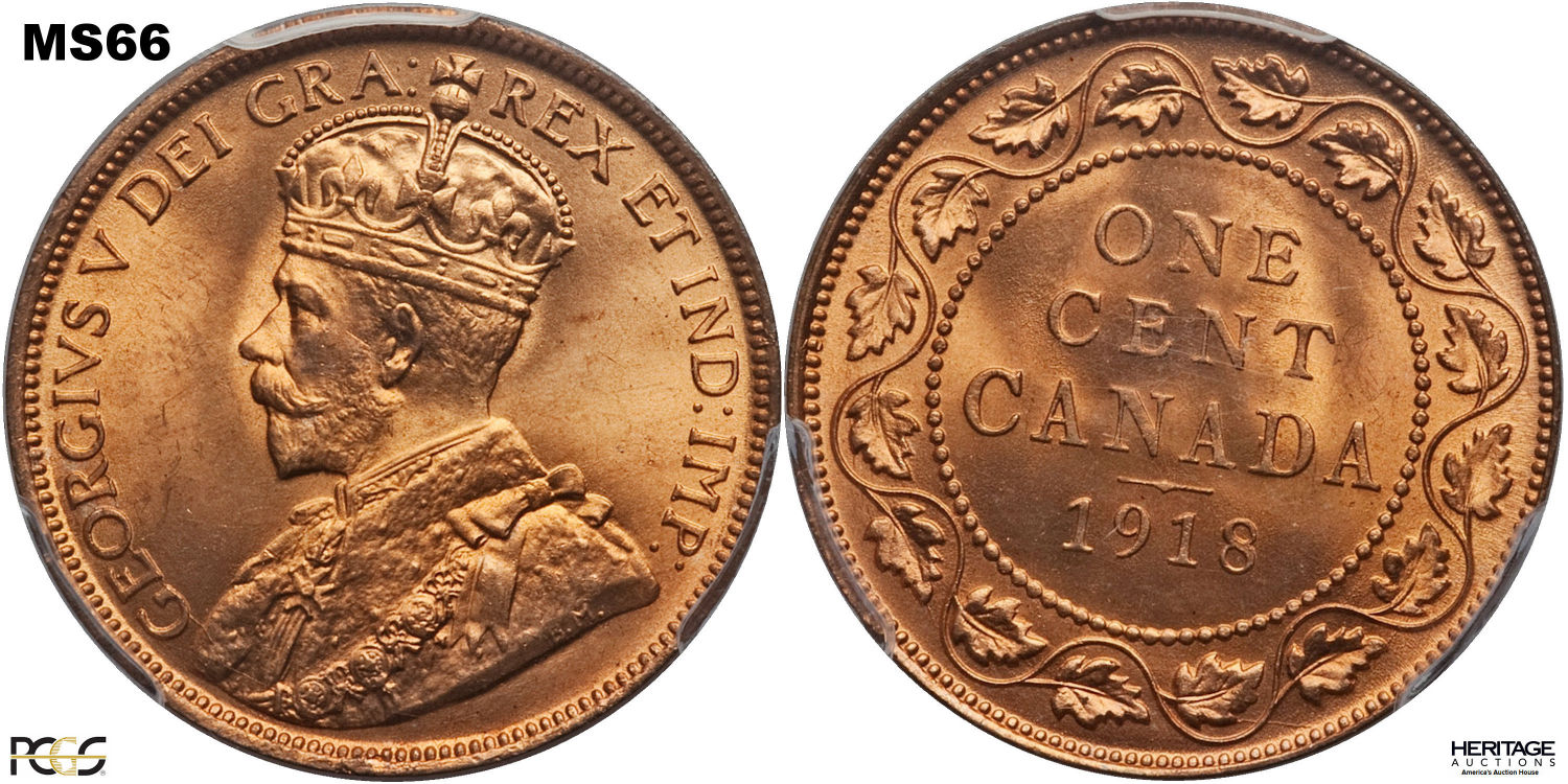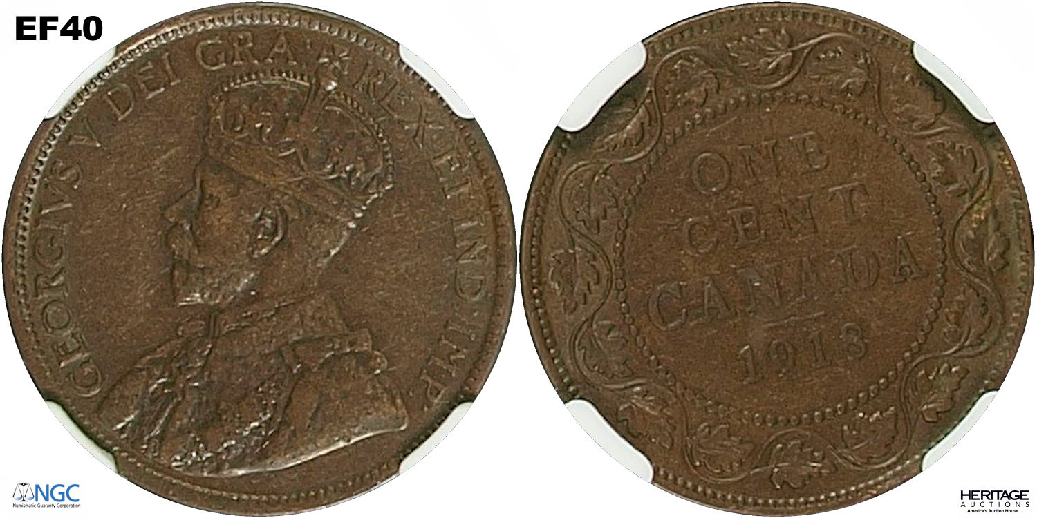 This page describes the criteria used to assign grades to "large cent" 1 cent Canadian circulation coins issued between 1911 and 1920, which use the portrait of King George V. It also shows sample images of each grade. All photos used here were taken of coins that have been professionally graded by companies like PCGS, NGC, ICCS, CCCS, ANACS, or ICG. NOTE: Click on any photo to load a much larger version of both the obverse and reverse sides of the graded coin. Once that photo has loaded on screen, if you click it again you will see a huge photo which allows you to see every fine detail. |